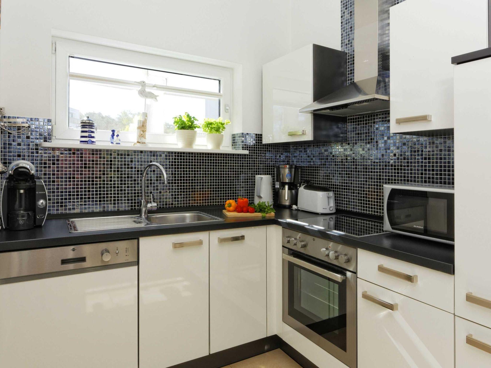 • offene Einbauküche mit Geschirrspüler, Herd mit Backofen (Grillfunktion), Tiefkühlschrank, Kühlschrank, Kaffeemaschine, Toaster und Wasserkocher