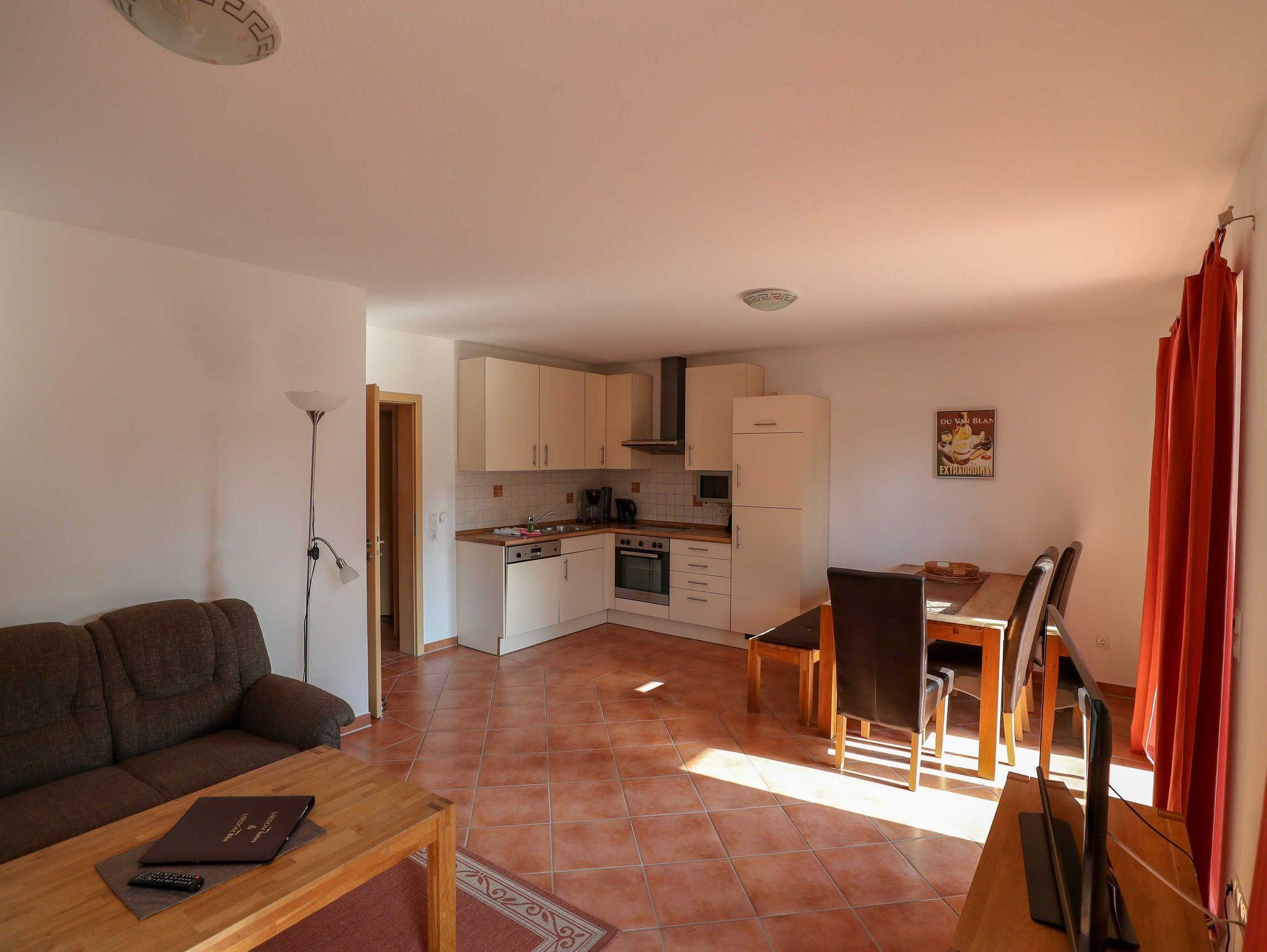 Im Wohnzimmer steht eine gemutliche Doppel-Couch, in diesem Raum ist eine vollausgestattetet Küche und ein Esszimmertisch für vier Personen integriert.