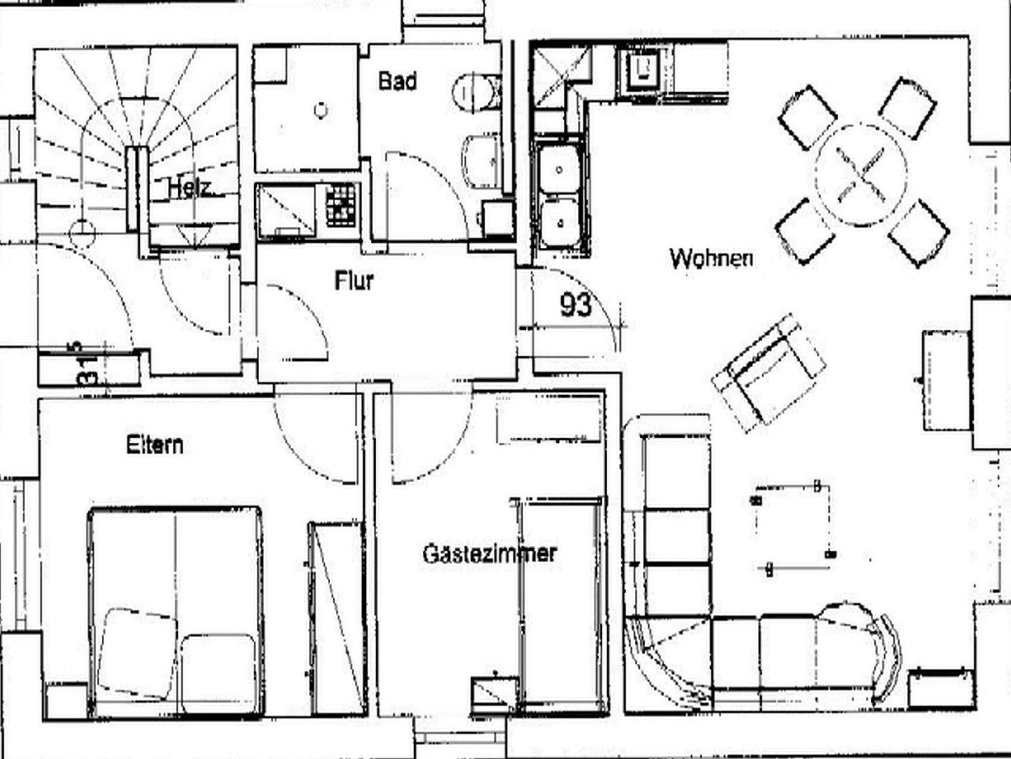 Im Wohnzimmer steht eine gemutliche Doppel-Couch, in diesem Raum ist eine vollausgestattetet Küche (mit Mikrowelle) und einem Esszimmertisch für vier Personen integriert.