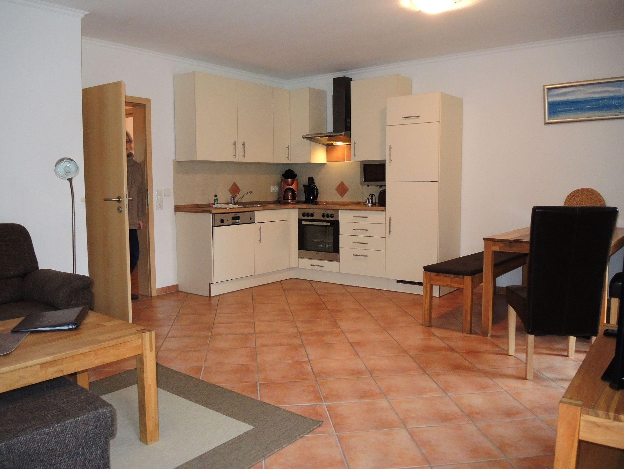 Direkt am Wohnzimmer liegt der Balkon. Im Wohnzimmer befinden sich ein großes Sofa, eine Essecke sowie eine Pantryküche (mit Mikrowelle). Das Bad ist mit Dusche und Handtuchheizkörper ausgestattet.