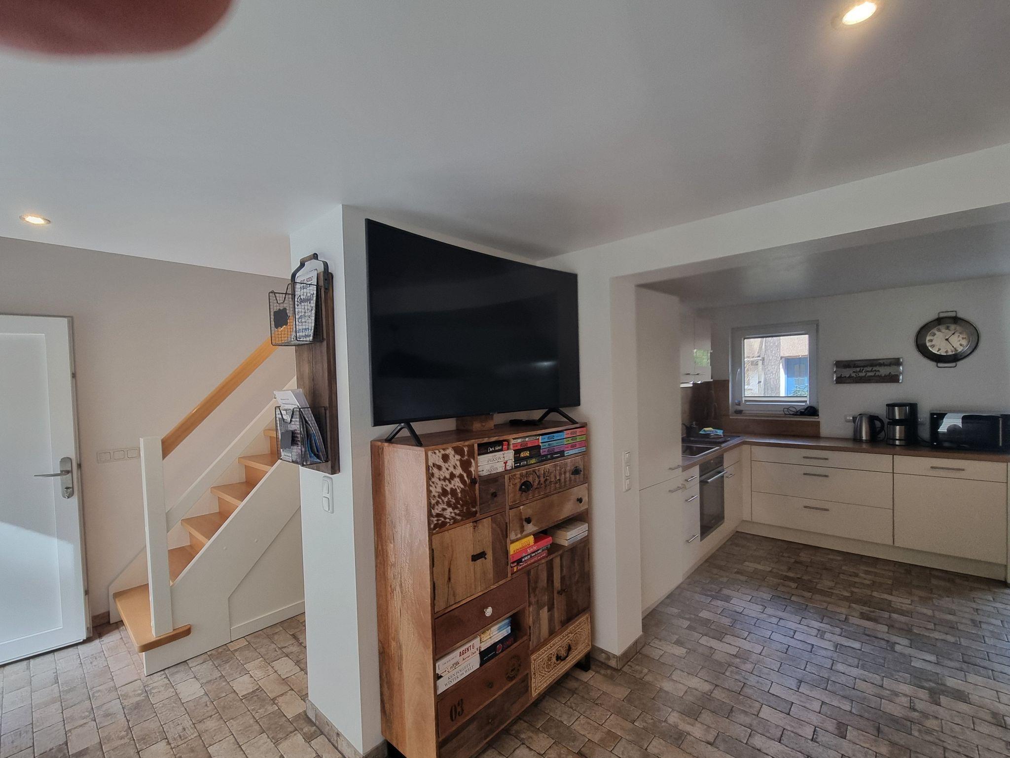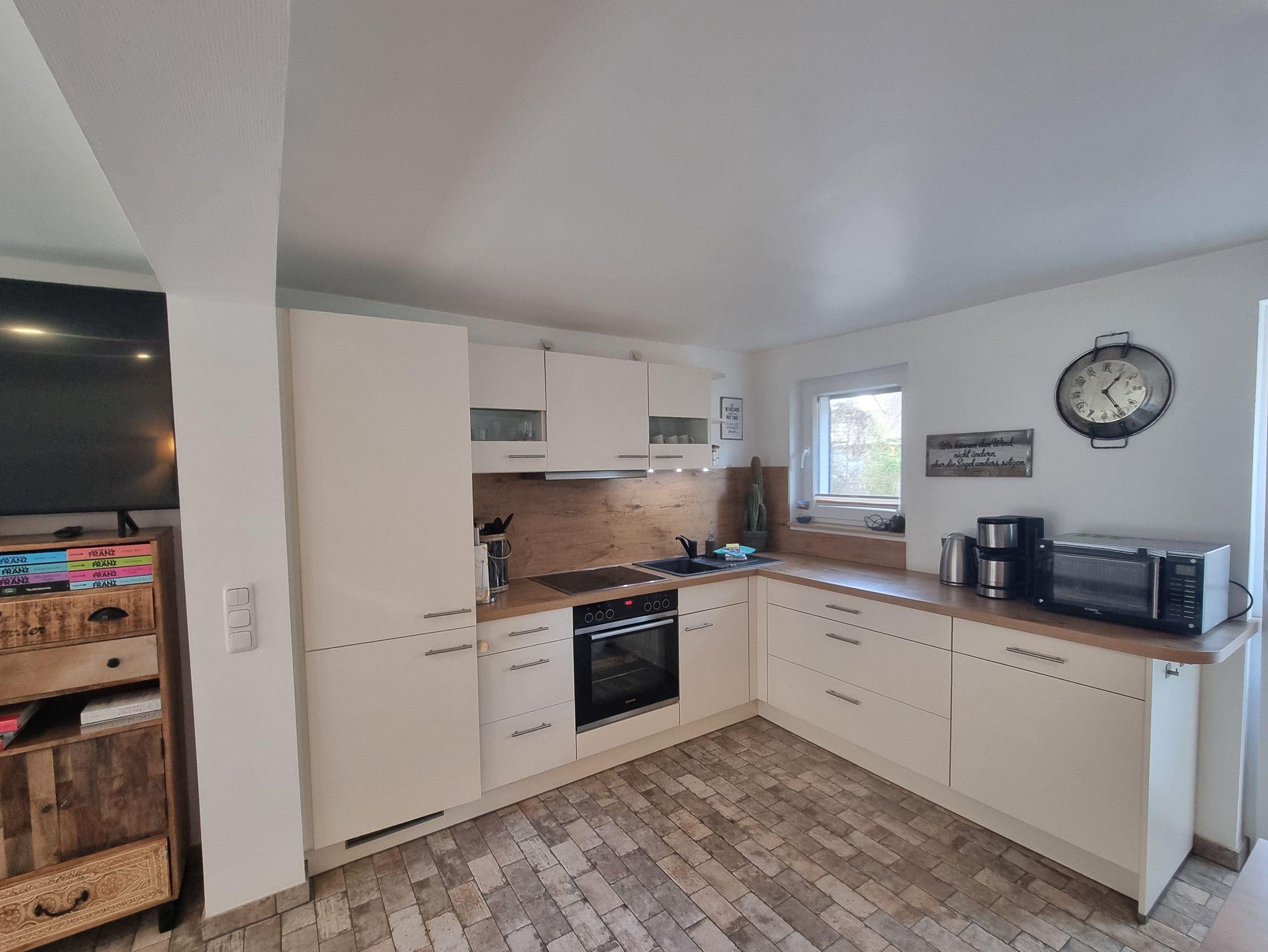Genießen Sie entspannte Tage in unserem lichtdurchfluteten Ferienhaus. Das Herzstück im Erdgeschoss ist der offene Wohn-, Ess- und Küchenbereich. Ob gemütliche Stunden auf der Relax-Couch vor dem Smart-TV, ein Spieleabend oder Zeit zum Schmökern in unserer kleinen Bibliothek ? hier ist für alles gesorgt. Die voll ausgestattete Küche (inkl. Geschirrspüler & Gefrierkombi) lässt keine Wünsche offen. Ebenfalls im EG: Das große Badezimmer mit Dusche.