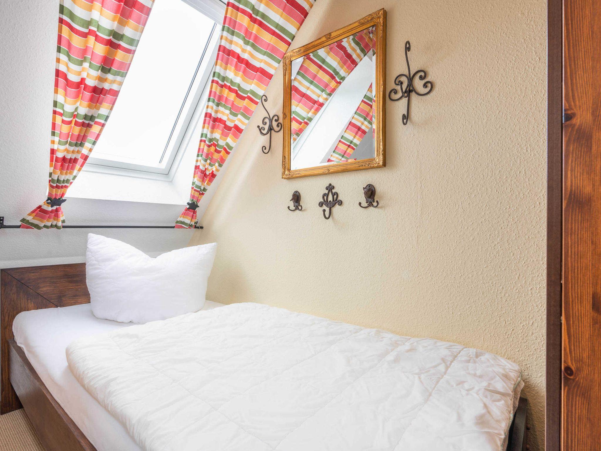 2-Raum-Maisonette-Wohnung mit 1 Schlafzimmer mit Doppelbett und 1 Einzelbett.