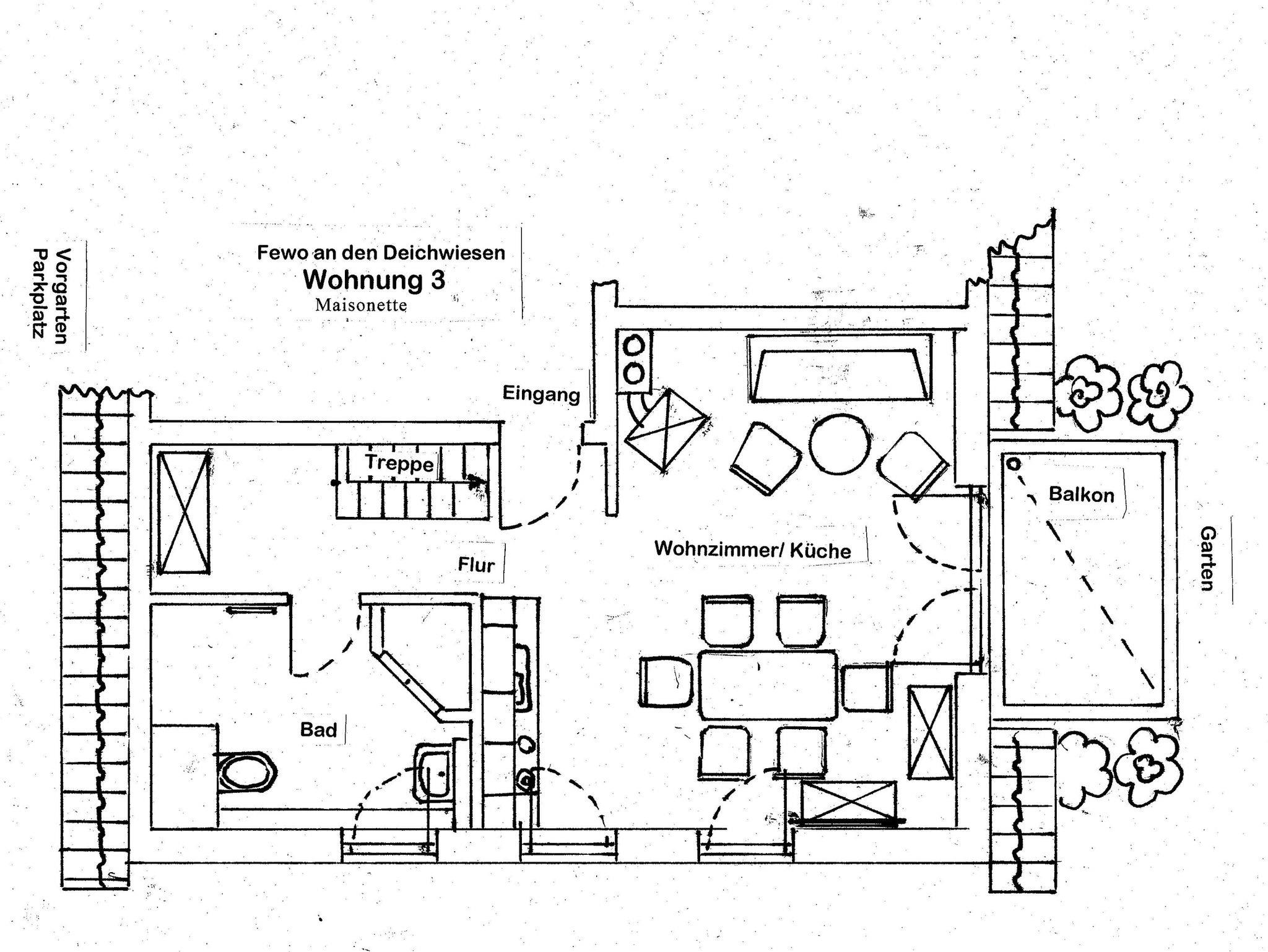 Die 2-Raum-Ferienwohnungen 01,02,05 und 06 befinden sich im Erdgeschoss und verfügen alle über eine Terrasse zum Garten.