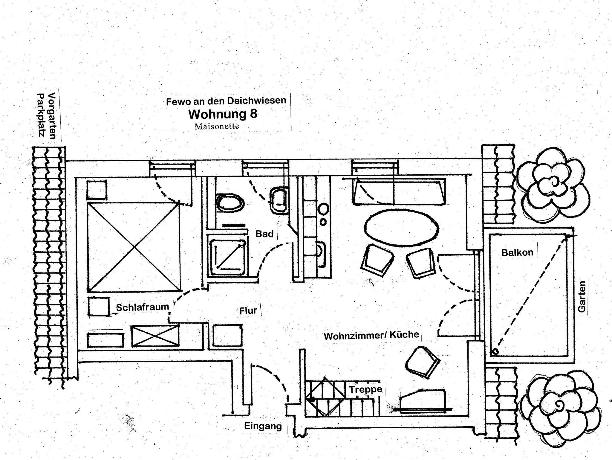 Die 2-Raum-Ferienwohnungen 01,02,05 und 06 befinden sich im Erdgeschoss und verfügen alle über eine Terrasse zum Garten.