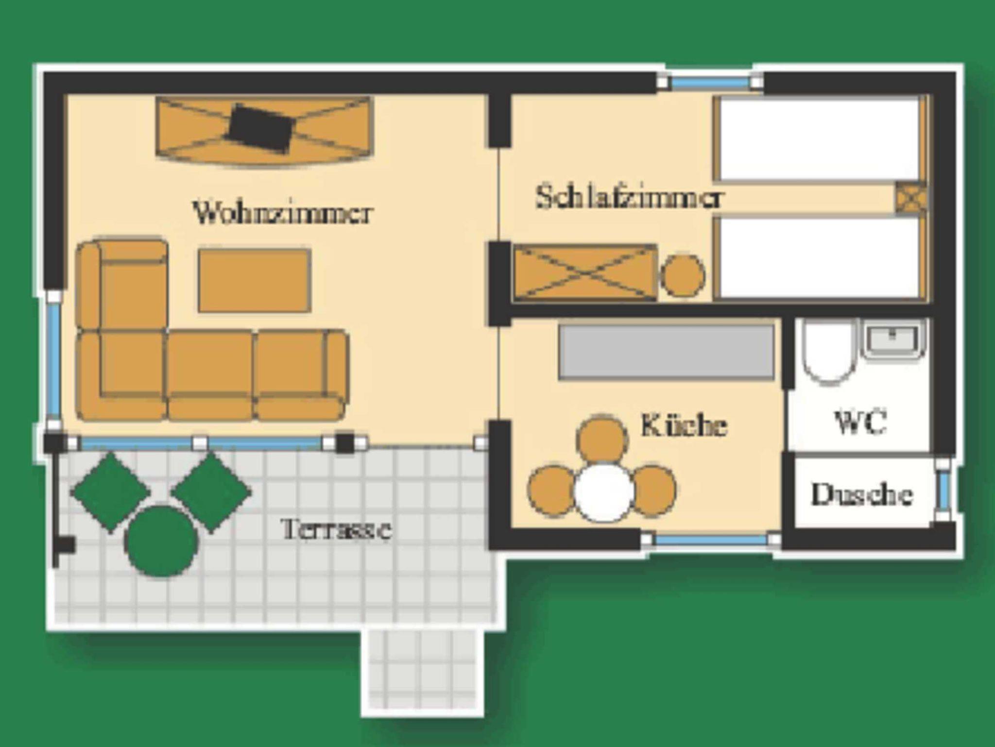 Sie wohnen in einem komplett ausgestattetem 35 m² großem Ferienhaus mit hellen Möbeln. Das Ferienhaus ist für 4 Personen ausgelegt und ausgestattet mit: 1 Wohnraum mit Radio, TV, 1 Schlafzimmer mit 2 Einzelbetten 2 Aufbettungen im Wohnraum 1 Küche Dusche/WC Möblierte Terrasse, Liegewiese Parkplatz am Haus