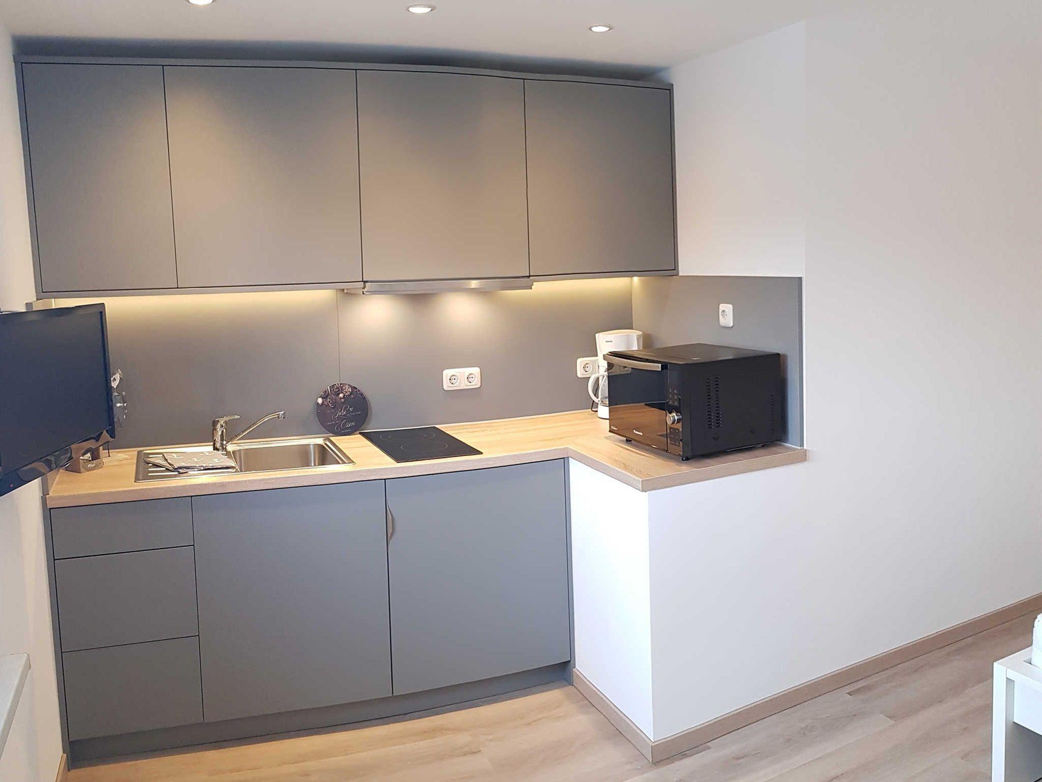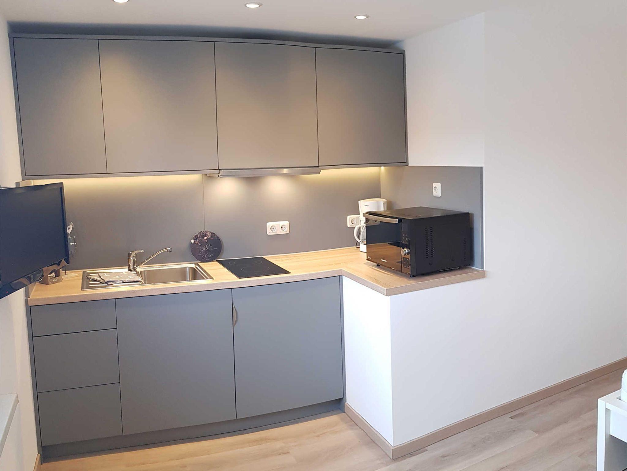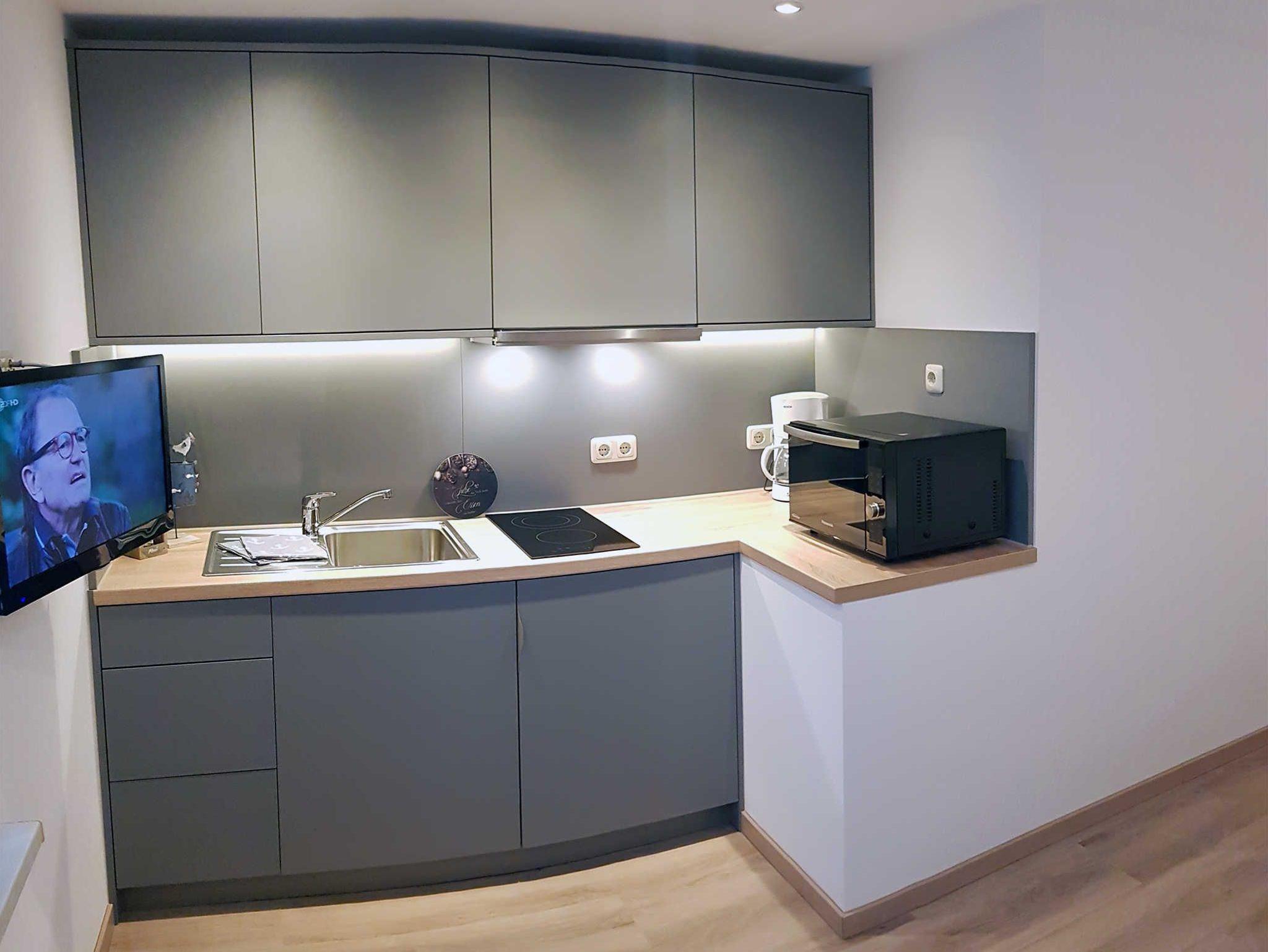 In der kleinen Küchenzeile finden Sie eine Mikrowelle, einen Toaster, eine Kaffeemaschine und einen Wasserkocher, um einfache Mahlzeiten zuzubereiten.