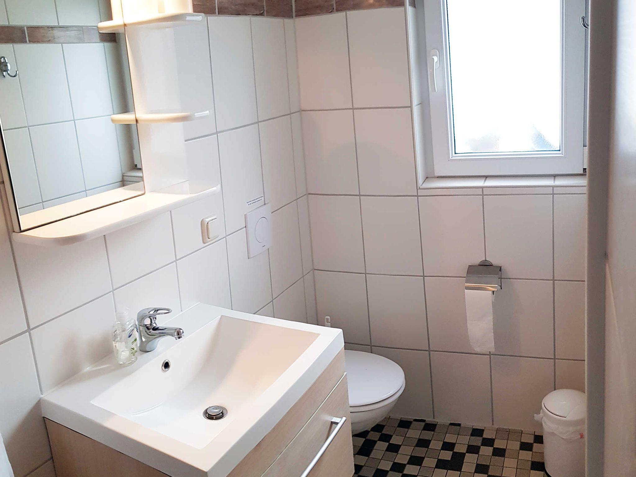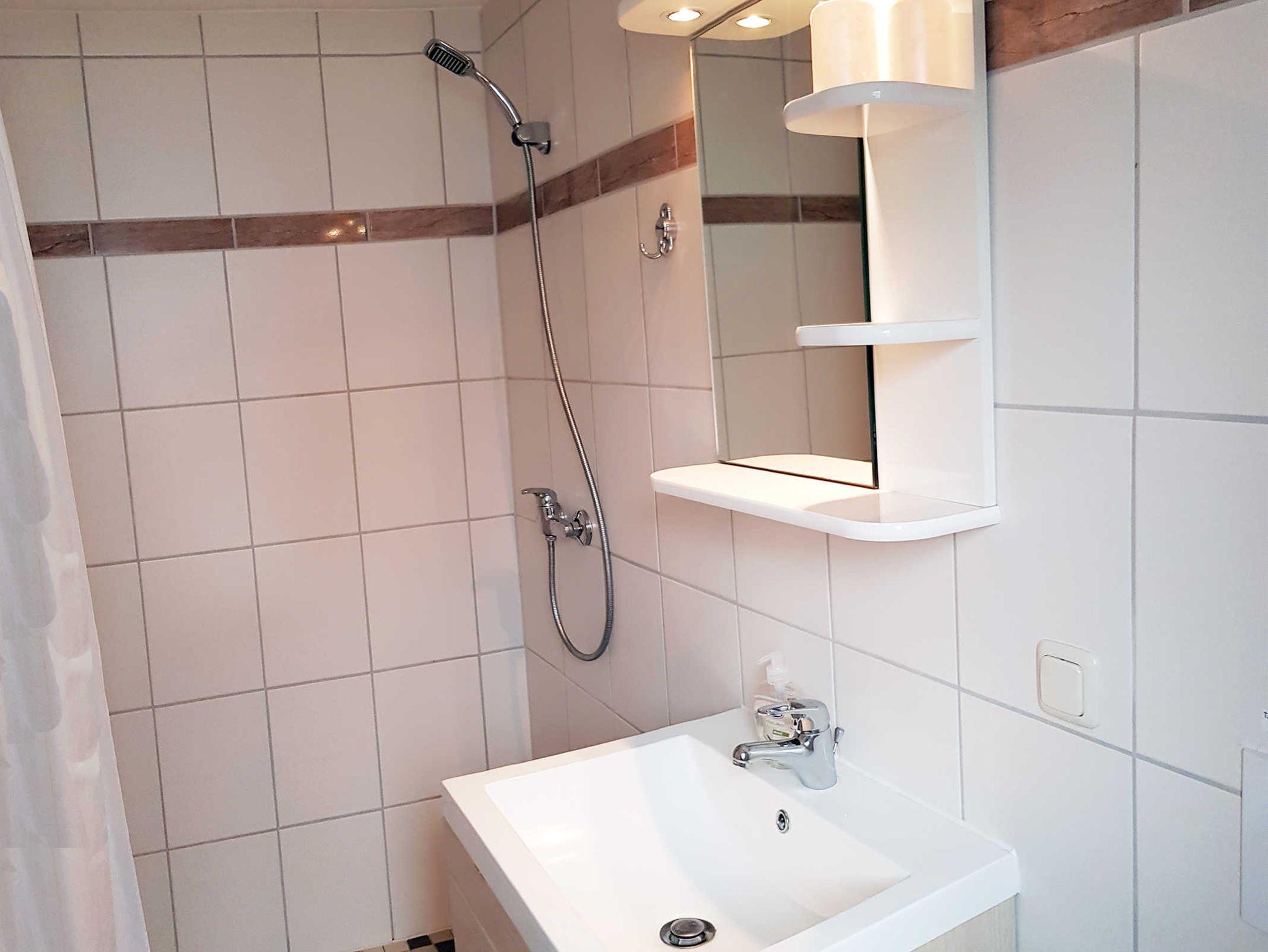 Das Bad mit WC und Dusche befindet sich im Erdgeschoss der Ferienwohnung.