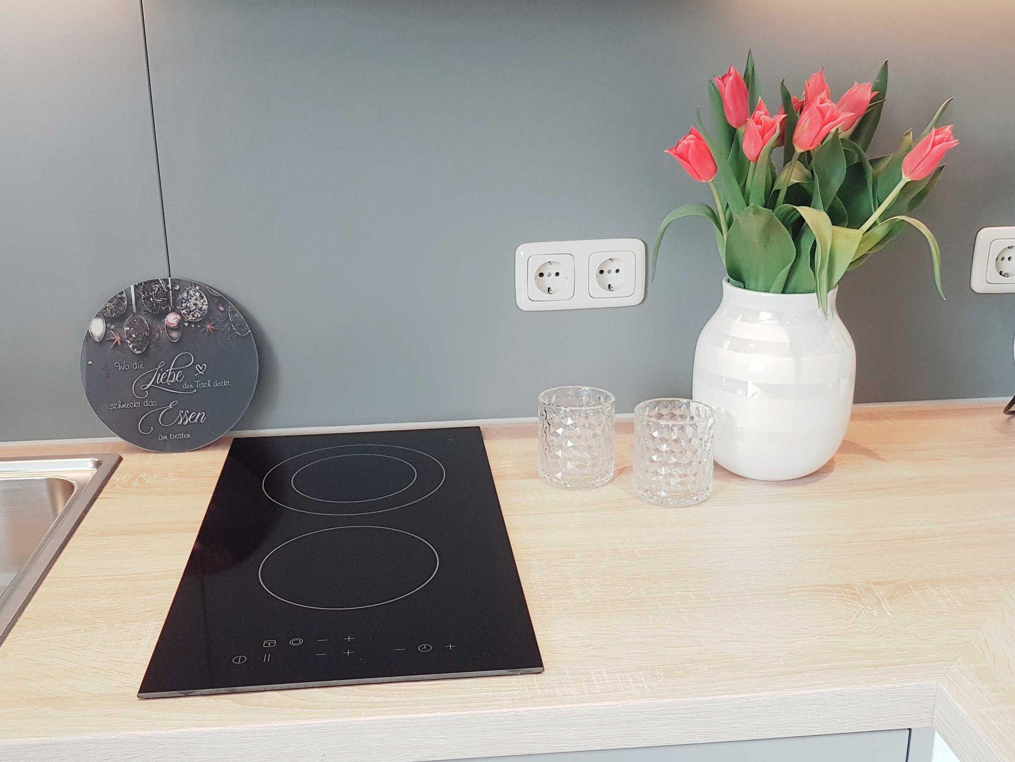 In der kleinen Küchenzeile finden Sie eine Mikrowelle, einen Toaster, eine Kaffeemaschine und einen Wasserkocher, um einfache Mahlzeiten zuzubereiten. Das Bad mit WC befindet sich im Erdgeschoss der Ferienwohnung.