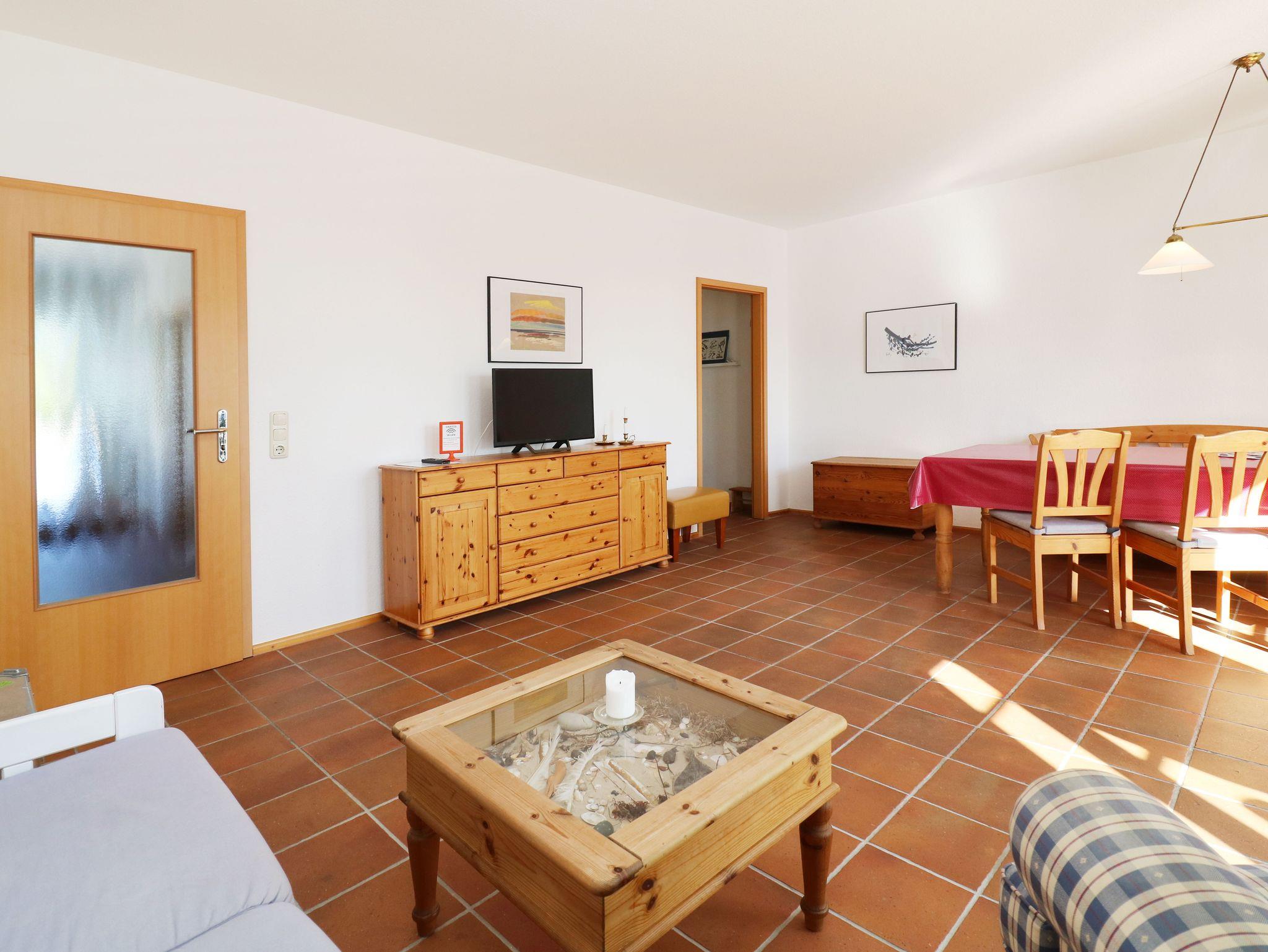 - 1 Wohnzimmer mit Couch, großem Esstisch und TV