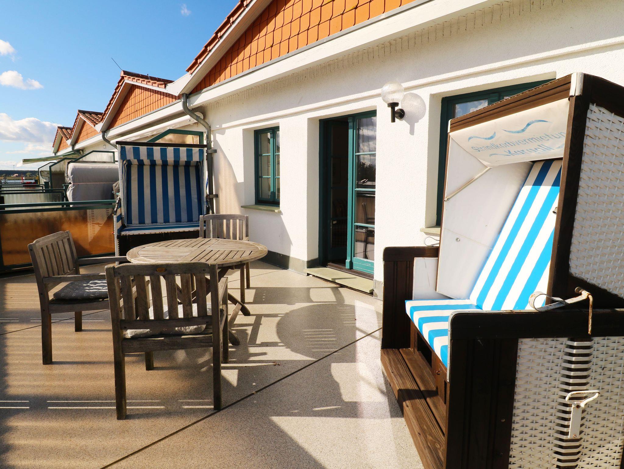 - 1 großzügiger Balkon (20 qm) mit Außenmobiliar, 2 Strandkörbe und Sonnenschirm, in S/W-Lage