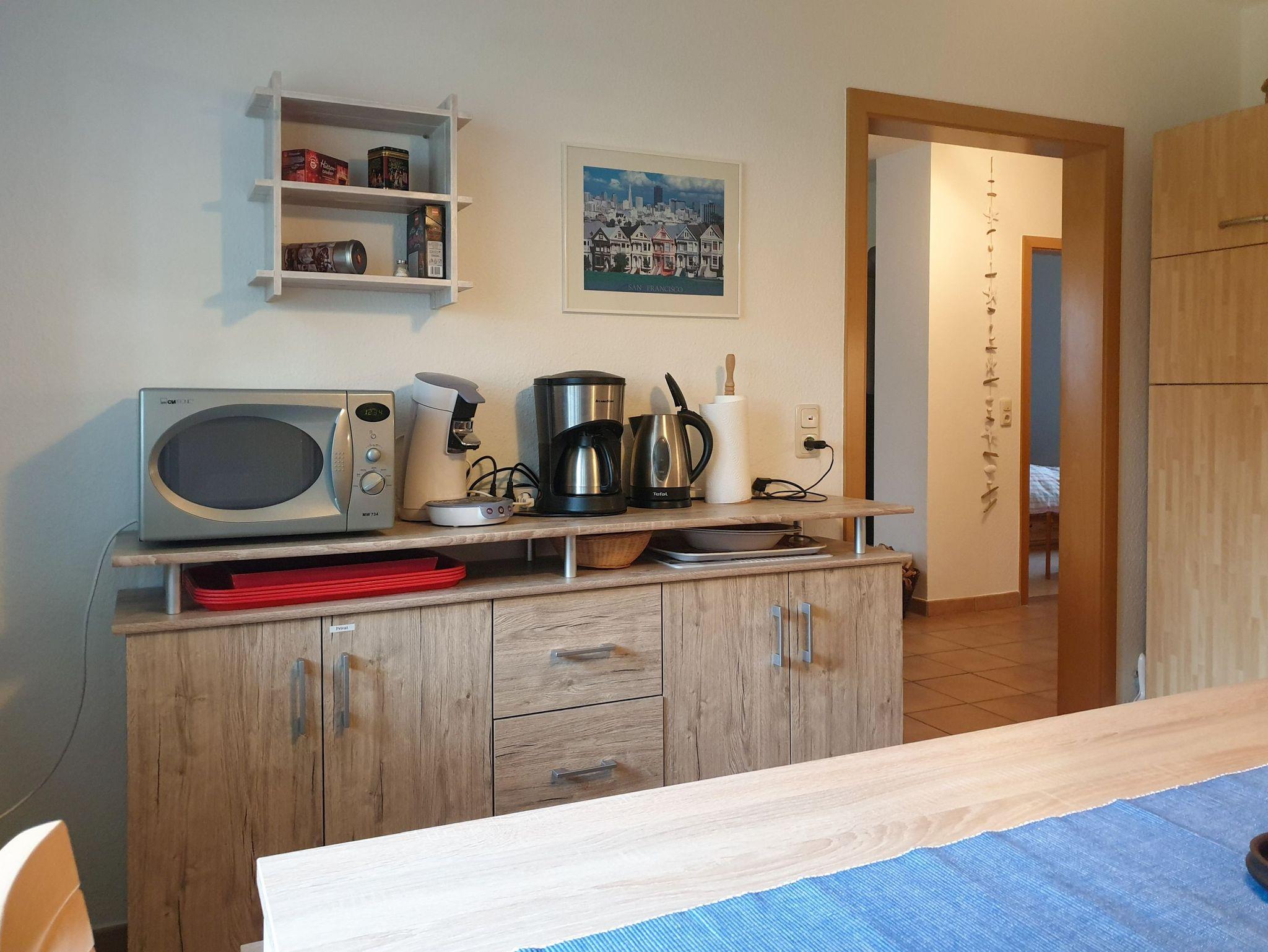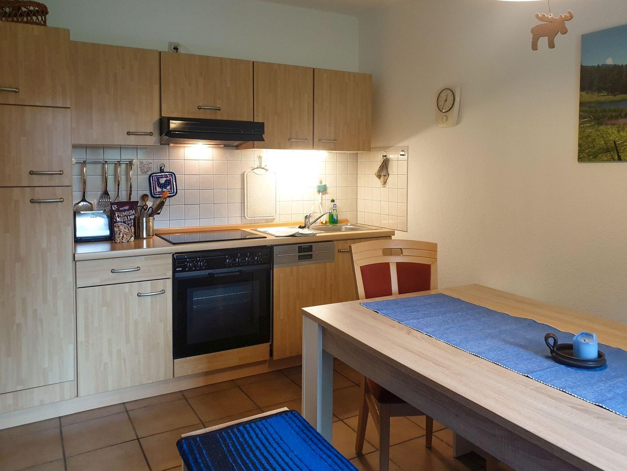 Die großzügige Küche lädt zum gemütlichen Verweilen ein. Sie bietet eine vollständige Einbauküche mit allem, was das Herz begehrt ? Elektroherd, Ceran-Kochfeld mit Dunstabzugshaube, Spülmaschine und ein Kühlschrank mit separatem Gefrierfach. Der Esstisch bietet Platz für bis zu 6 Personen und ist ideal für gesellige Mahlzeiten oder gemeinsame Stunden mit der Familie und Freunden. Außerdem sind eine Mikrowelle, Filterkaffeemaschine, Kaffeepad-Maschine (Senseo), Heißwasserkocher, Toaster und alle nötigen Küchenutensilien vorhanden.