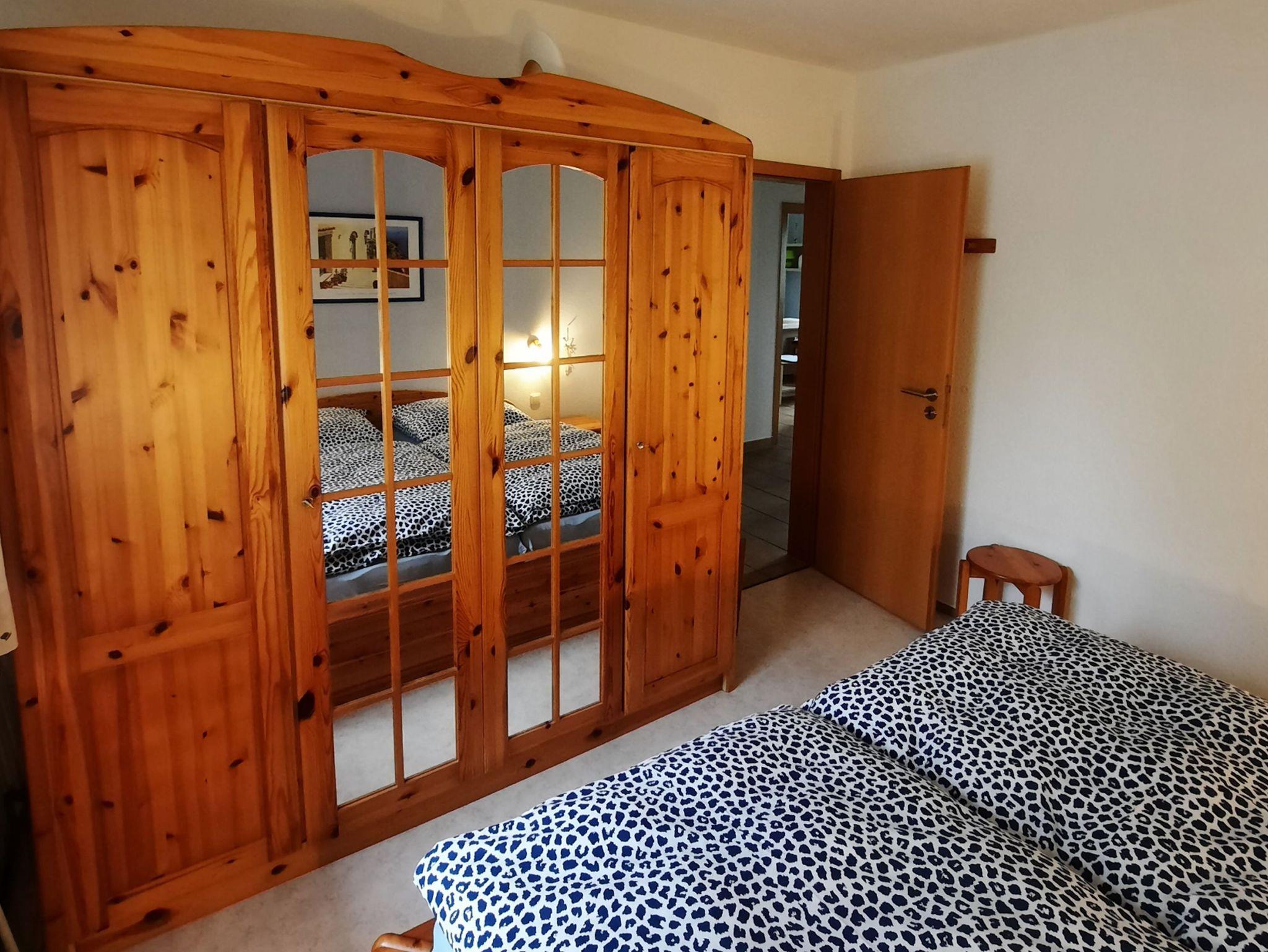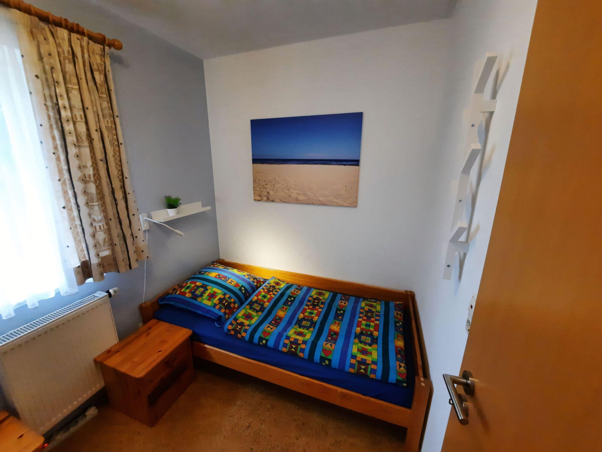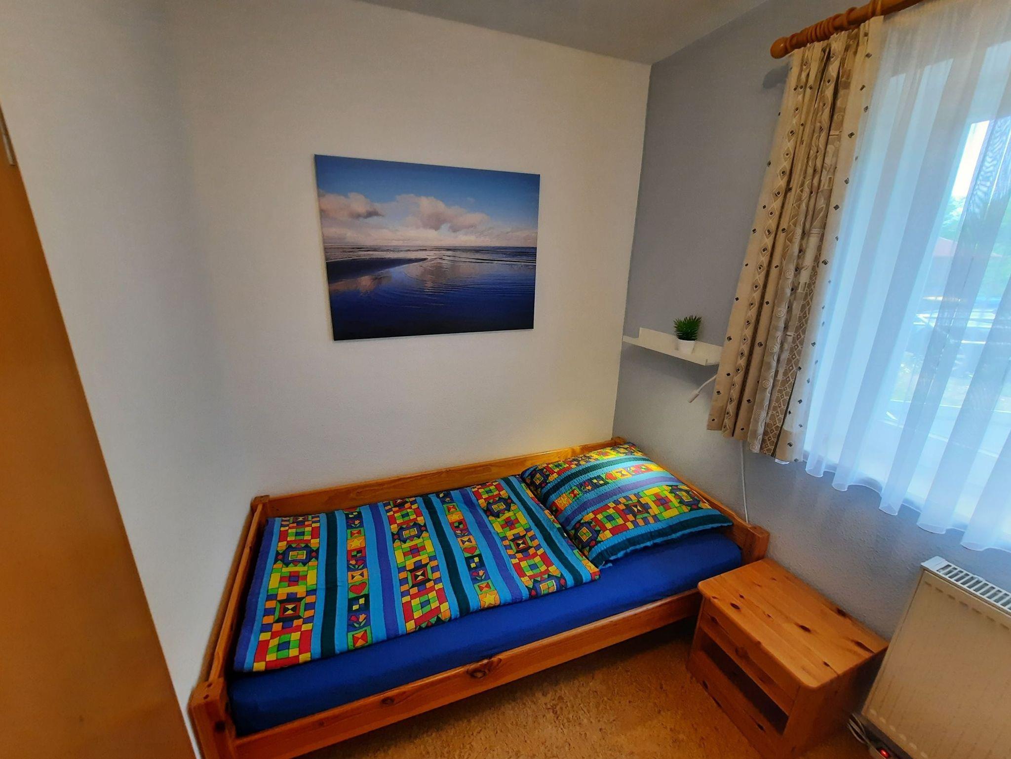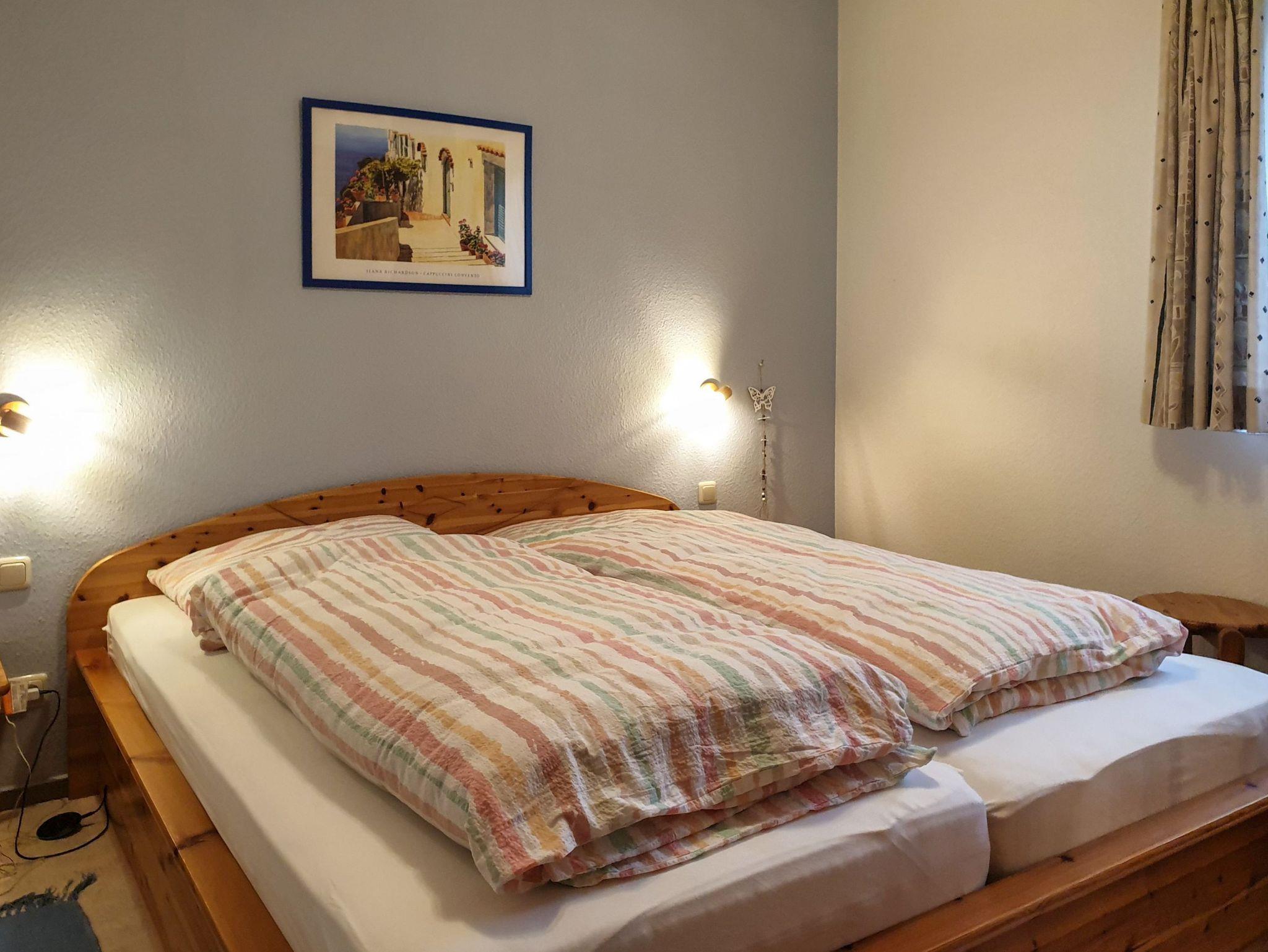 Betreten Sie das Haus über den Windfang, der viel Platz für Ihre Garderobe und Schuhe bietet. Vom Flur direkt geradeaus finden Sie das freundliche kleinere Schlafzimmer mit zwei Einzelbetten (90x195). Links davon erwartet Sie das zweite Schlafzimmer, ausgestattet mit einem komfortablen Doppelbett (180x200, getrennte Matratzen) und einem geräumigen Kleiderschrank, der genügend Stauraum bietet.