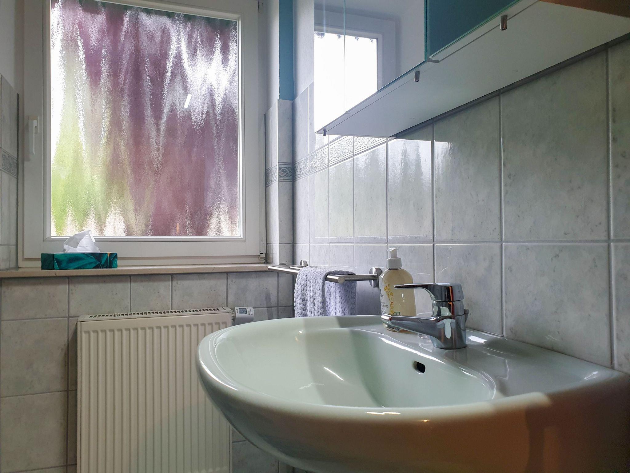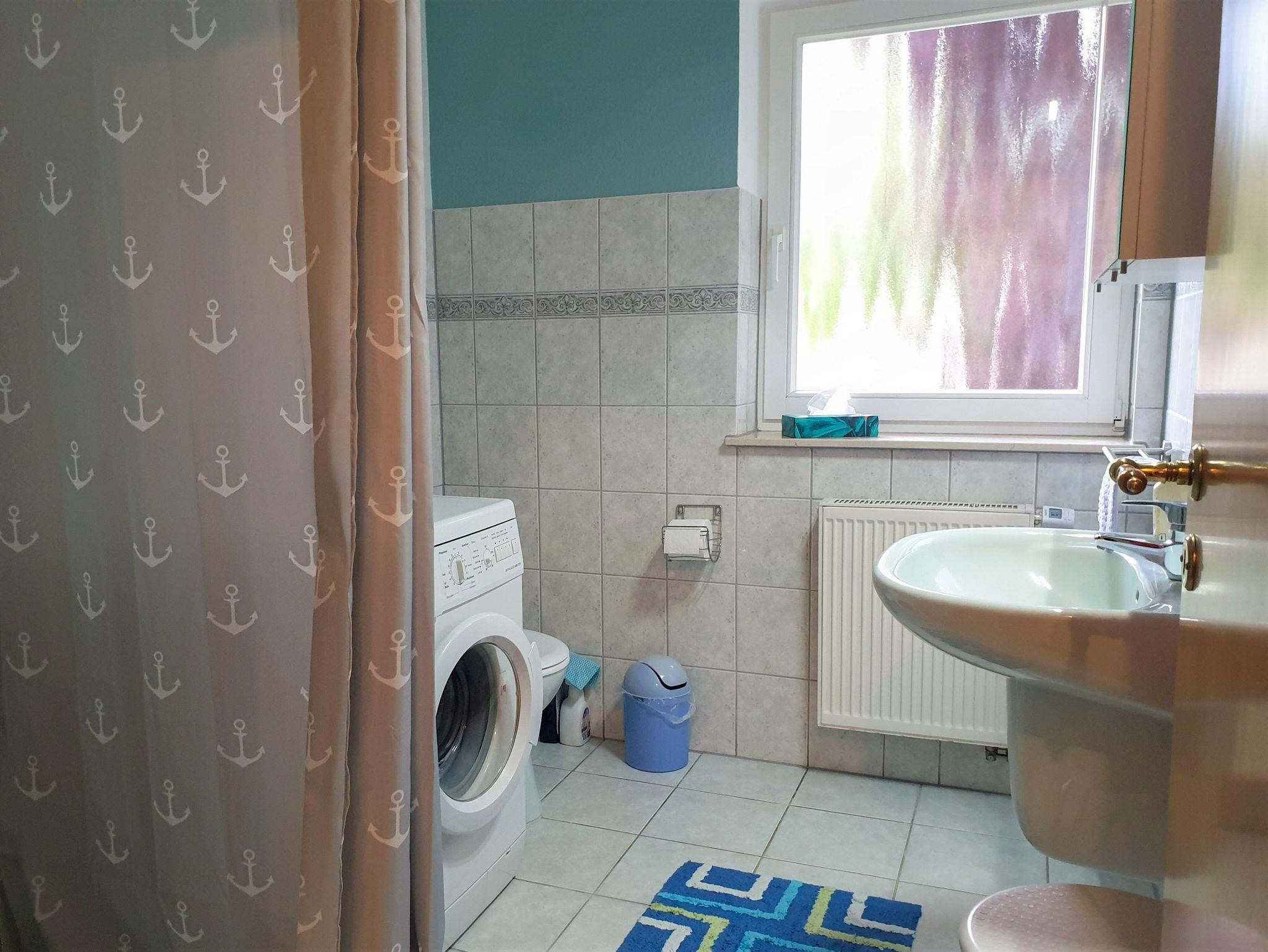 Das Bad ist hell und modern gefliest und verfügt über ein Einzelwaschbecken, einen praktischen Spiegelschrank, eine barrierefreie Dusche sowie eine Waschmaschine und einen Fön für Ihren Komfort.