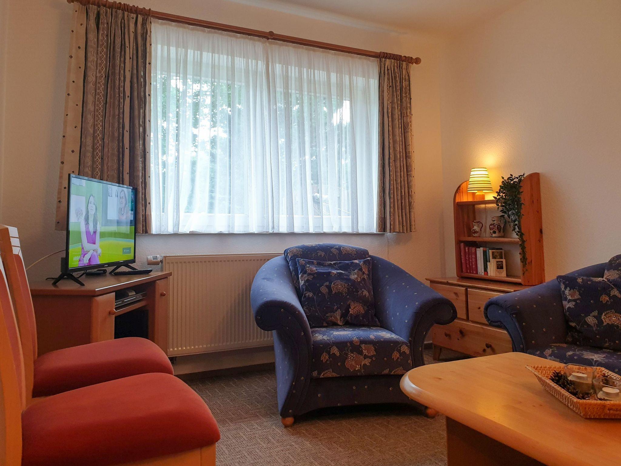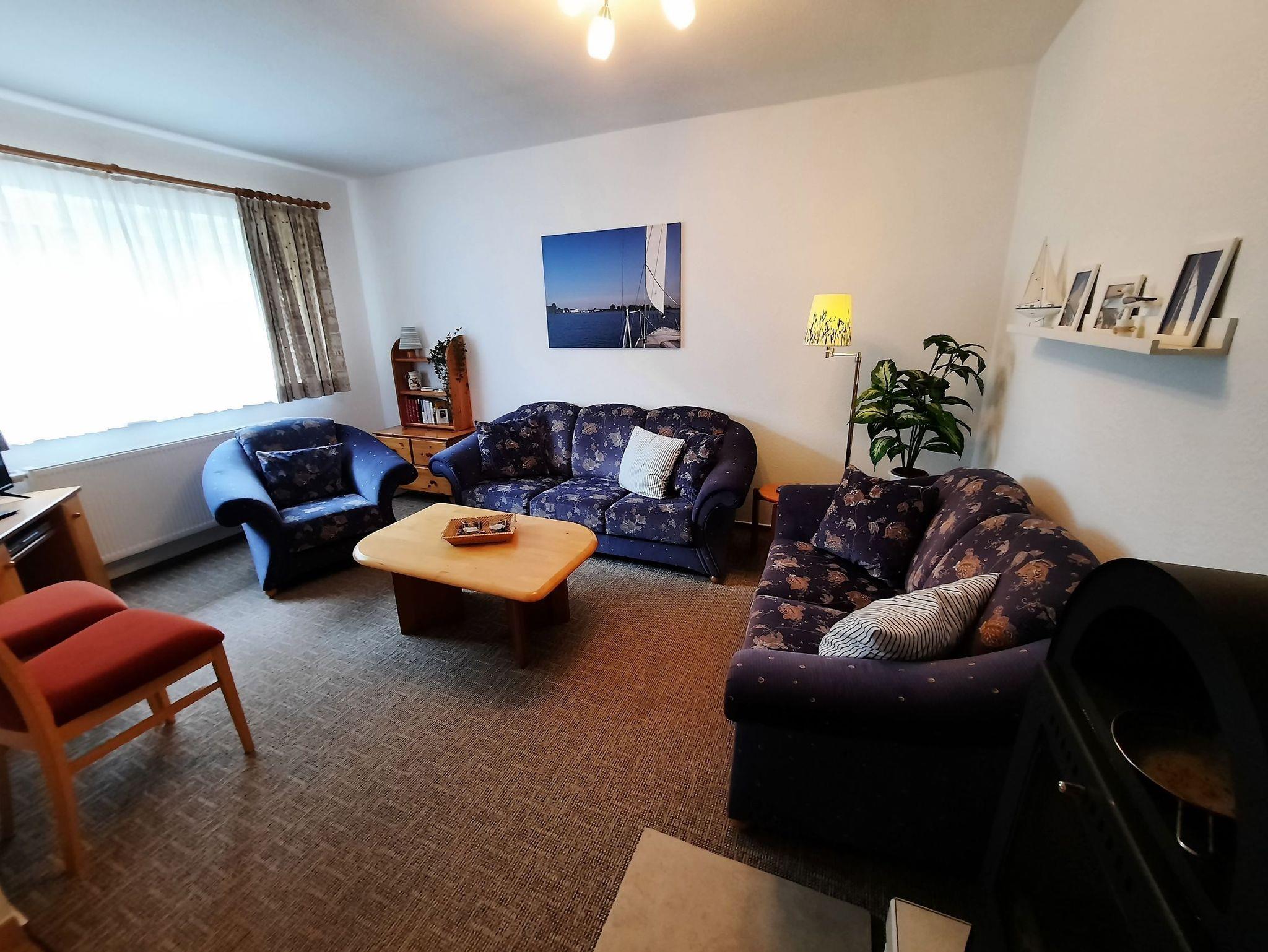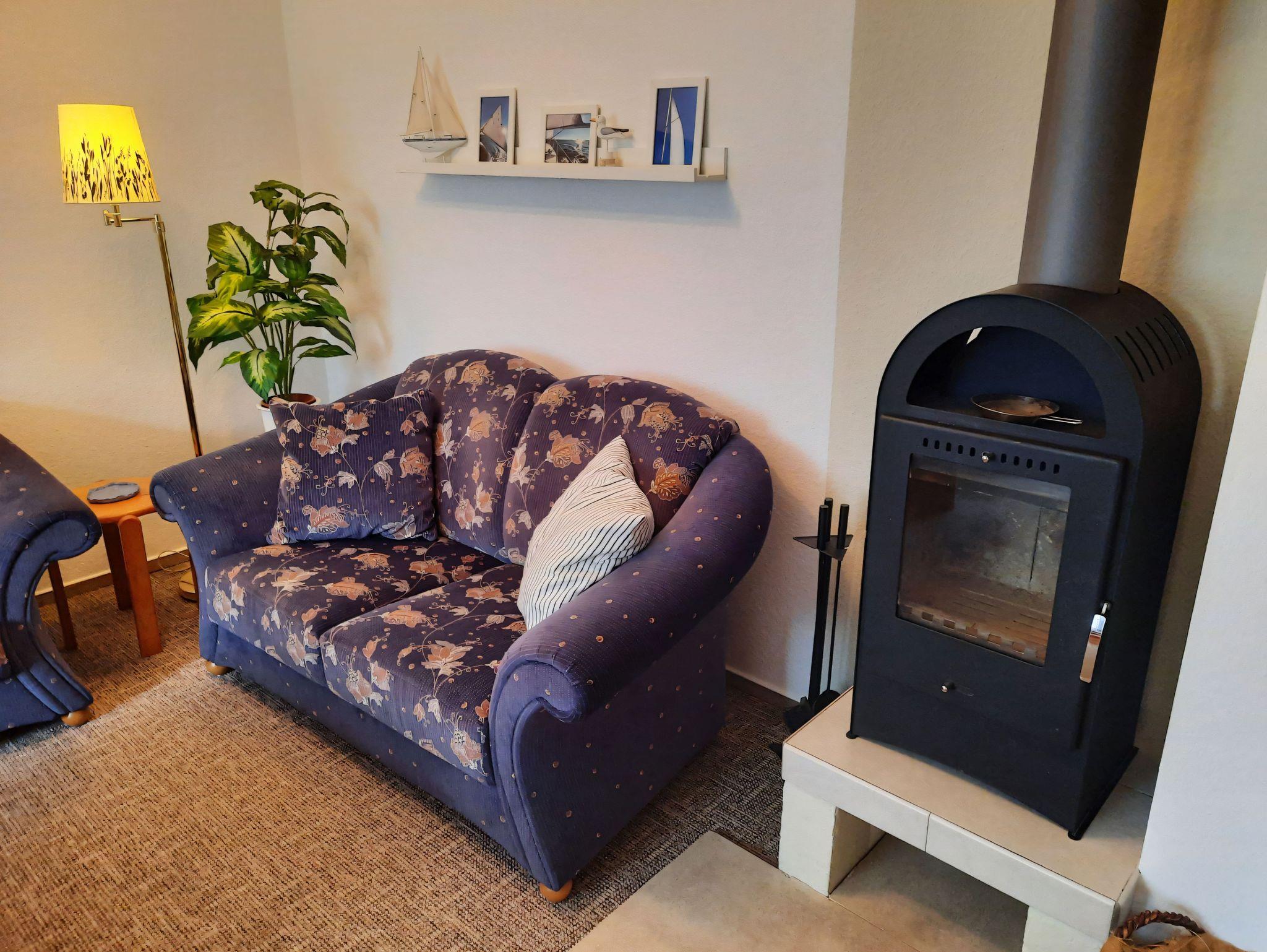 Das offene Wohnzimmer mit gemütlichen Sofas und einem Sessel lädt zum Entspannen ein. Es ist mit einem Smart-TV, Satellitenempfang und WLAN ausgestattet. Der Kaminofen sorgt für zusätzliche Wärme