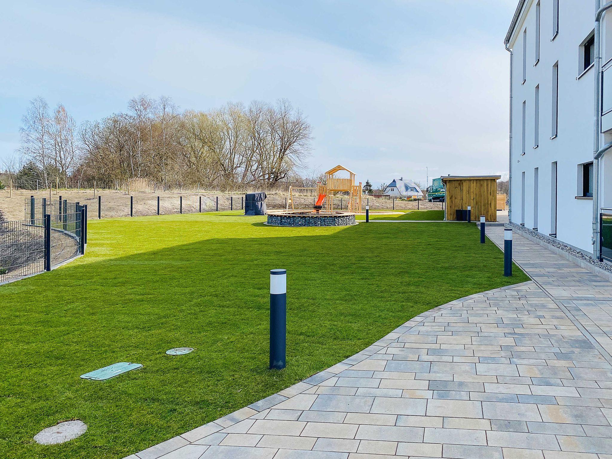 Im Außenbereich befindet sich ein großer feinsandigen Spielplatzbereich mit Rutsche, Kletterturm und mehreren Schaukeln. Für die Eltern steht ein Strandkorb zum Entspannen bereit.