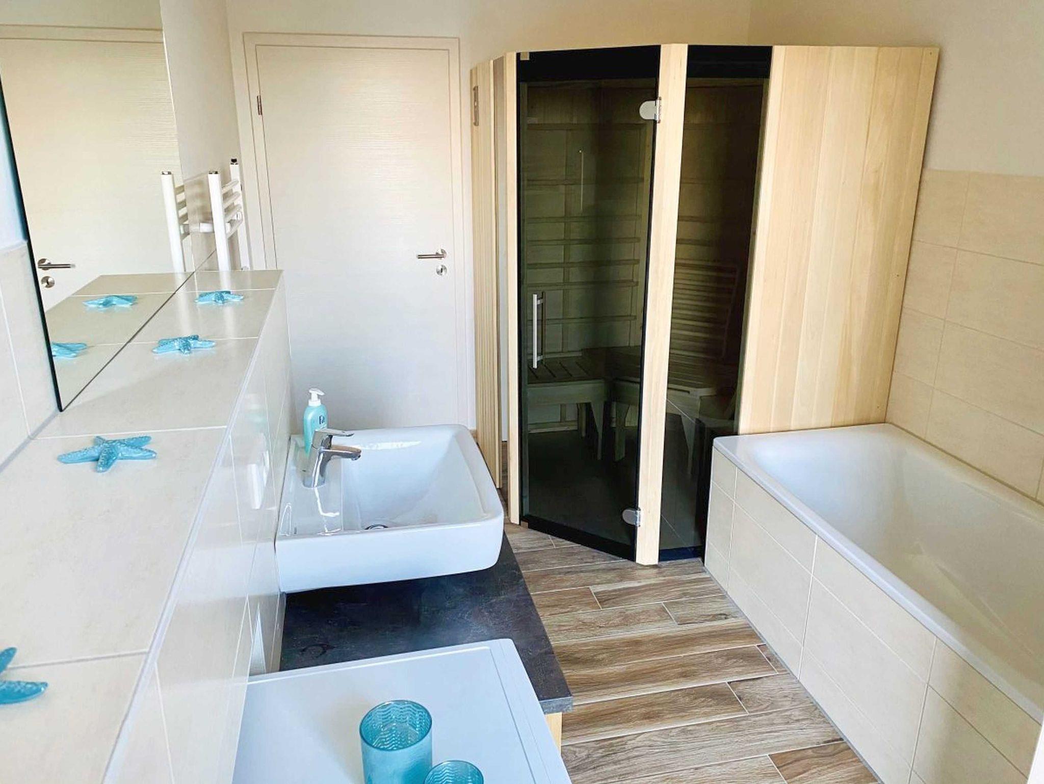 Das Badezimmer ist mit Wanne, Dusche und WC, sowie Haartrockner, Spiegel und Waschmaschine ausgestattet. Eine Infrarotkabine steht Ihnen im Badezimmer ebenso zur Verfügung.