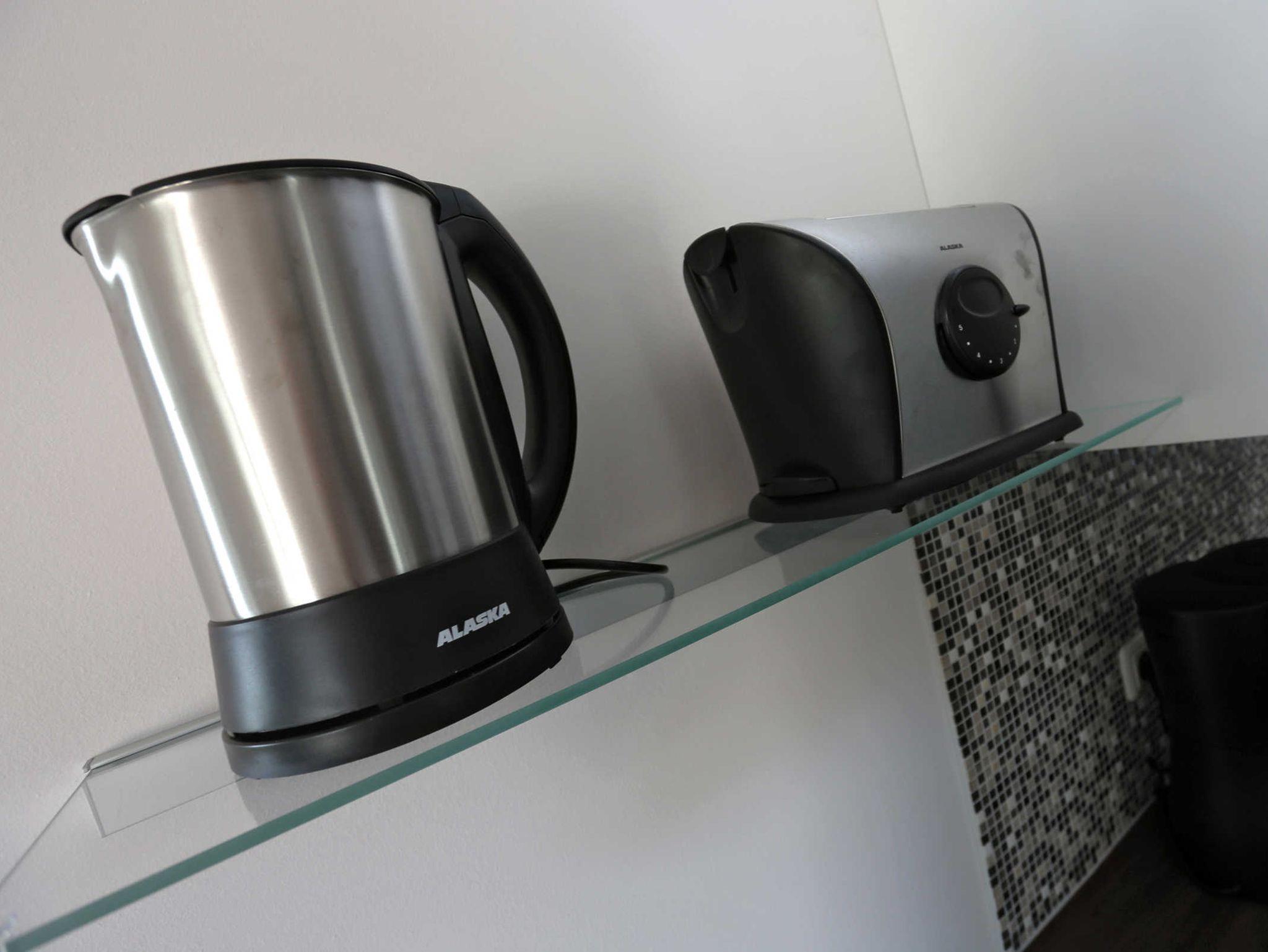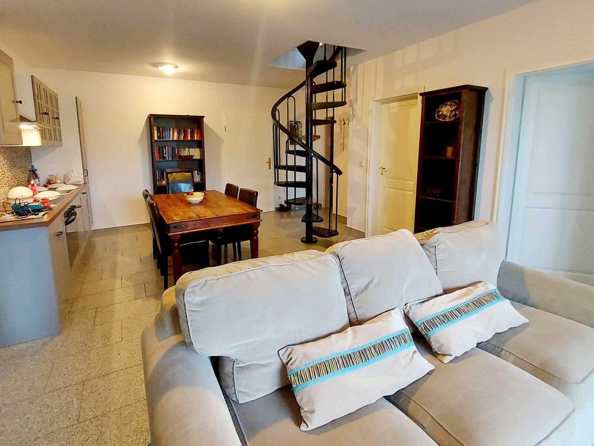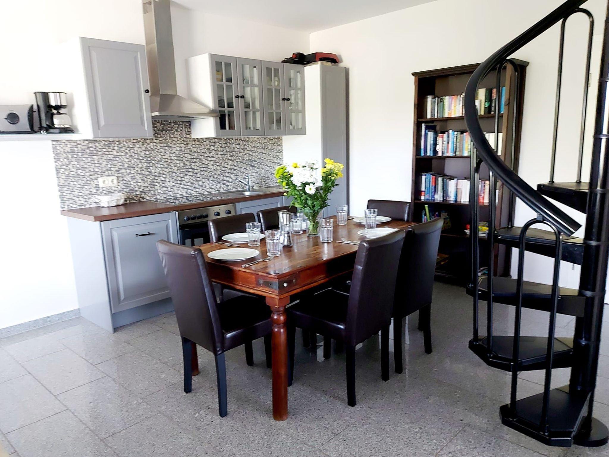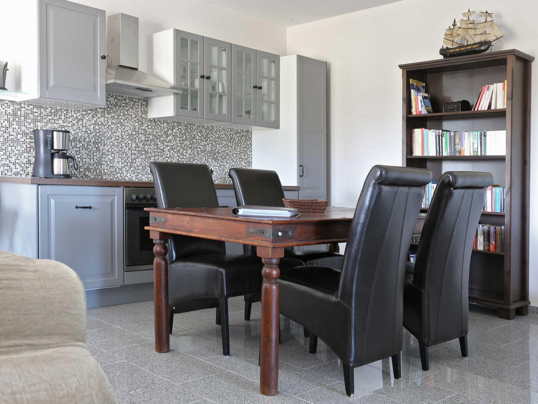 Die Maisonettewohnung verfügt über einen Balkon mit Panoramablick, einen offenen Wohn- und Küchenbereich mit großem Esstisch und einer gut ausgestatteten Küche mit Geschirrspüler, Ceranfeld, Backofen, Kühlschrank, Kaffeemaschine, Mikrowelle, Wasserkocher, Saftpresse und Toaster.