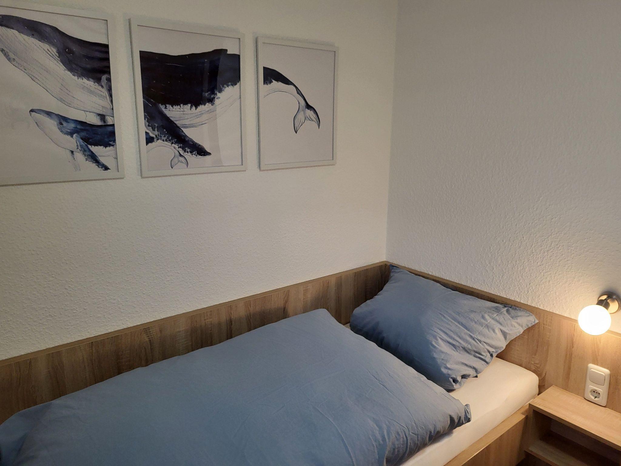 Es gibt zwei Schlafzimmer: Ein Schlafzimmer mit einem komfortablen Doppelbett (Aero Line, 7-Zonen-Kaltschaummatratze und einem hochwertigen 7-Zonen-Schichtholz-Komfortrahmen mit 42 Federholzleisten) für erholsamen Schlaf und ein weiteres Zimmer mit zwei Einzelbetten. Für kleine Gäste steht ein Hochstuhl bereit. Das moderne Duschbad/WC rundet das Angebot ab.
