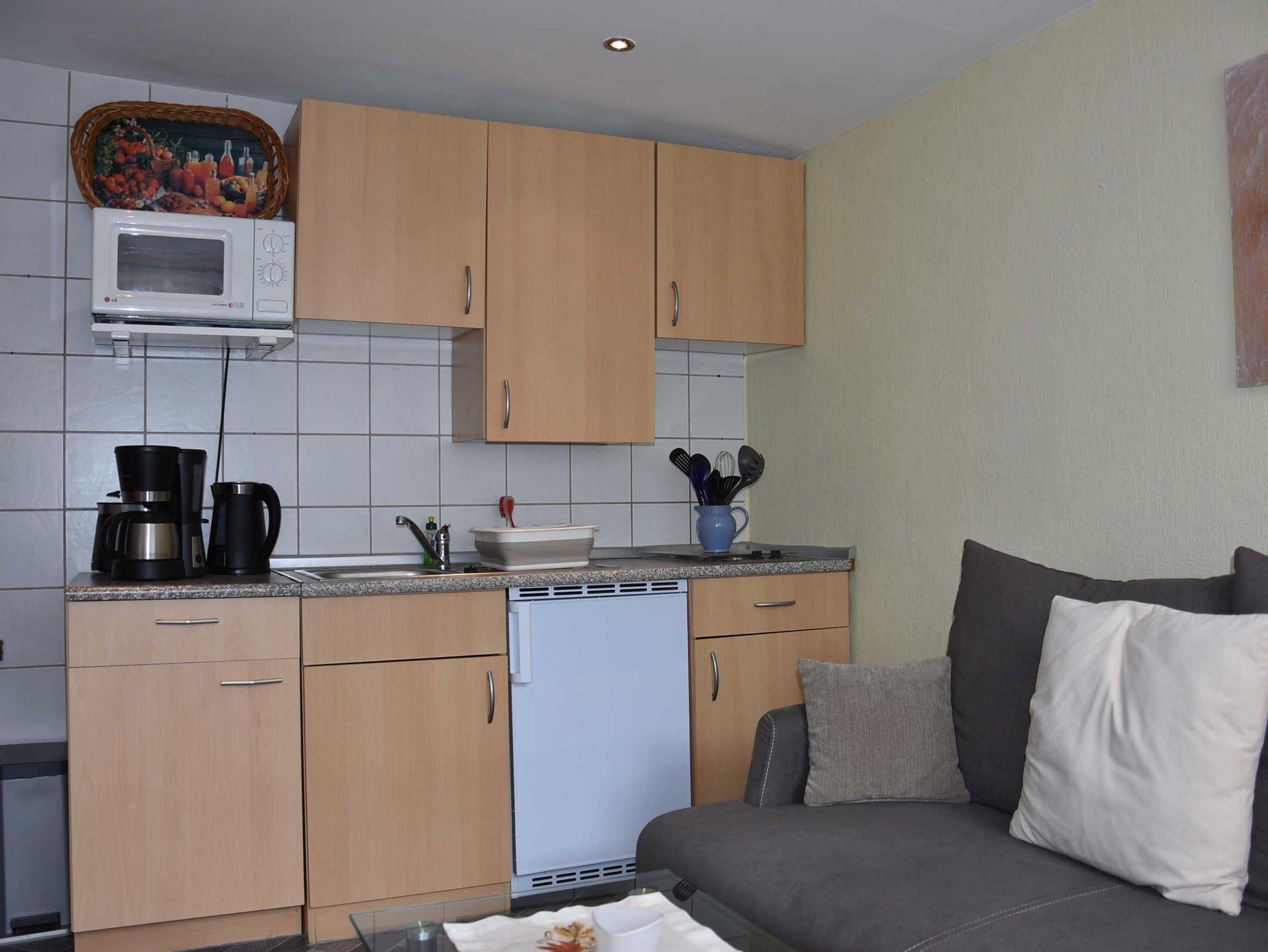 Im Wohn- Essbereich finden Sie die gemütliche Sitzecke mit ausziehbarer Couch, sowie die offene Küche mit Mikrowelle, Kühlschrank mit Tiefkühlfach, Wasserkocher, Toaster, Herd und Filterkaffeemaschine.