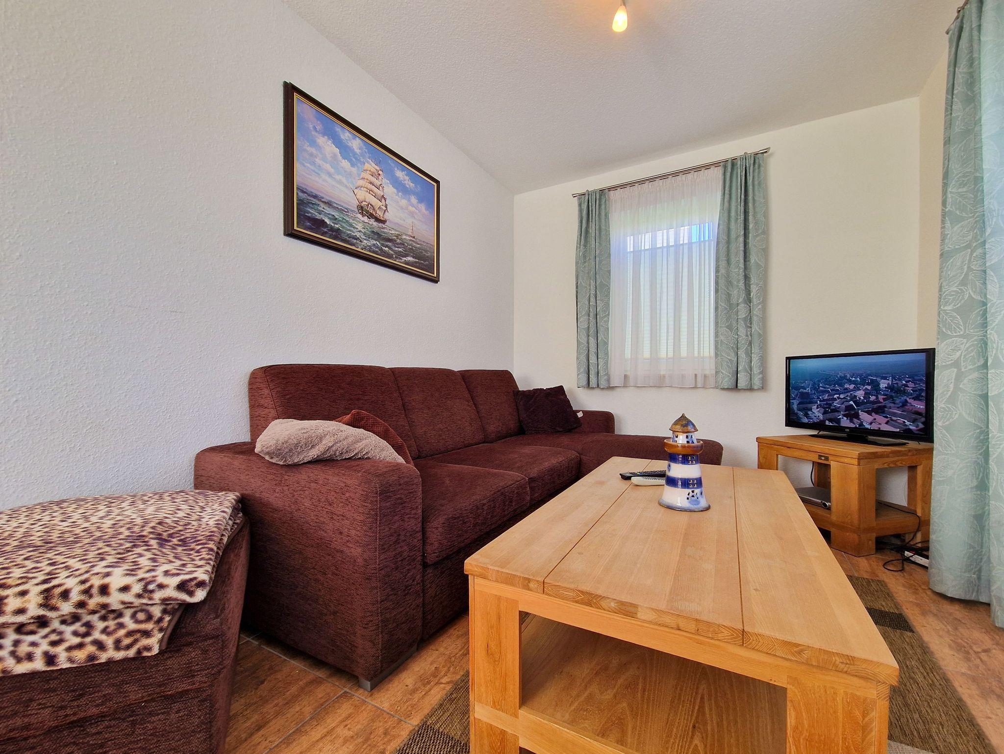Vom Wohnzimmer aus können Sie auf beide Terrassen treten, wo Sie Sitzmöbel und das herrliche Ostseewetter erwarten. Ein Badezimmer mit Dusche, WC und Waschbecken befindet sich ebenfalls im Erdgeschoß.