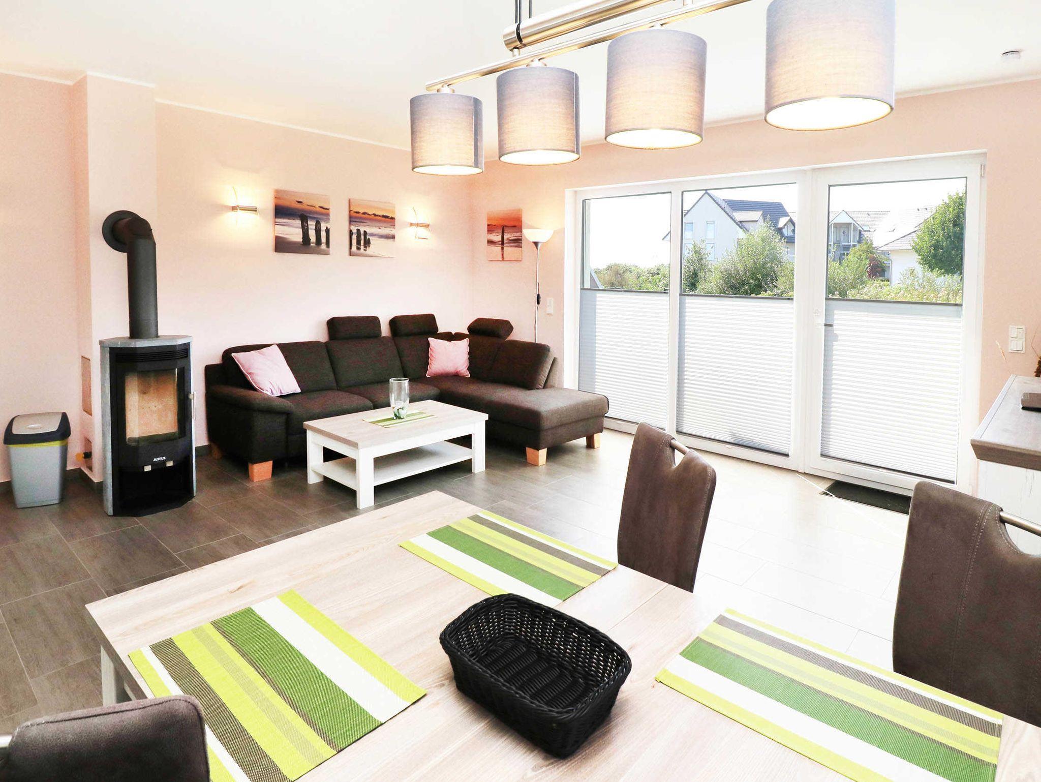 Das Wohnzimmer verfügt über eine Couchgarnitur mit Tisch und einem Kaminofen.
