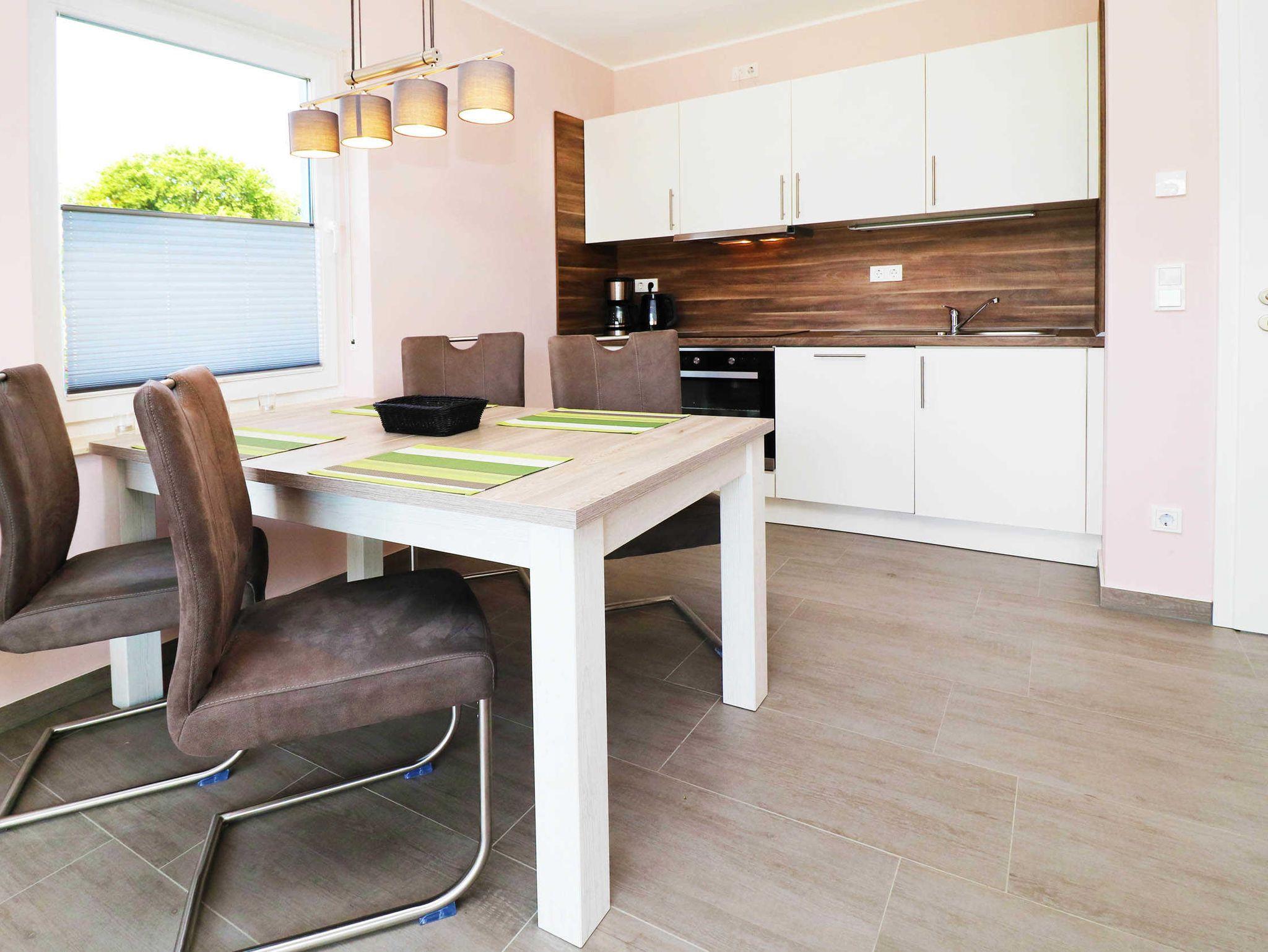 In dem Wohnzimmenr gehen der Essbereich mit komplett ausgestatteter Küche, fließend ineinander über.
