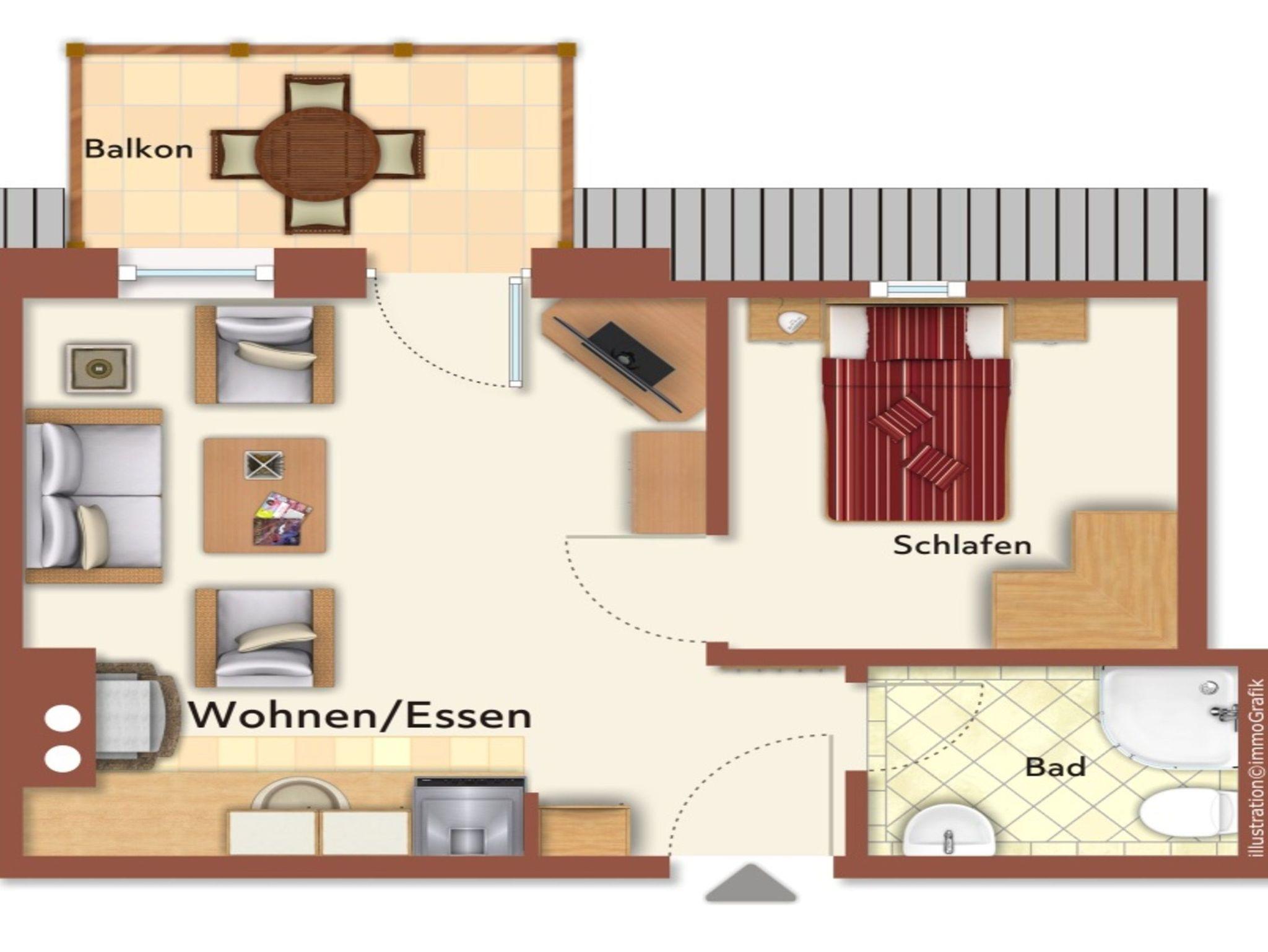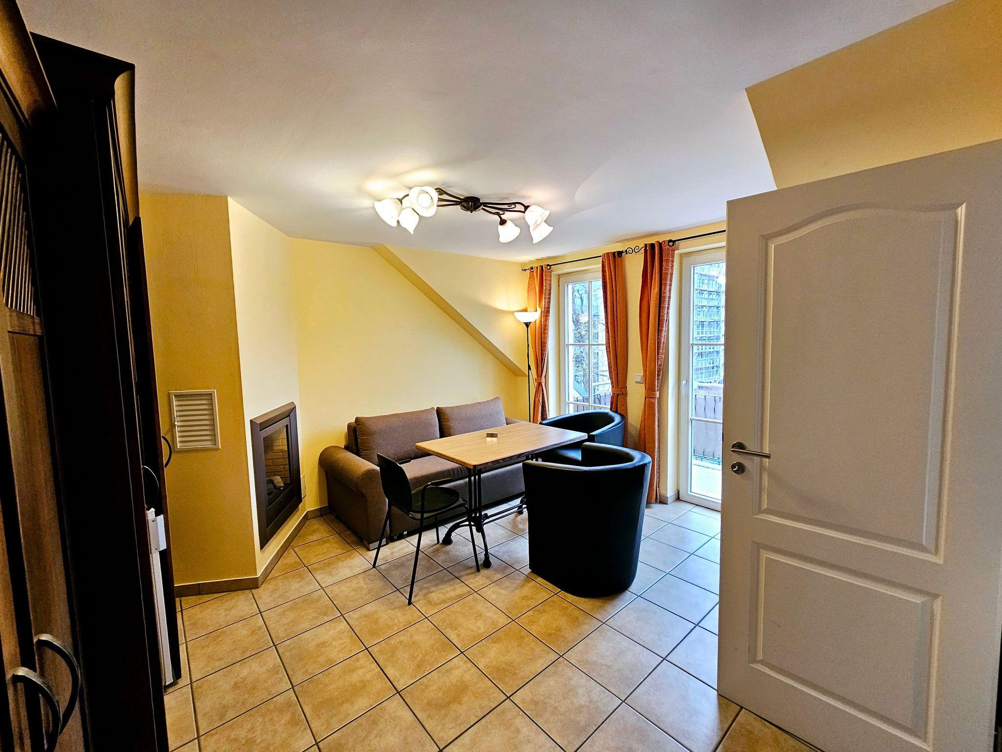 Das attraktive Ferienappartement im 2.OG besteht aus einem Schlaf- und einem Wohnraum mit Kamin und Balkon. Vom Balkon hat man teilweise einen Blick auf die Ostsee. Die Küche ist ausgestattet mit Geschirrspüler, Herd mit Ceranfeld, Mikrowelle mit Grill- und Backfunktion, Kühlschrank, Toaster und Kaffeemaschine. Im Wohnraum befindet sich ein Mediencenter mit SAT-TV, Radio und DVD-Spieler. Sie können die Mahlzeiten entweder im Restaurant im EG oder auf dem eigenen Balkon genießen. Neben dem Doppelbett im Schlafzimmer kann die Schlafcouch im Wohnzimmer zur Aufbettung genutzt werden. Der Boden ist mit Fußbodenheizung ausgestattet und mit Design-Vinyl Bodenbelag oder Fliesen belegt.