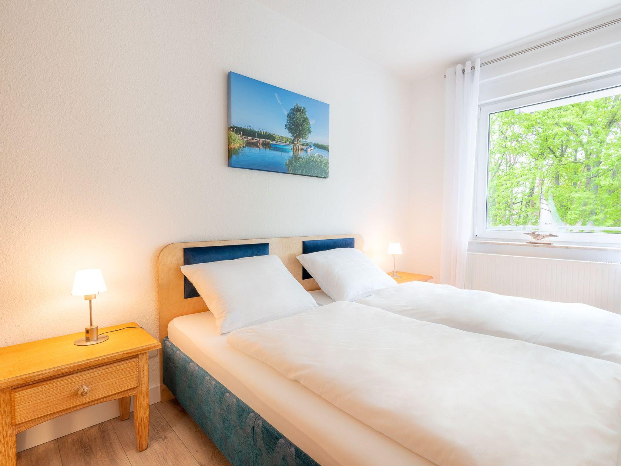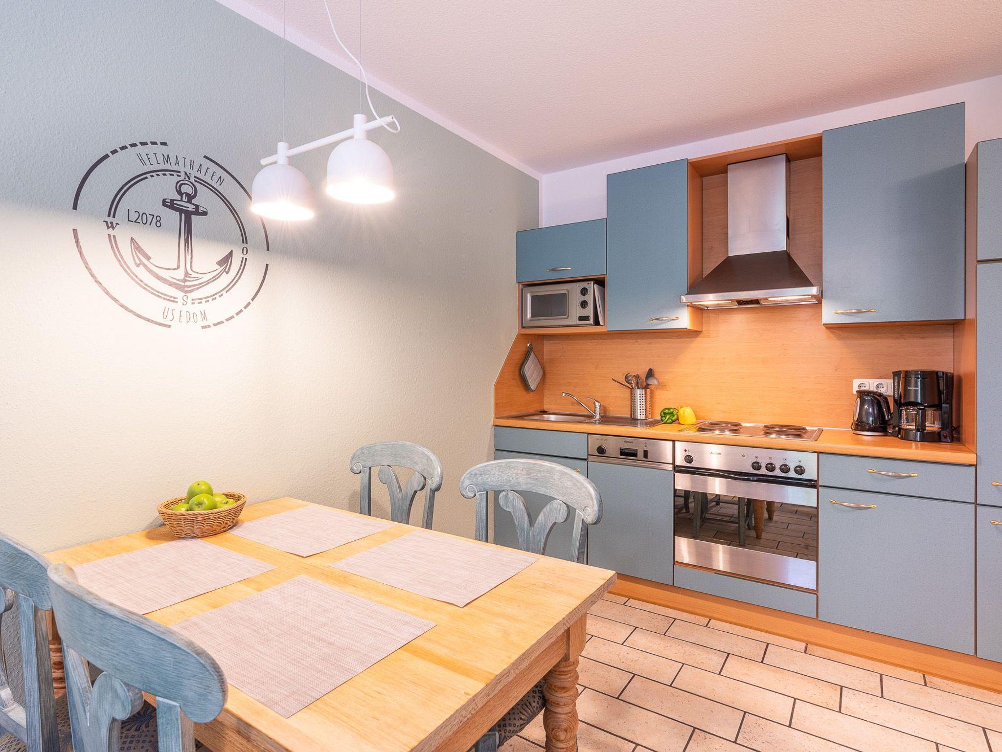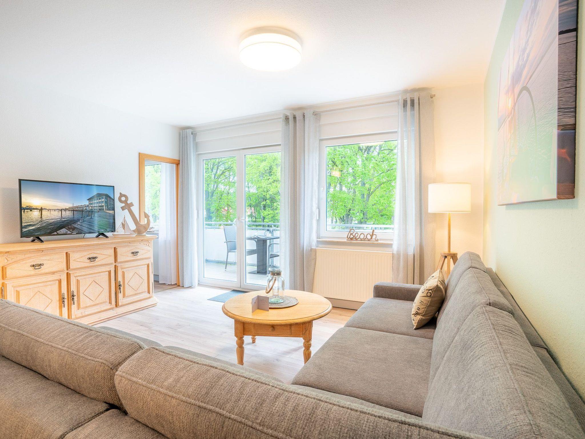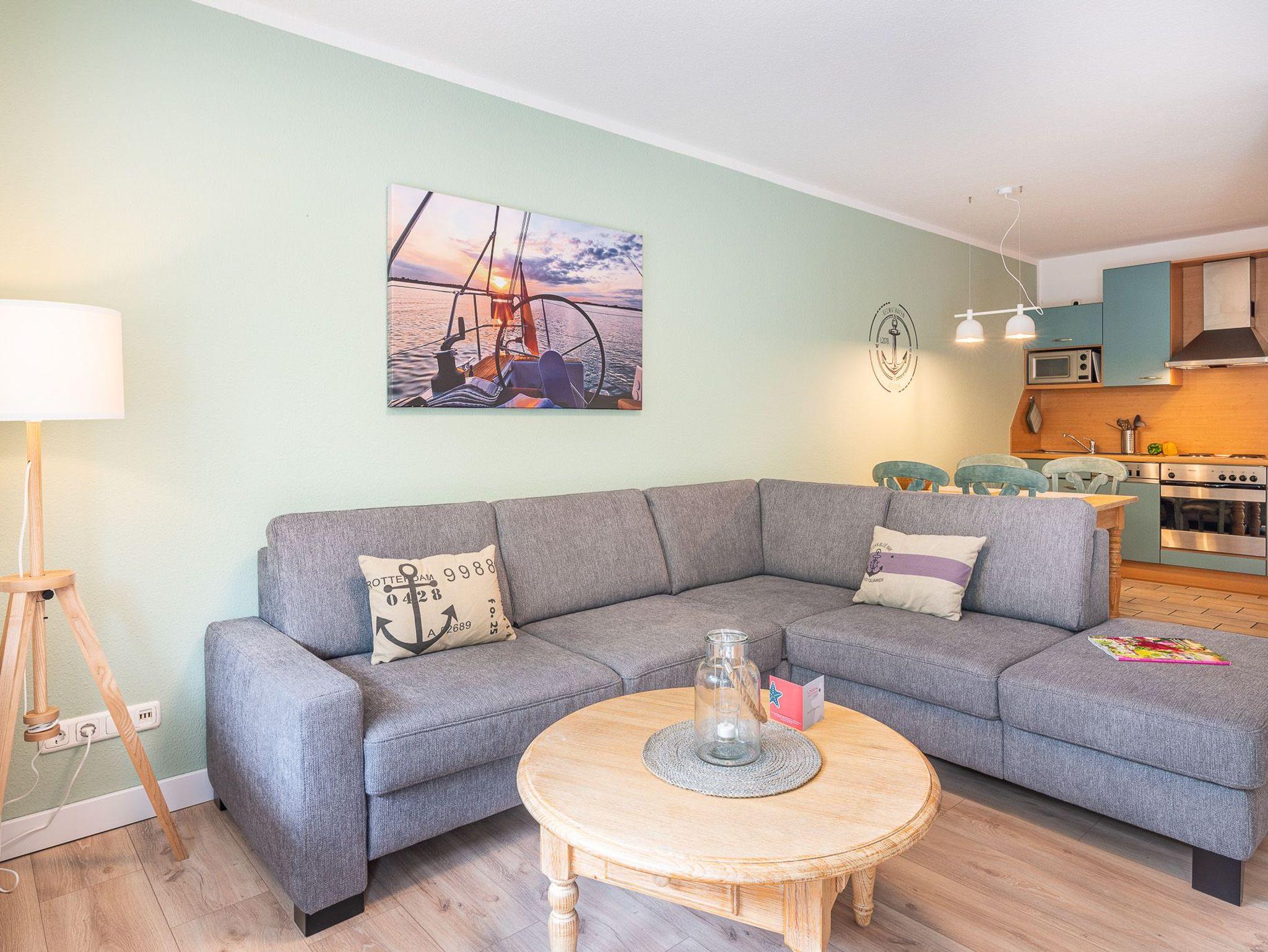 Das Wohnzimmer besitzt eine gemütliche Sitzecke und einen Fernseher, hier können Sie gemeinsam die Zeit in Ihrer Ferienwohnung ausnutzen. Die komplett eingerichtete Küchenzeile ermöglicht es Ihnen Ihre Kochkünste frei zu entfalten. Das Schafzimmer ist mit einem Doppelbett ausgestattet. In dem Bad befinden sich Dusche sowie WC. Auf dem Balkon können Sie bequem Ihren Tag ein- und ausklingen lassen. WLAN ist vorhanden. Waschmaschine und Trockner können Sie gegen Entgelt verwenden. Natürlich gibt es auch einen PKW-Parkplatz auf dem Grundstück. Zum feinsandigen, weißen Badestrand sind es nur ca. 3-4 Gehminuten.