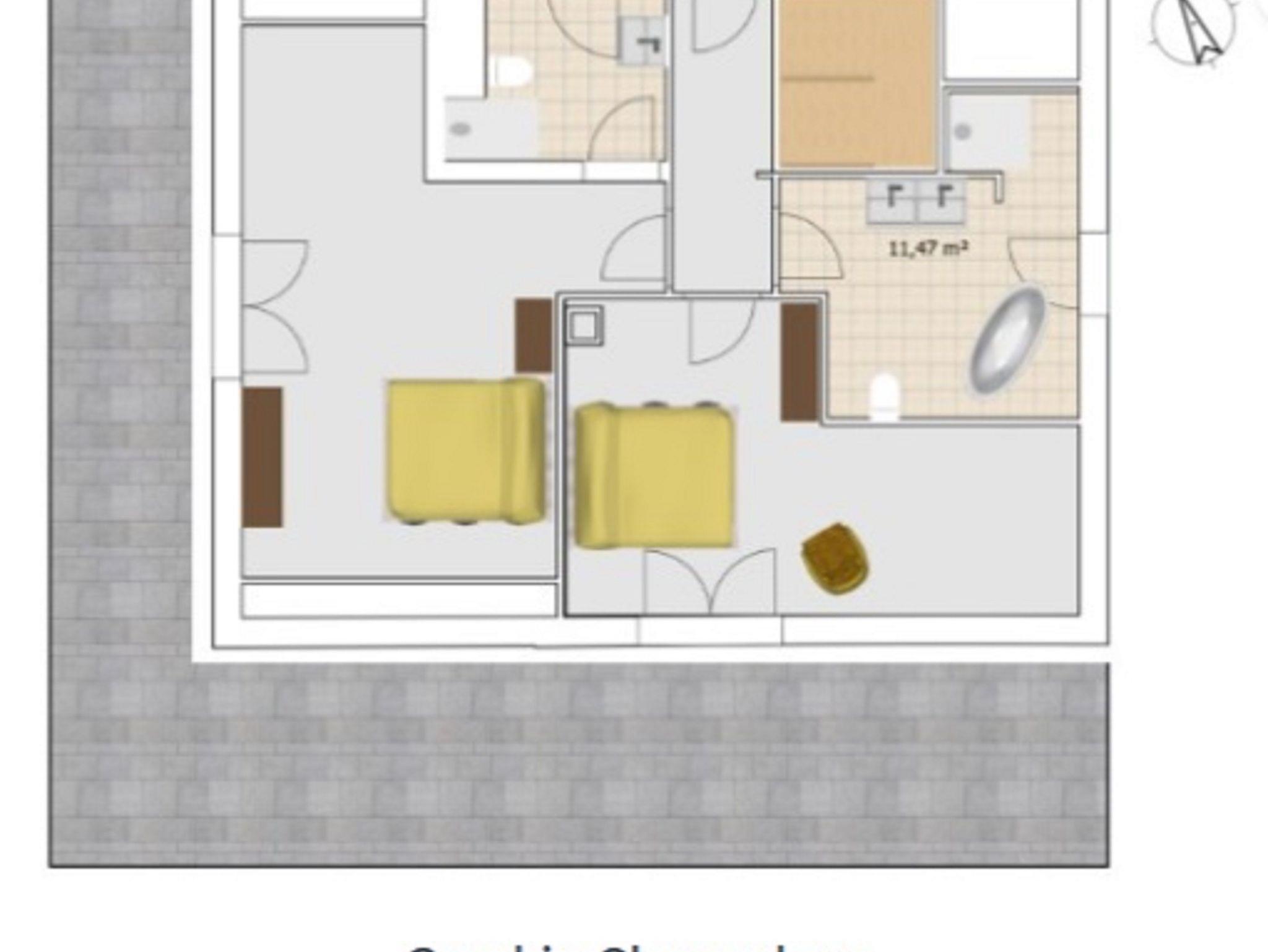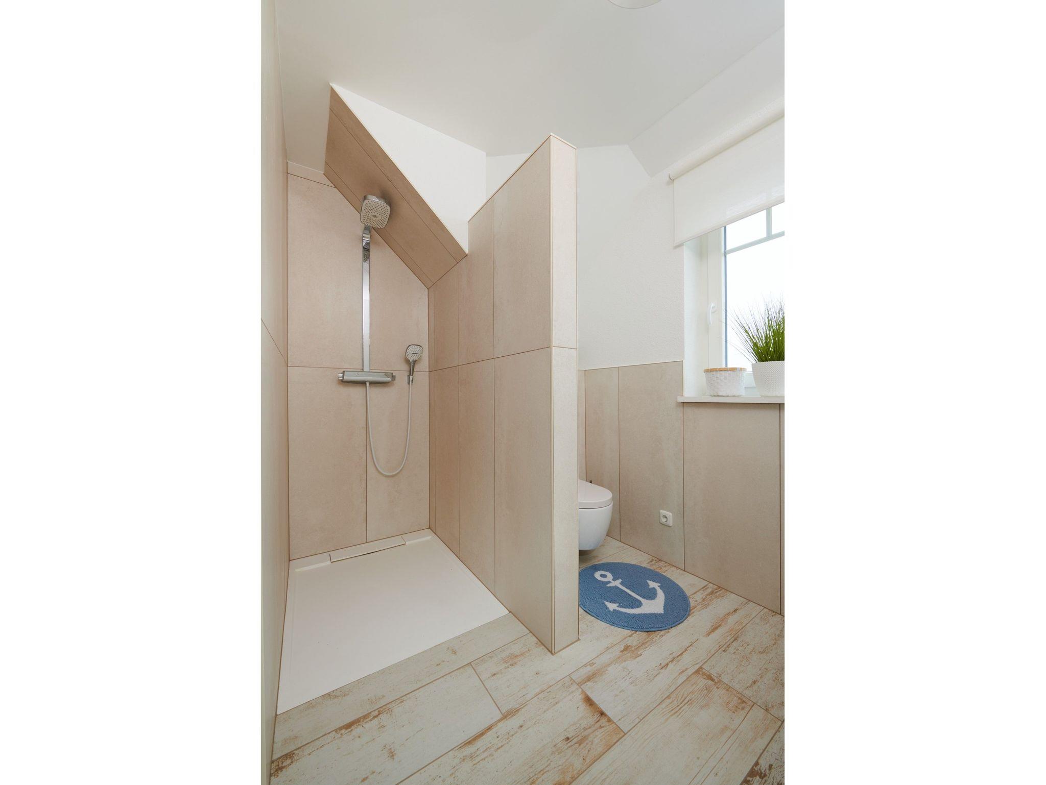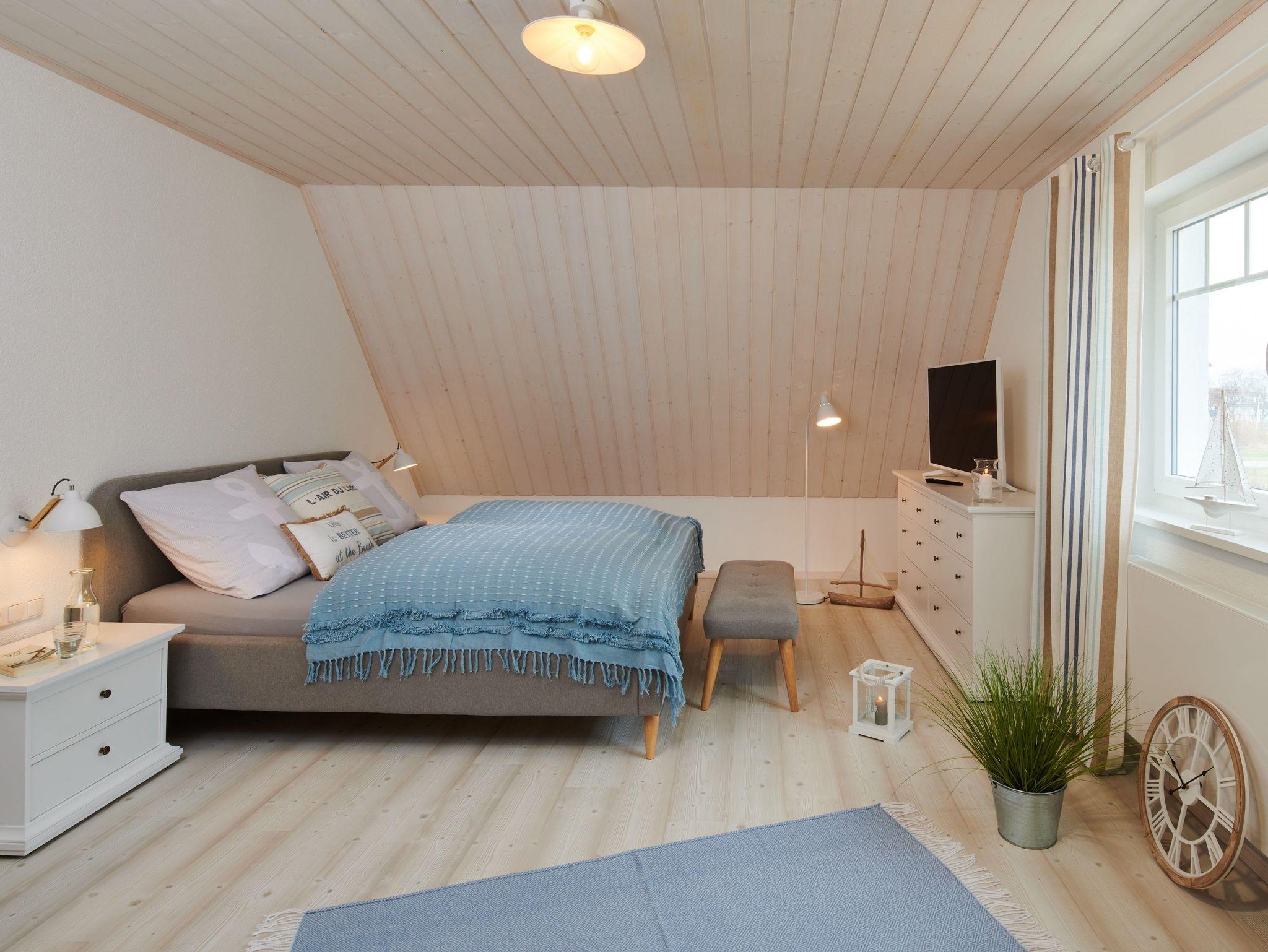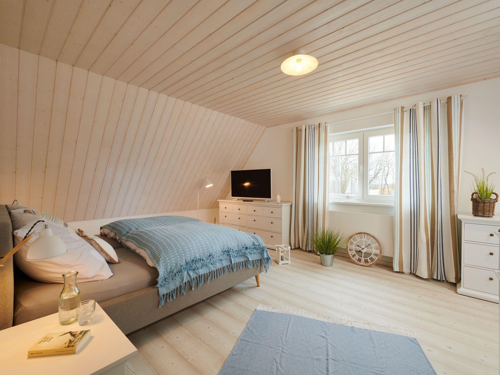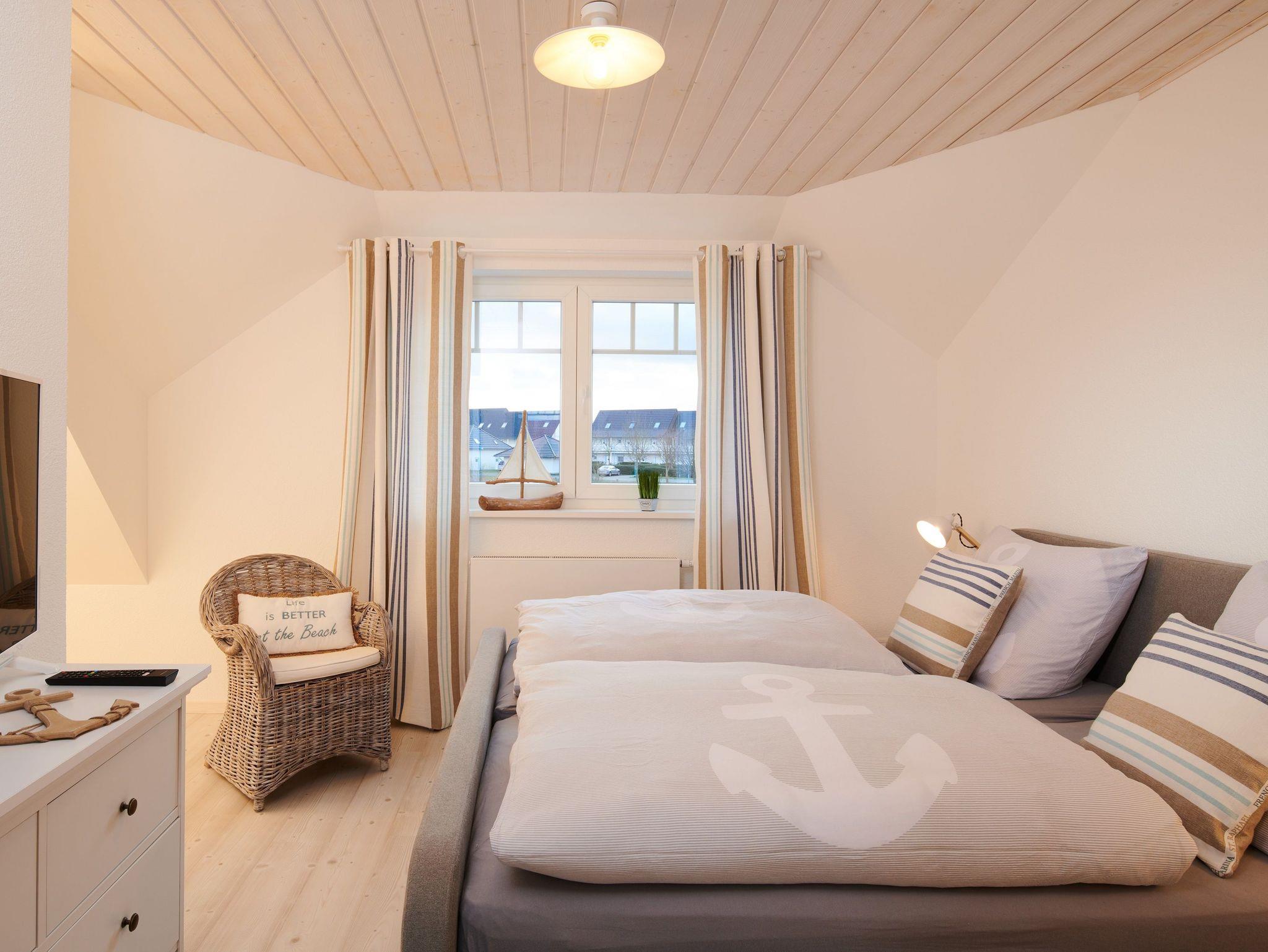 Im Obergeschoss befinden sich zwei weitere Schlafzimmer und zwei Badezimmer. Beide Schlafzimmer verfügen über je ein Doppelbett, Kommode und über einen Fernseher. Von einem der beiden Schlafzimmer aus haben Sie einen direkten Zugang zum Badezimmer mit einer ebenerdigen Dusche. Das zweite Badezimmer im Obergeschoss ist ausgestattet mit einer freistehenden Badewanne, einer ebenerdigen Dusche und einem Haartrockner. In allen drei Schlafzimmern ist ein Insektenschutz an den Fenstern.