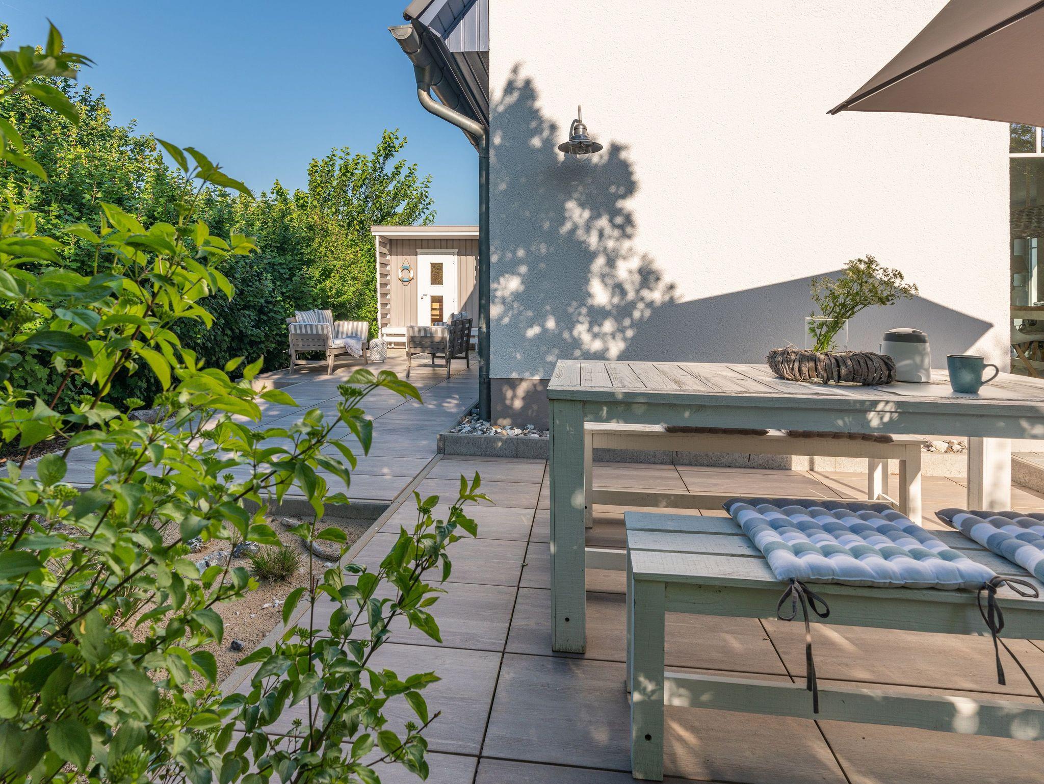 Das Ferienhaus ist von einem großzügigen Garten umgeben. Die beiden Terrasse laden zum Entspannen ein. Hier finden Sie eine Sitzecke mit einem Strandkorb und eine weitere Sitzecke mit einem großen Essplatz für bis zu 6 Personen. Einen Grill finden Sie im Gartenhaus. Für die Terrasse steht Ihnen ein Sonnenschirm zur Verfügung. Die Außensauna befindet sich ebenfalls im Garten. Diese können Sie gegen Gebühr dazubuchen, Düfte für einen Aufguss sind vorhanden. Vor der Sauna befindet sich ebenfalls eine kleine Terrasse.