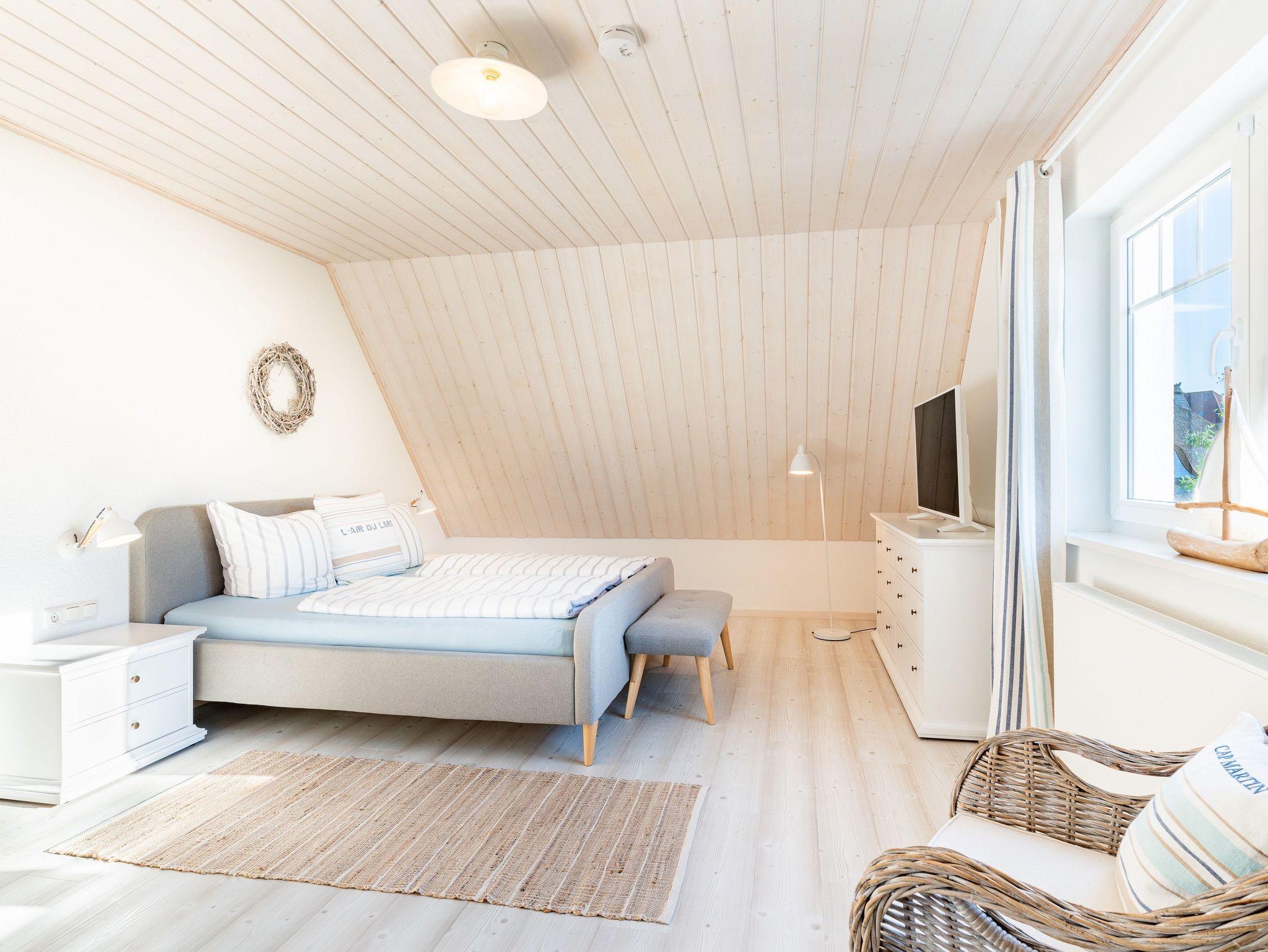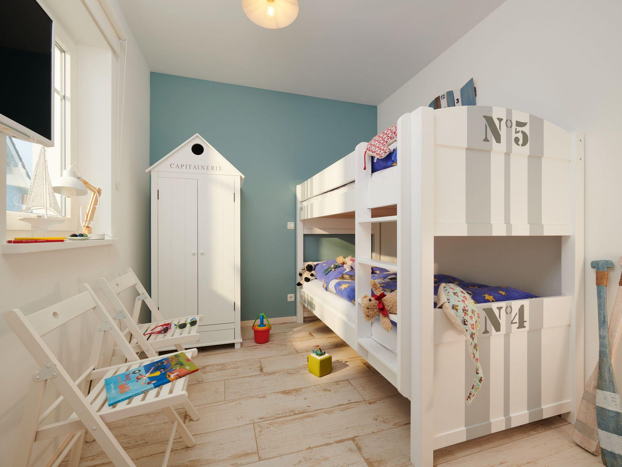 Das Schlafzimmer im Erdgeschoss verfügt über ein Etagenbett, Fernseher und über einen Schrank. Das Badezimmer ist ausgestattet mit einer ebenerdigen Dusche.