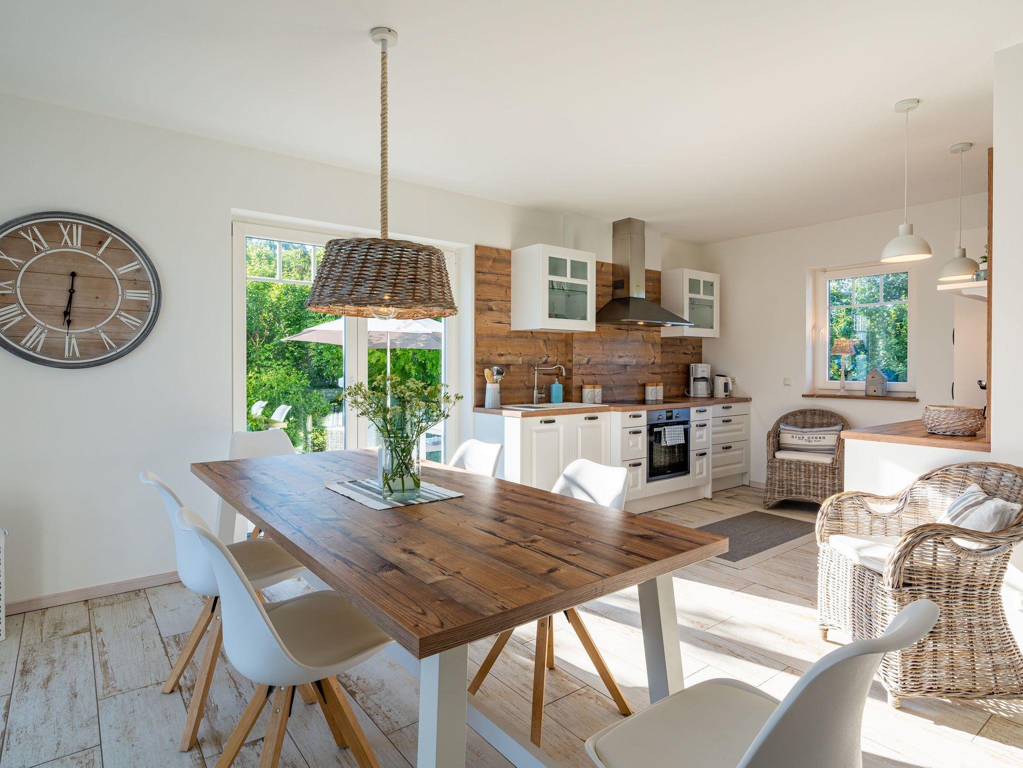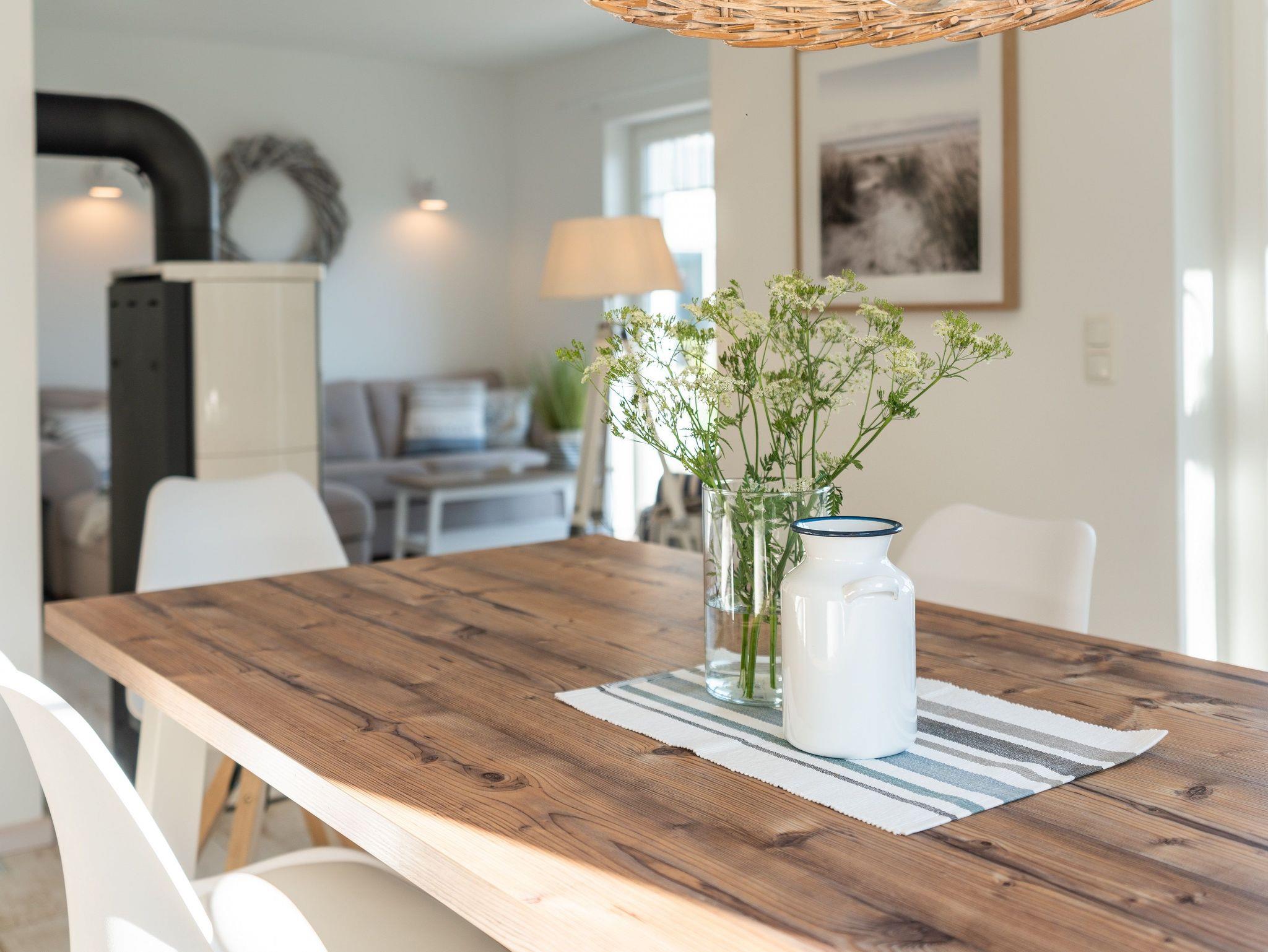 Das wunderschöne, helle und modern eingerichtete Ferienhaus MEERZEIT ist ca. 129 m² groß und erstreckt sich über zwei Etagen. Im Erdgeschoss befindet sich das großzügige Wohnzimmer mit einem Kamin und einer offenen Küche. Im Wohnzimmer laden eine gemütliche Couch und ein Sessel zum Verweilen ein. Am Esstisch haben Sie Platz für bis zu 6 Personen. Die Küche ist ausgestattet mit Kochfeld, Backofen, Geschirrspüler, Wasserkocher, Kaffeemaschine und einer Kapsel-Kaffeemaschine von Tassimo.