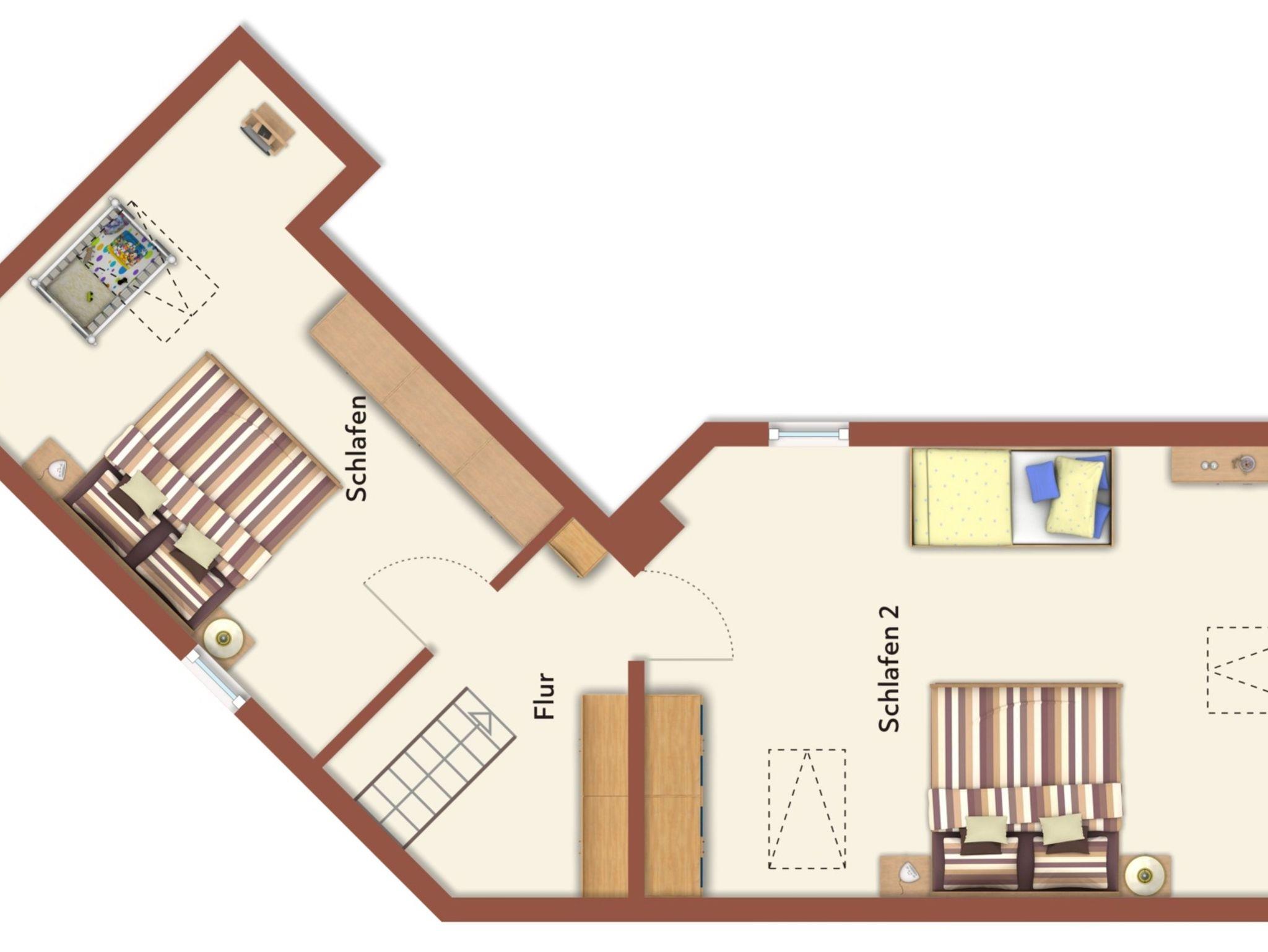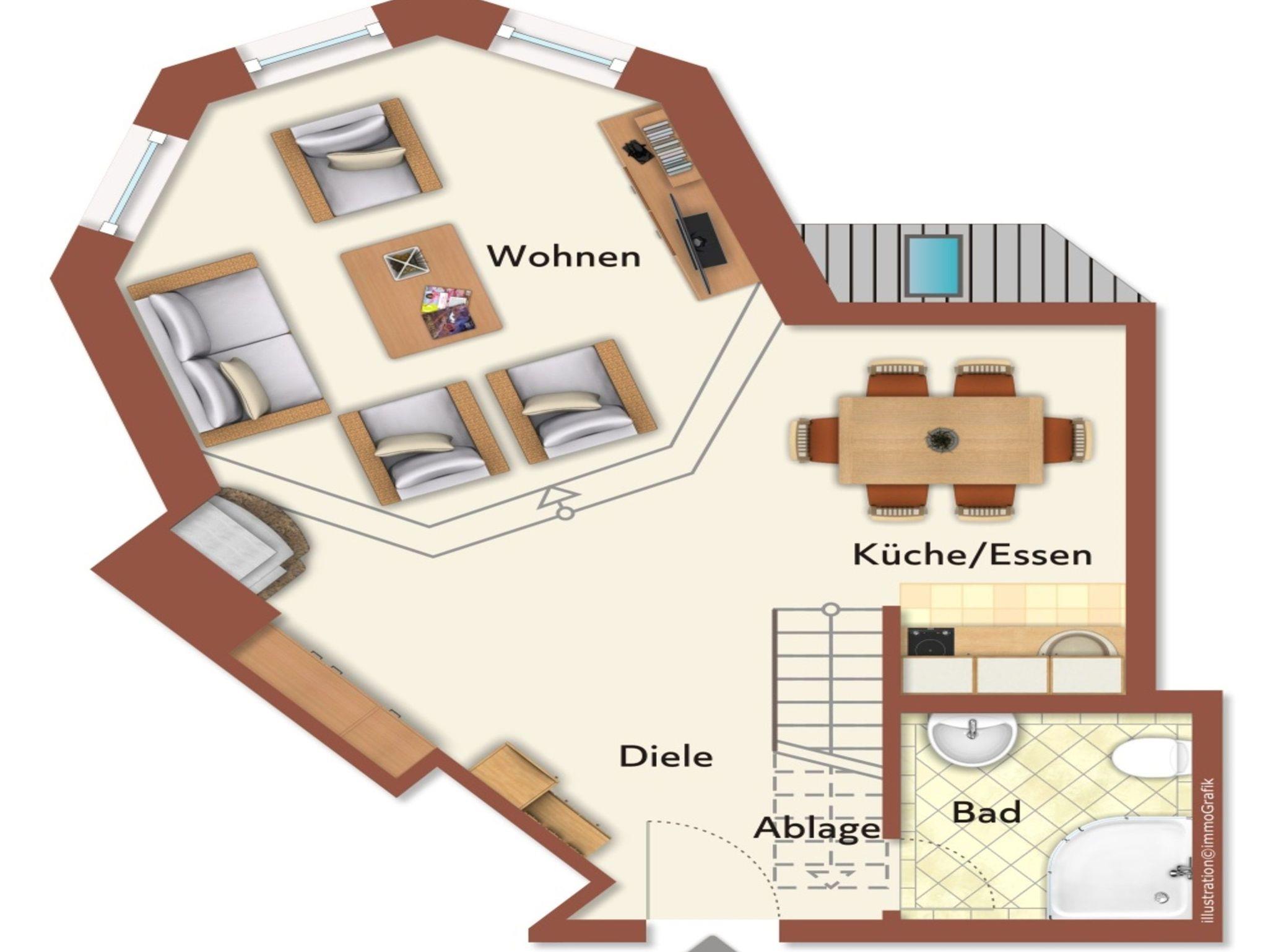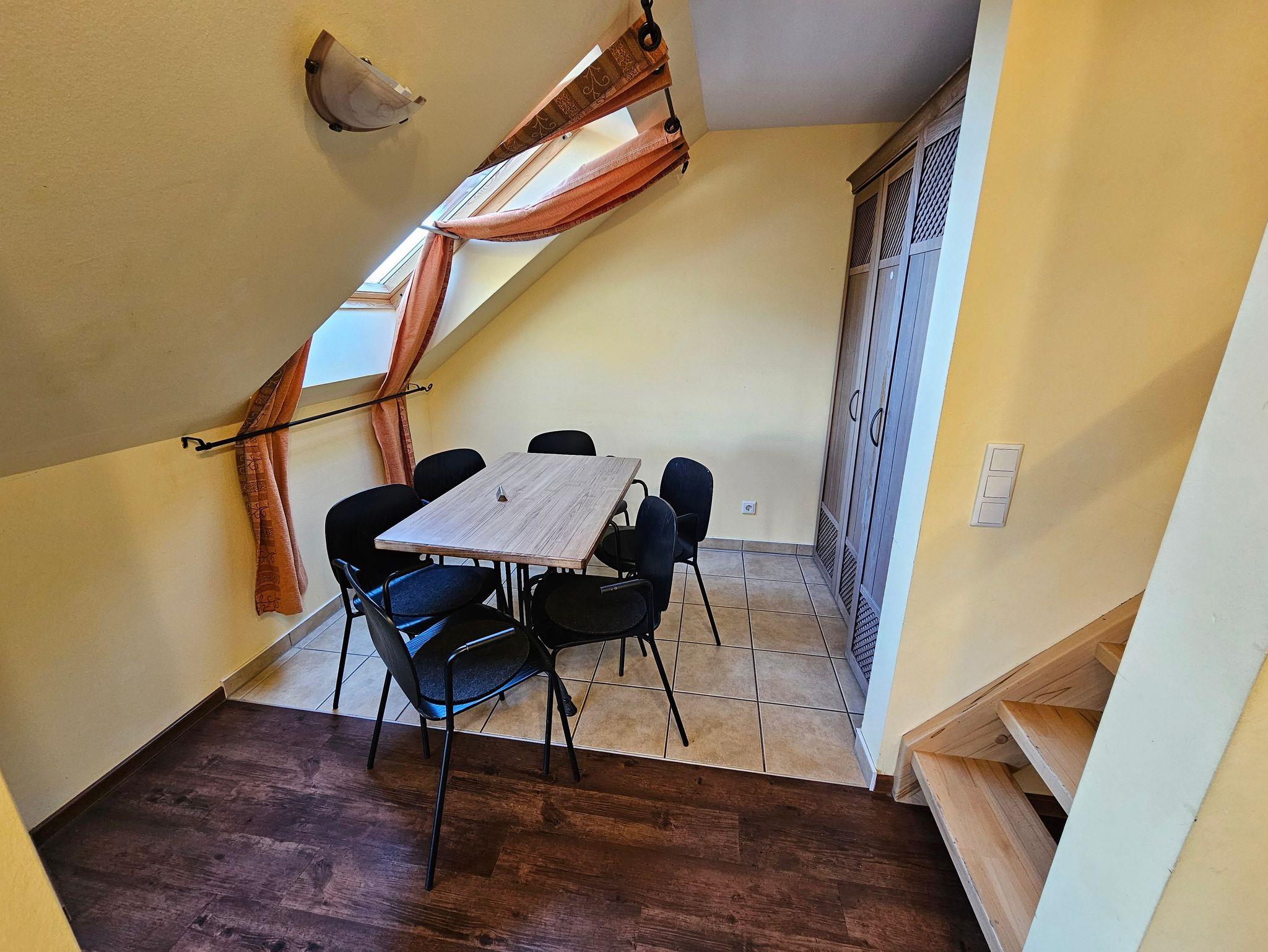 Das attraktive Ferienappartement im 2.OG besteht aus 2 Maisonette- Schlafräumen und einem großzügigen Wohnraum mit Kamin und Erker. Vom Erker und von den beiden Schlafräumen aus den ausklappbaren Cabrio-Dachfenstern hat man einen herrlichen Blick auf die Ostsee. Die Küche ist ausgestattet mit Geschirrspüler, Herd mit Ceranfeld, Mikrowelle mit Grill- und Backfunktion, Kühlschrank, Toaster und Kaffeemaschine. Im Wohnraum befindet sich ein Mediencenter mit SAT-TV, Radio und DVD-Spieler. Sie können die Mahlzeiten entweder im Restaurant im EG oder im Erker genießen. Neben den beiden Doppelbetten und dem einen Einzelbett in den Schlafzimmern kann die Schlafcouch im Wohnzimmer zur Aufbettung genutzt werden. Der Boden ist mit Fußbodenheizung ausgestattet und mit Design-Vinyl Bodenbelag oder Fliesen belegt.