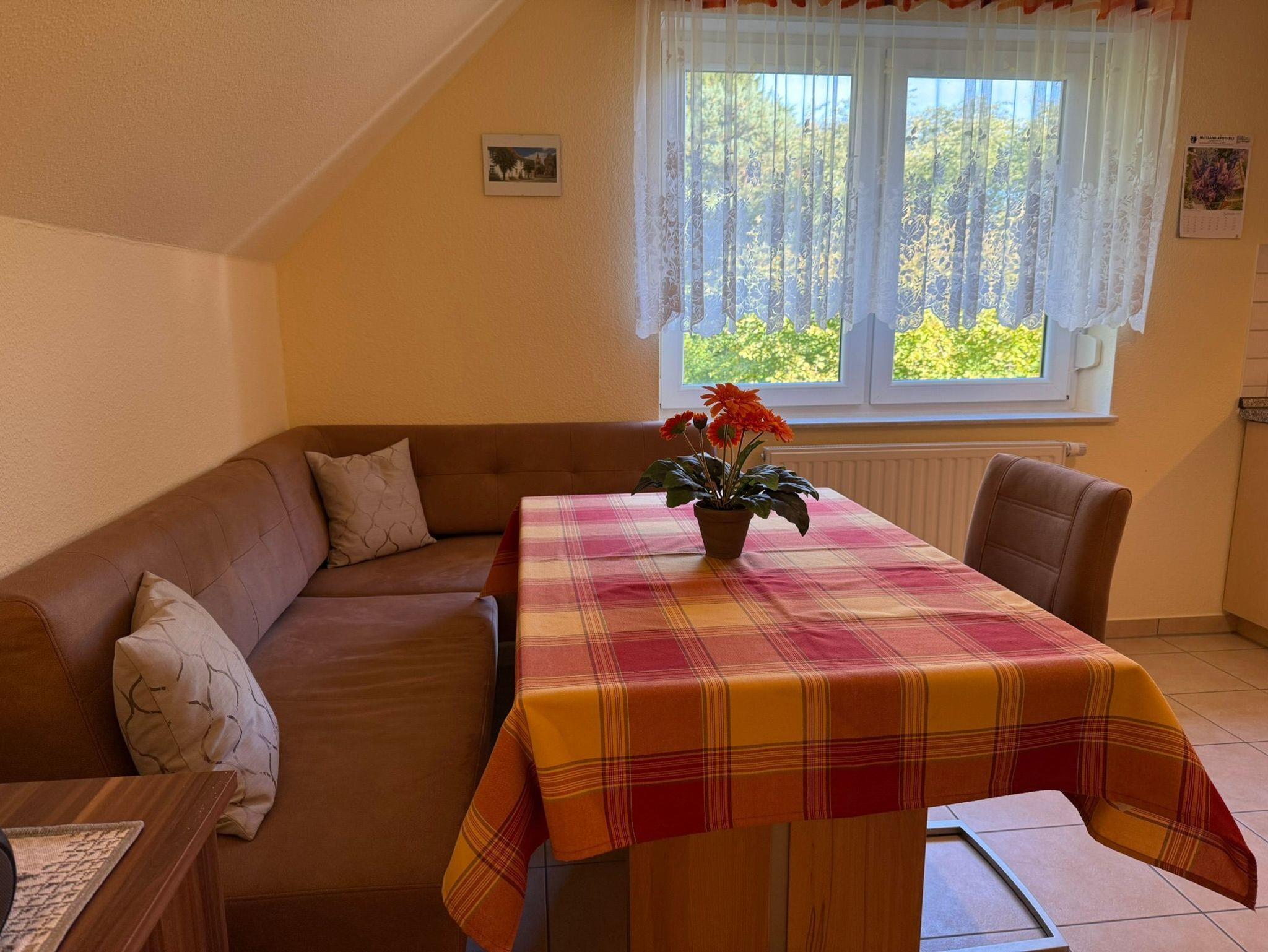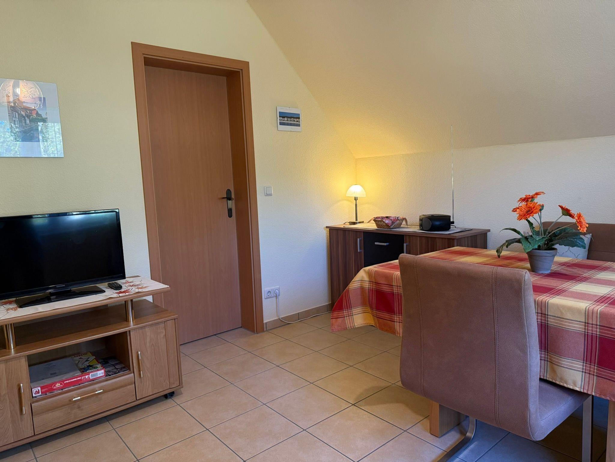 Wohnfläche 35 m², Wohnraum mit Küchenzeile, Eckbankgarnitur, Farb-TV, Radio (SAT-Anlage), Schlafraum mit Doppelbett,Bad mit Dusche und WC, Stellplätze für PKW und Fahrräder auf dem Grundstück des Einfamilienhauses,