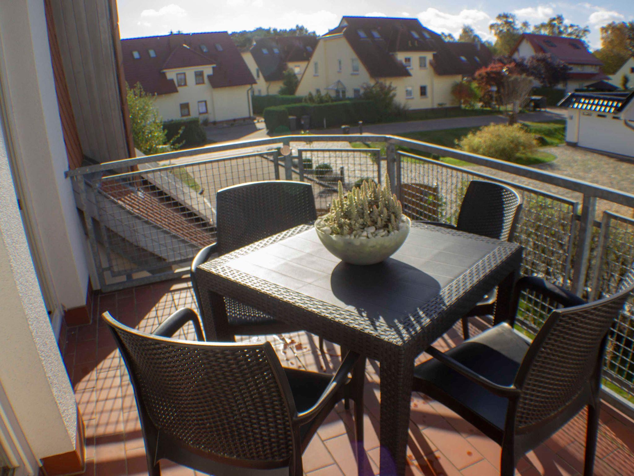 Auf dem Balkon sind Sitzmöbel und Tisch vorhanden.
