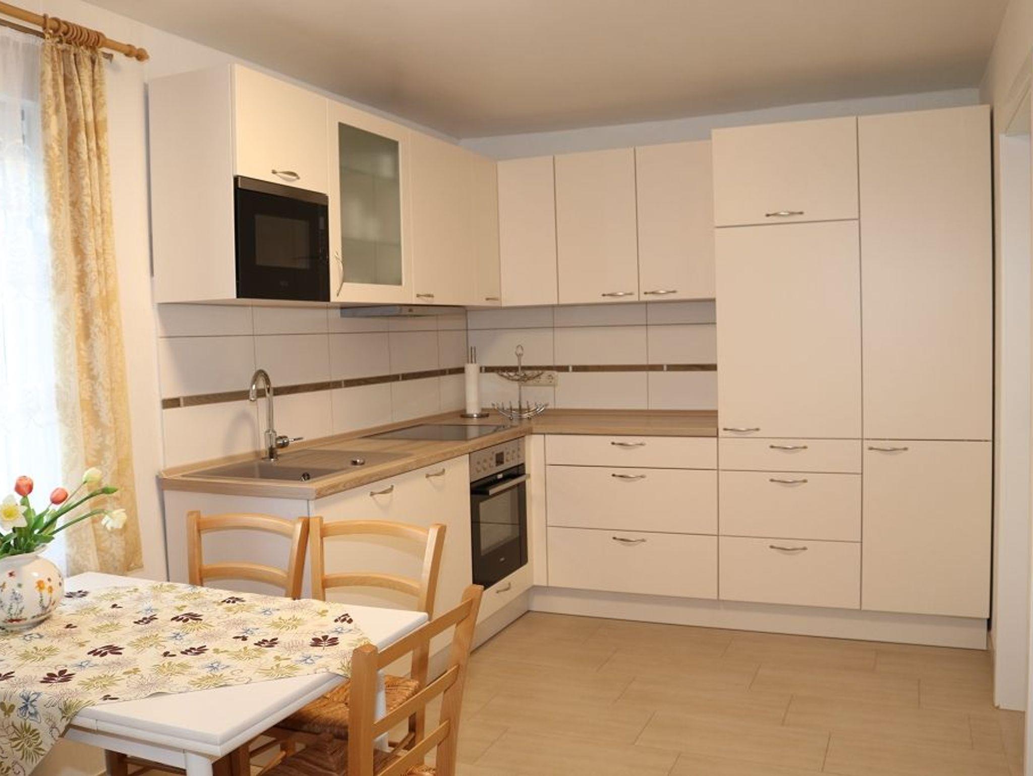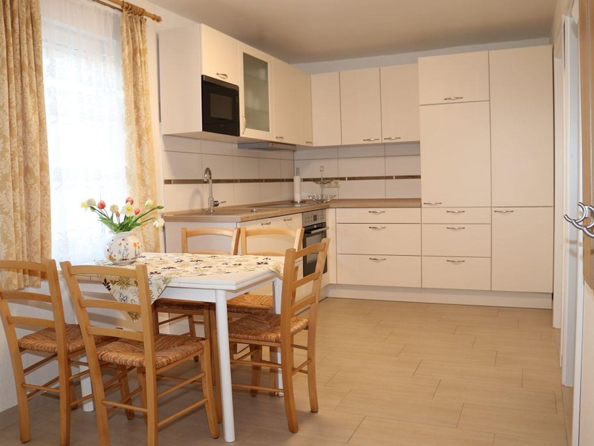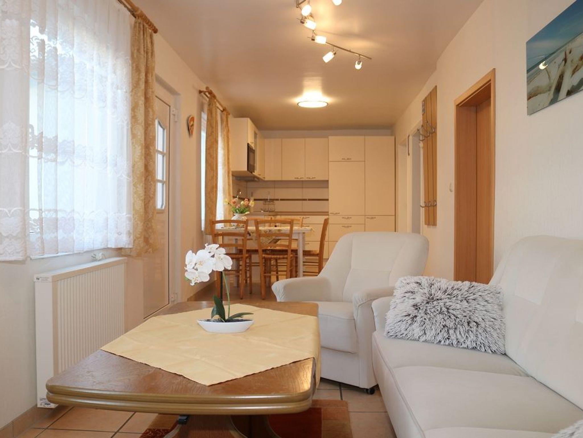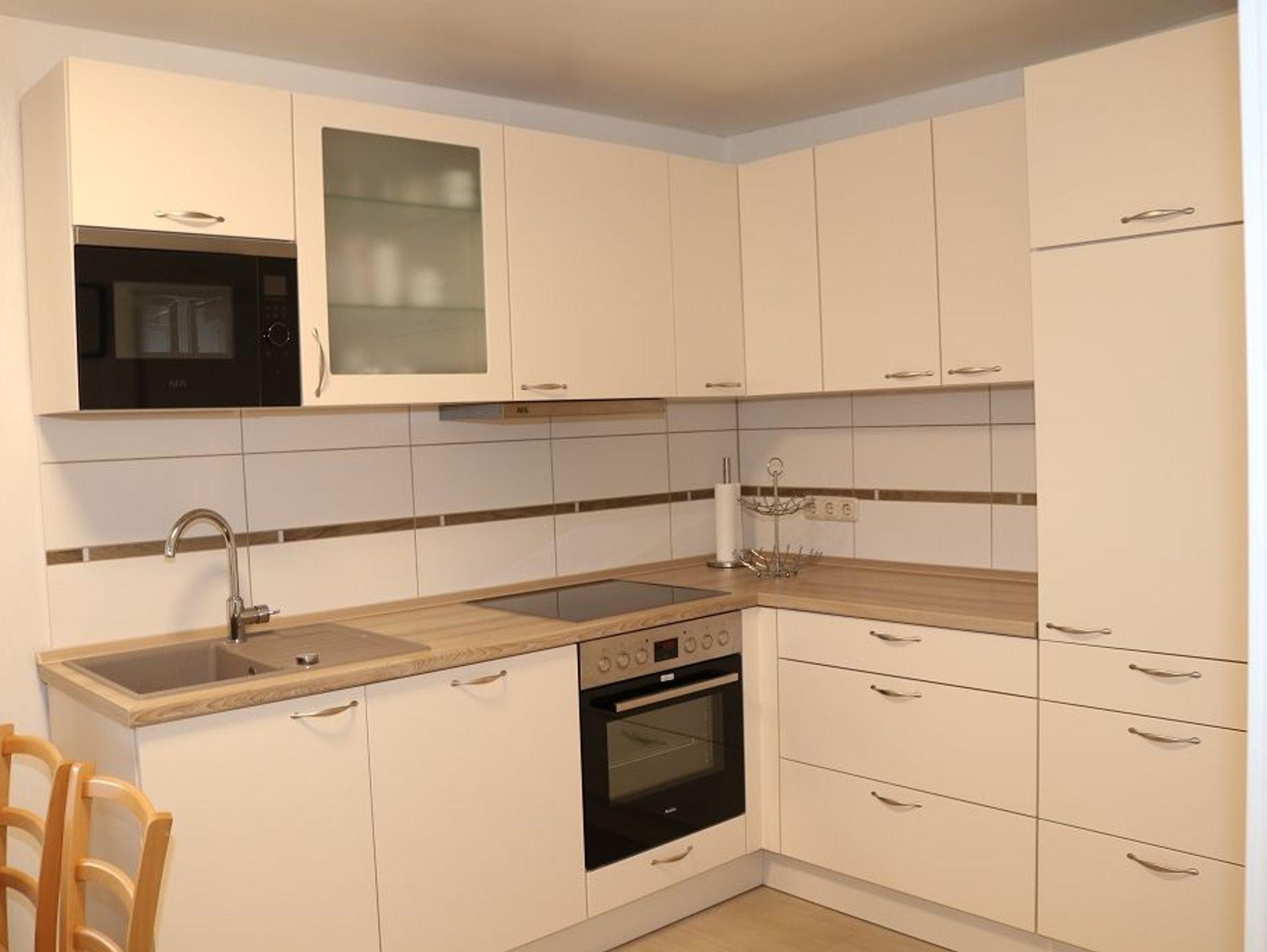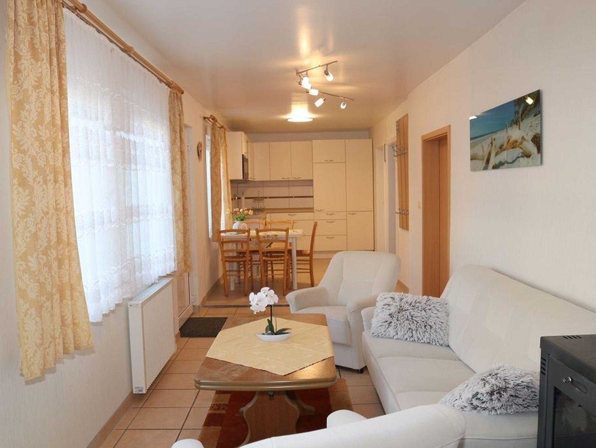Im Raum ist eine Einbauküche in L Form gestellt ,Tisch und Stühle fügen sich harmonisch ein. Die Einbauküche hat einen Herd mit Cerankochfeld und eine Kühlkombination und Geschirrspüler. Es steht eine Mikrowelle, Toaster, Wasserkocher und Kaffeemaschine zur Verfügung. Der offene Wohnraum ist ausgestattet mit einer Couchgarnitur, Tisch und Sat- TV-Flachbildschirm ,Radio.W-Lan -kostenlos.