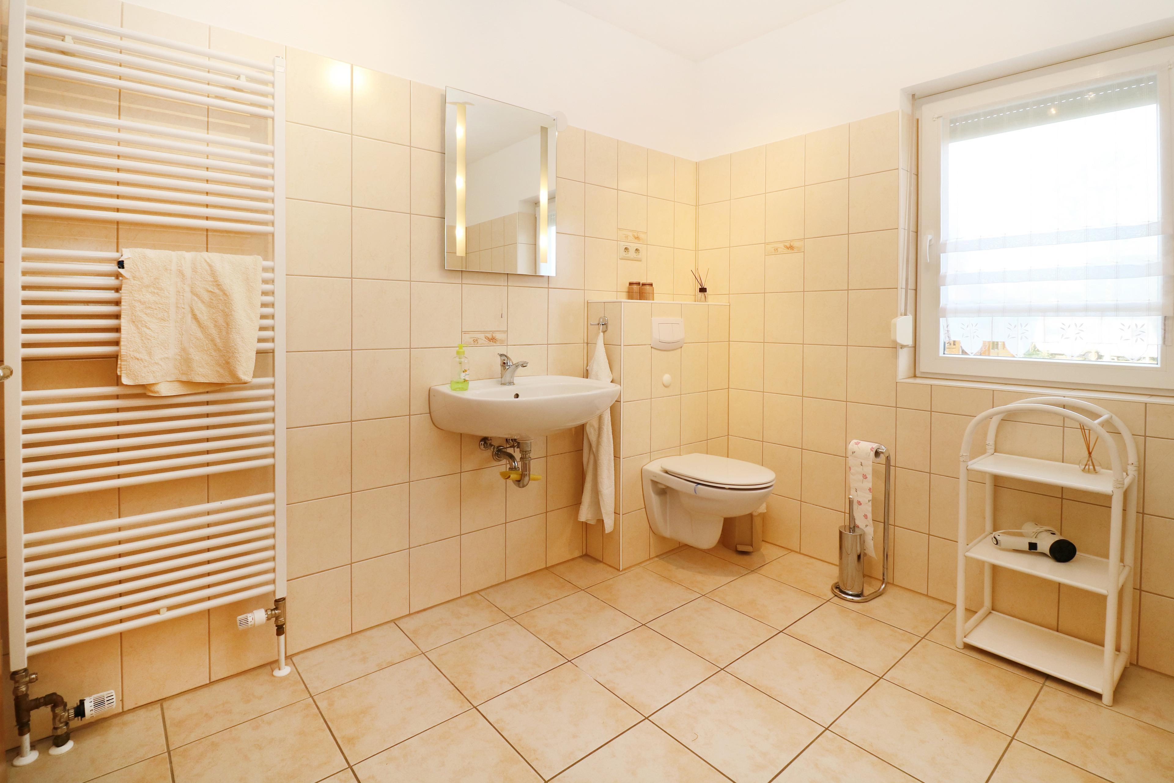 - Komfortabel ausgestattet mit Badewanne, ebenerdiger Dusche, Spiegel, Regal, Handtuchwärmer und WC