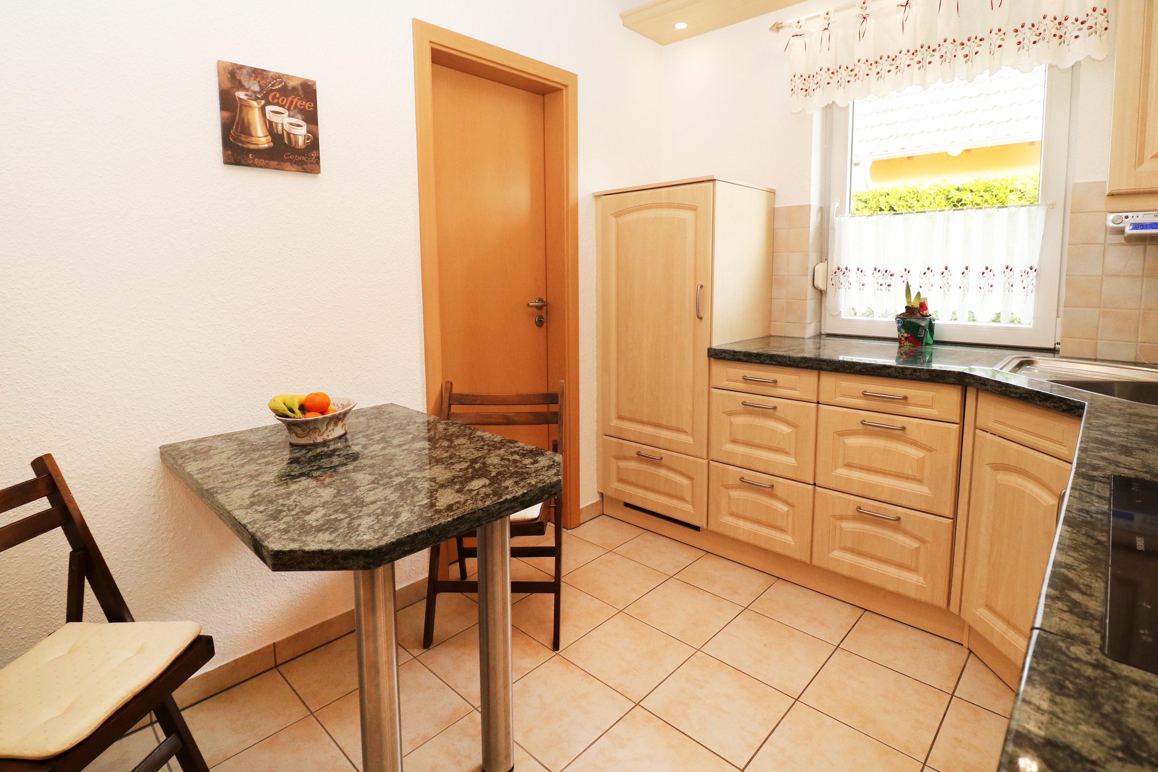 - Backofen, Spülmaschine, Kühlschrank mit Gefrierfach, 4er-Cerankochfeld, Wasserkocher, Toaster und Kaffeemaschine
