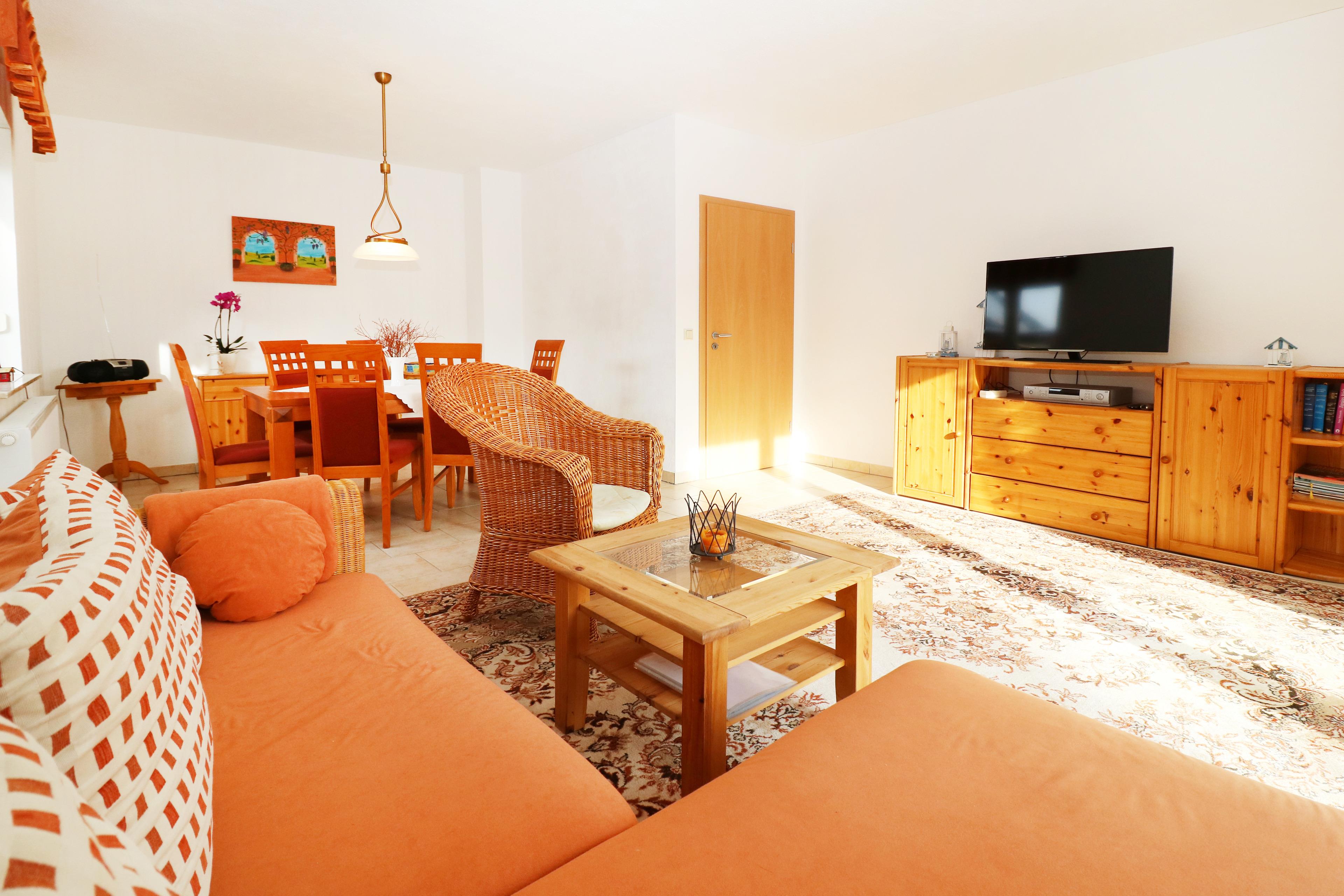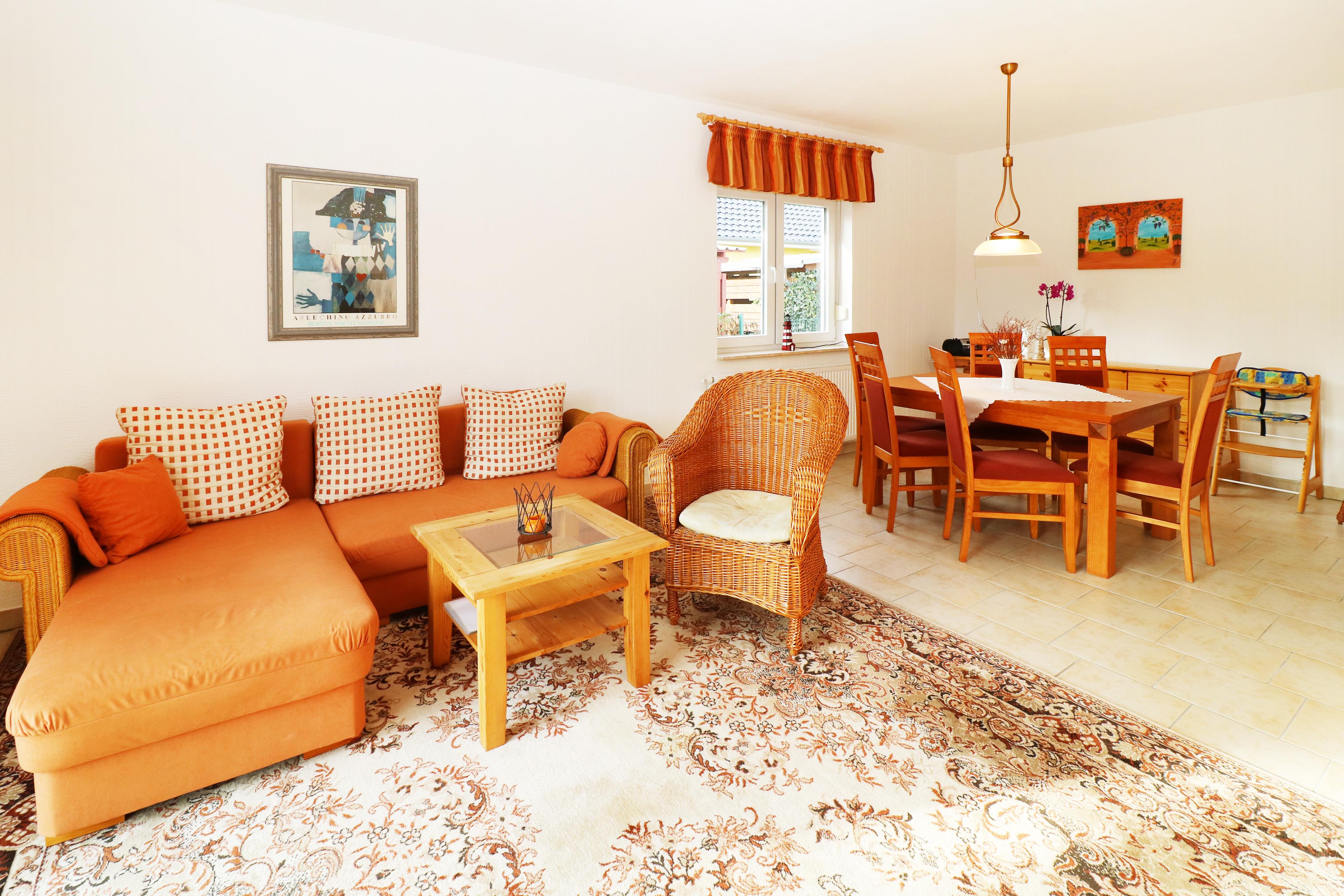 Der großzügige und helle WOHN- und ESSBEREICH ist lichtdurchflutet. Ein gemütliches Sofa und ein Sessel laden zu Abenden in familiärer Runde ein. Für Unterhaltung sorgen Flachbild-TV, Radio, CD-/DVD-Player und WLAN. Das Sofa kann auch als Schlafmöglichkeit für eine Person genutzt werden. Am Esstisch finden bis zu 6 Personen Platz. Ein Hochstuhl ist vorhanden.