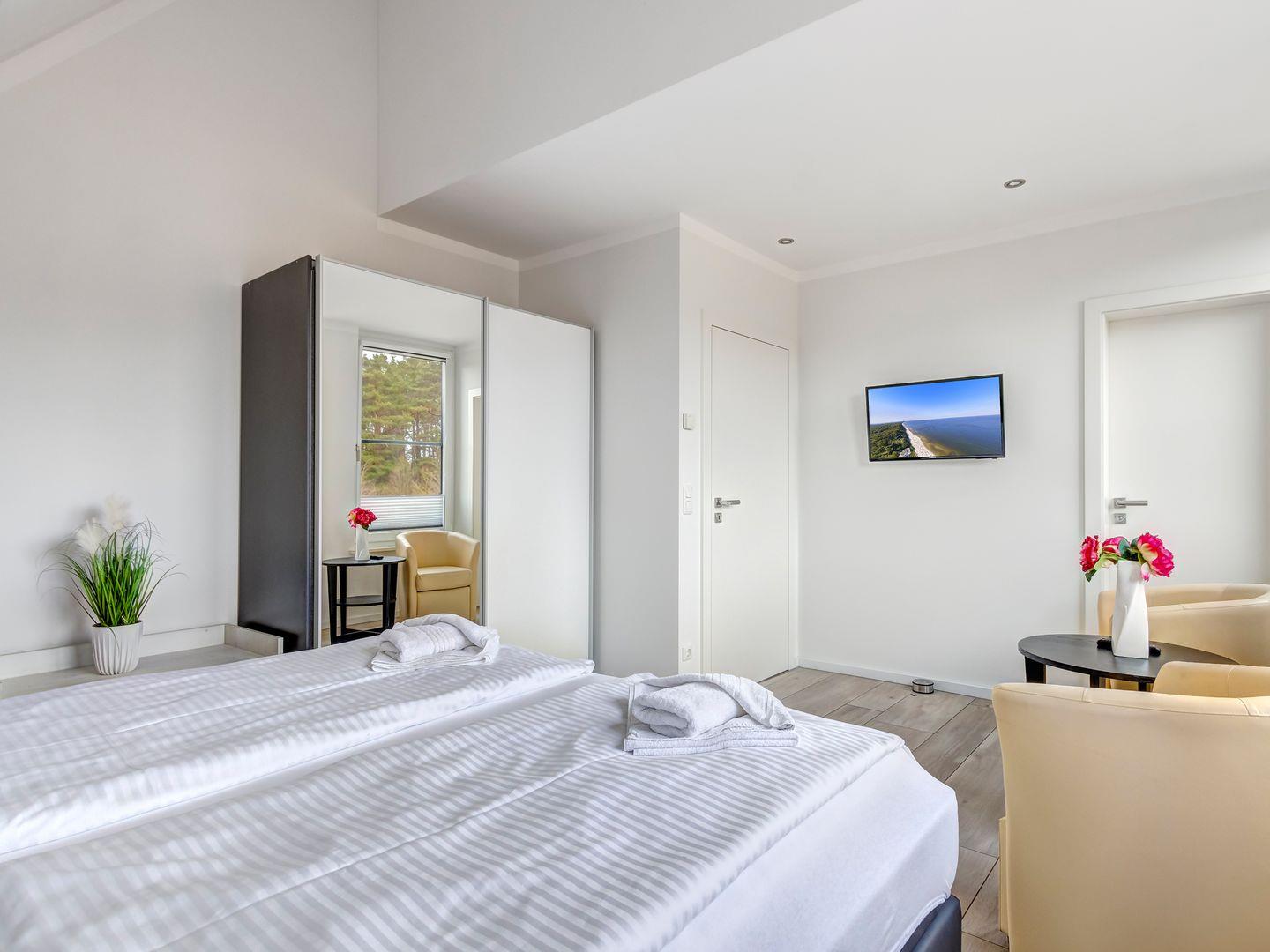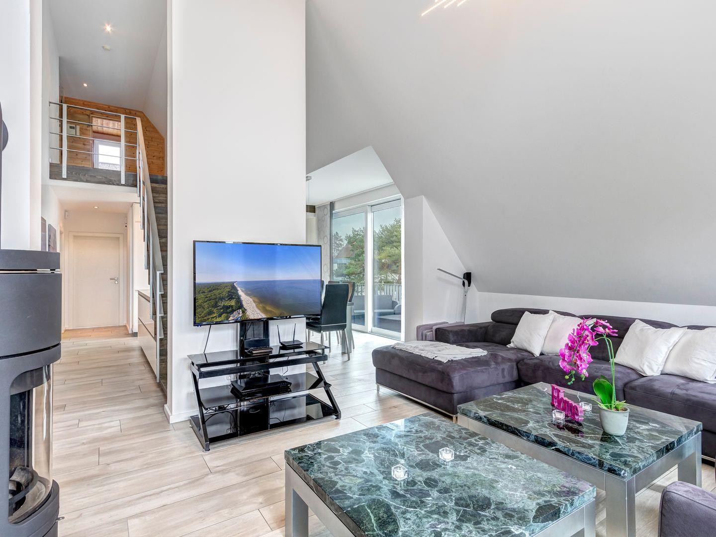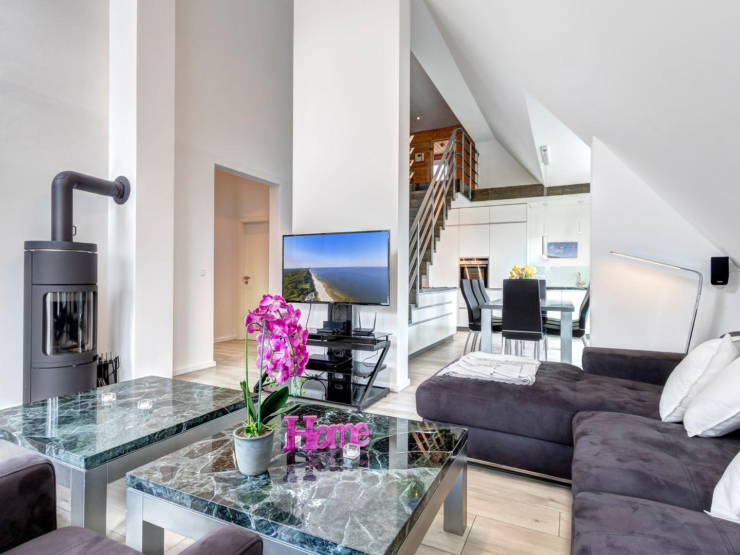 Unser Appartement "ROSA" im Obergeschoss umfasst 150 m² Wohnfläche und bietet drei Schlafzimmer mit modernster Unterhaltungstechnik und exquisiten Boxspringbetten, zwei Bäder, einen Wohn- und Küchenbereich mit Kamin sowie einen Wellnessbereich mit Sauna zur Eigennutzung. Ideal für Familien und Reisegruppen von bis zu 6 Personen. Von der Terrasse im Obergeschoss aus genießen Sie einen herrlichen Ausblick auf die umliegende Natur und können bei einem abendlichen Glas Wein die würzige Ostseeluft genießen.
