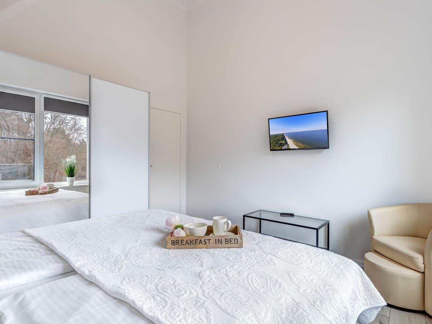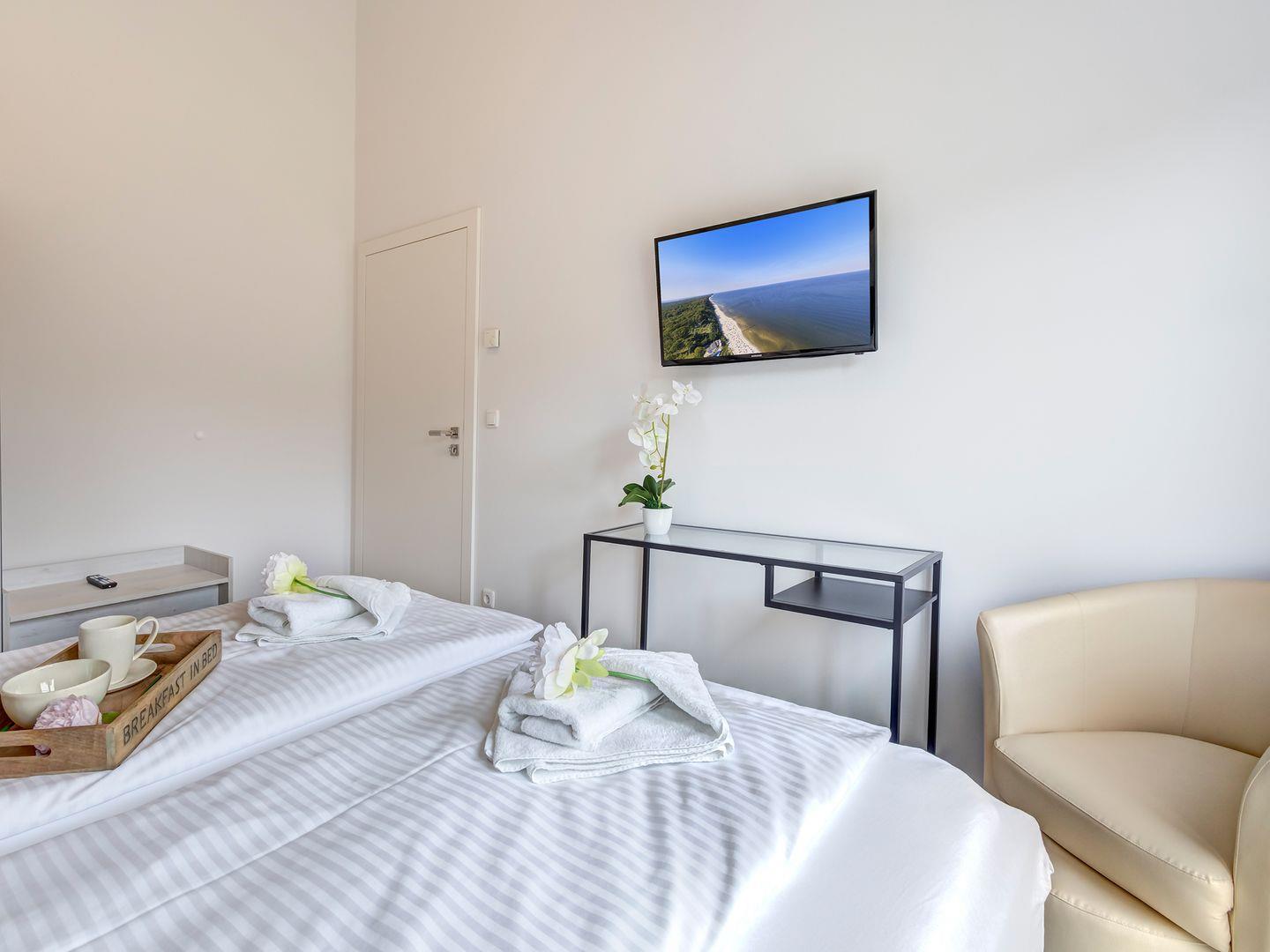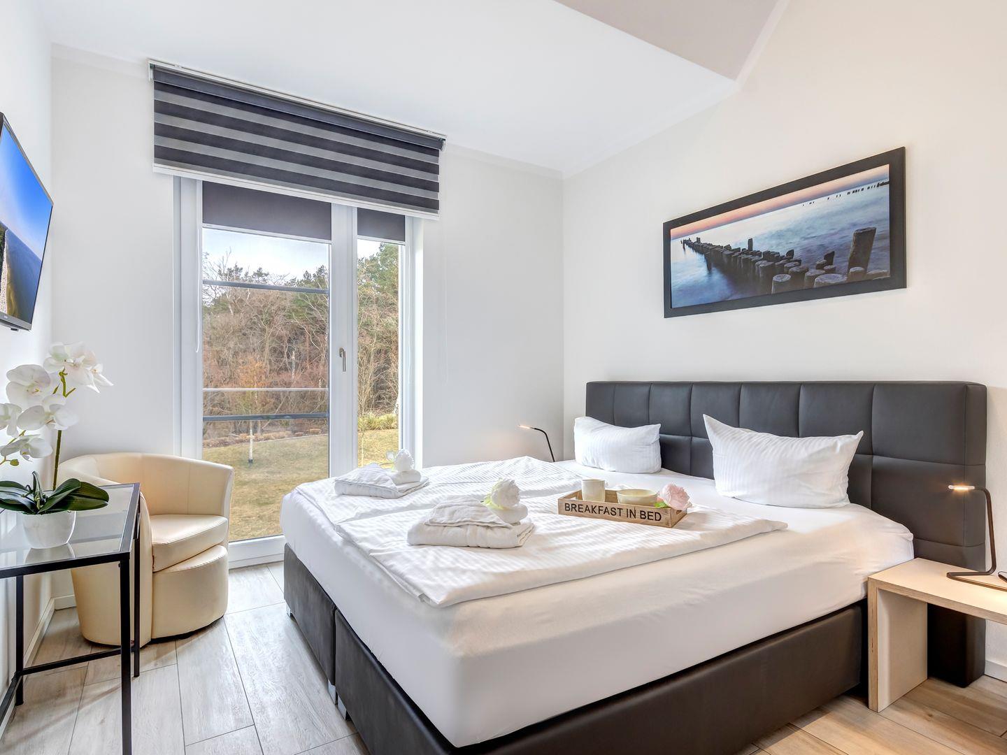 Unser Appartement "ROSA" im Obergeschoss umfasst 150 m² Wohnfläche und bietet drei Schlafzimmer mit modernster Unterhaltungstechnik und exquisiten Boxspringbetten, zwei Bäder, einen Wohn- und Küchenbereich mit Kamin sowie einen Wellnessbereich mit Sauna zur Eigennutzung. Ideal für Familien und Reisegruppen von bis zu 6 Personen. Von der Terrasse im Obergeschoss aus genießen Sie einen herrlichen Ausblick auf die umliegende Natur und können bei einem abendlichen Glas Wein die würzige Ostseeluft genießen.