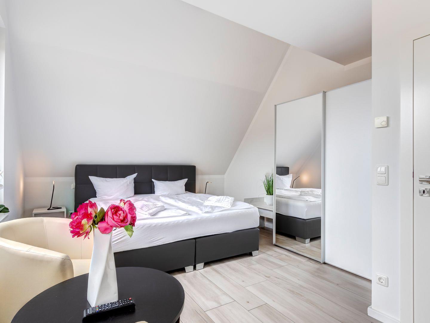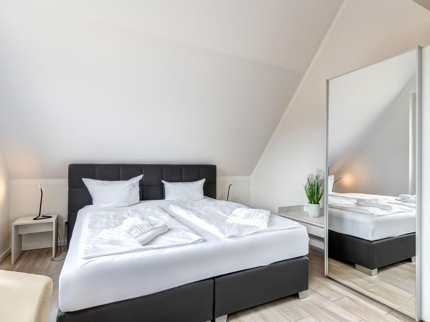 Unser Appartement "ROSA" im Obergeschoss umfasst 150 m² Wohnfläche und bietet drei Schlafzimmer mit exquisiten Boxspringbetten, zwei Bäder, einen Wohn- und Küchenbereich mit Kamin sowie einen Wellnessbereich mit Sauna zur Eigennutzung.