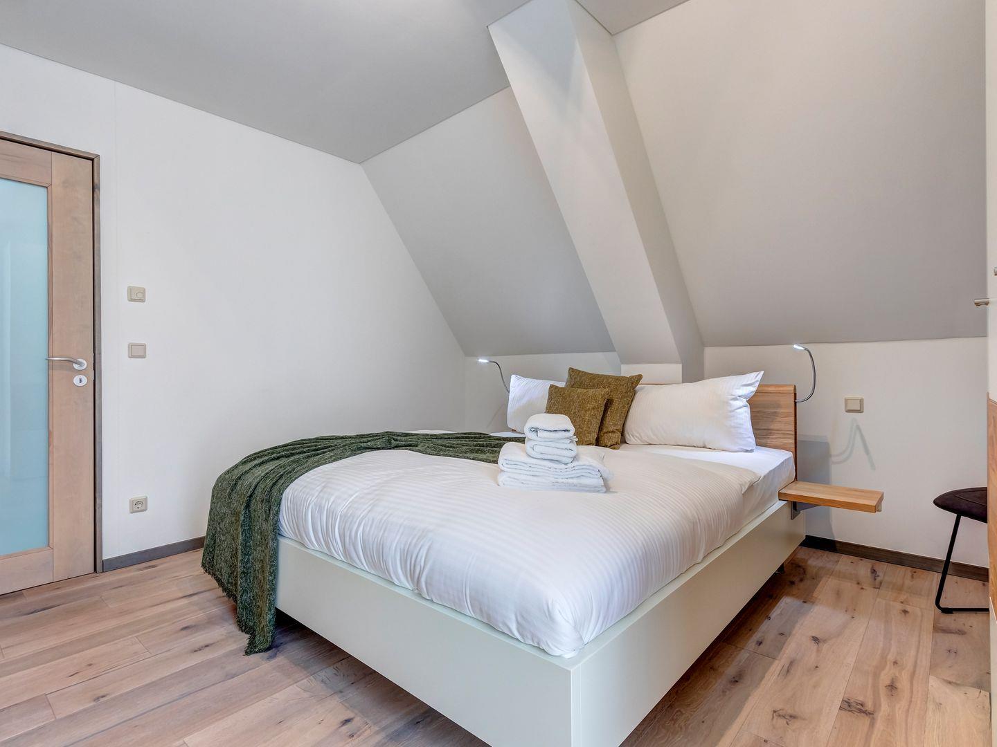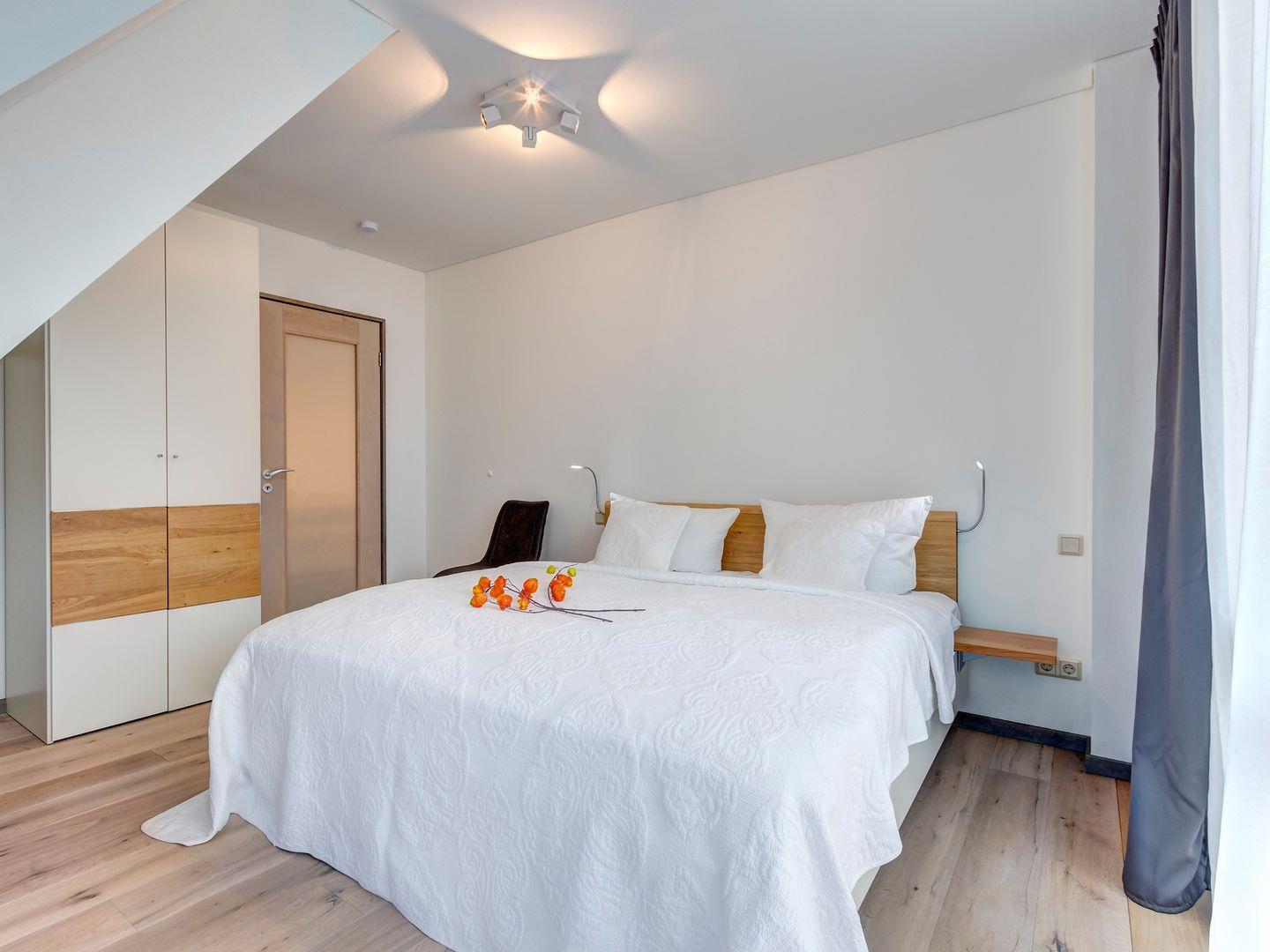Im 1. Obergeschoss stehen Ihnen drei hochwertig eingerichtete Schlafzimmer mit jeweils einem Doppelbett zur Verfügung. Das große, lichtdurchflutete Erkerschlafzimmer mit seiner Fensterfront ist dabei besonders hervorzuheben. Zwei der Schlafzimmer sind zudem mit einem eigenen TV ausgestattet. Das "Familienbad" im 1. Obergeschoss bietet eine freistehende Badewanne und eine ebenerdige begehbare Dusche für entspannte Momente.