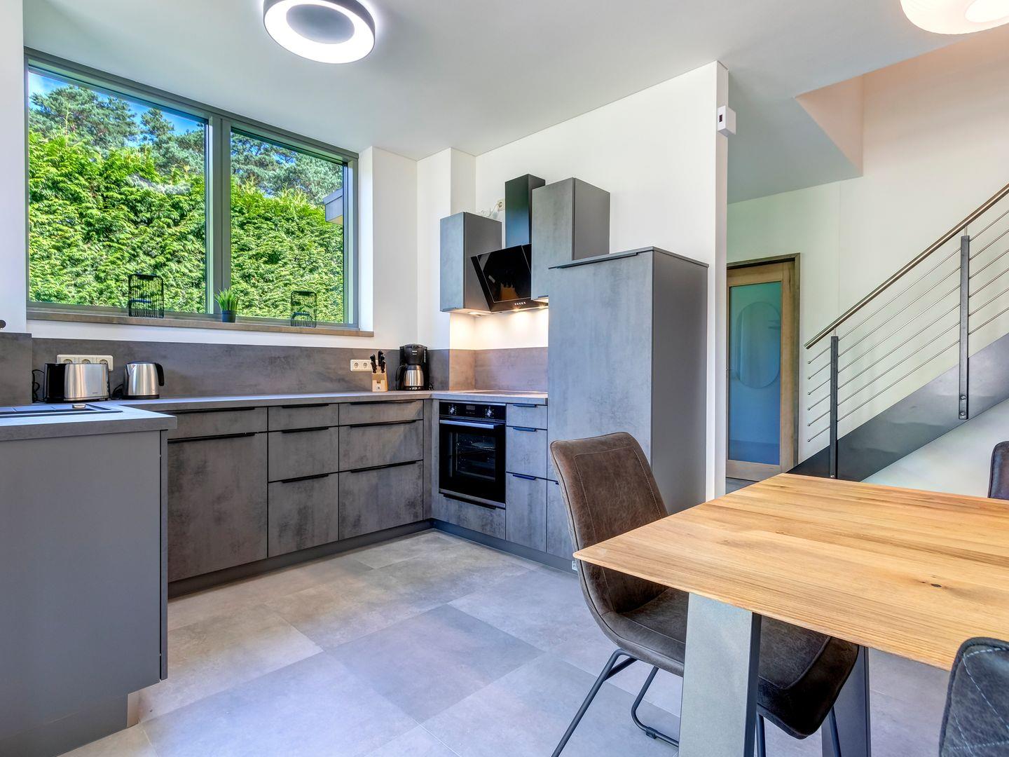 Im Erdgeschoss erwartet Sie ein großer offener Raum mit einer komplett ausgestatteten Küche inklusive Essplatz und einem Wohnzimmer mit einem beeindruckenden Smart TV. Bodentiefe Fenster sorgen für ausreichend Licht und bieten einen malerischen Blick auf den Garten und den angrenzenden Wald. Ein Gästebad mit moderner Dusche komplettiert das Angebot im Erdgeschoss.