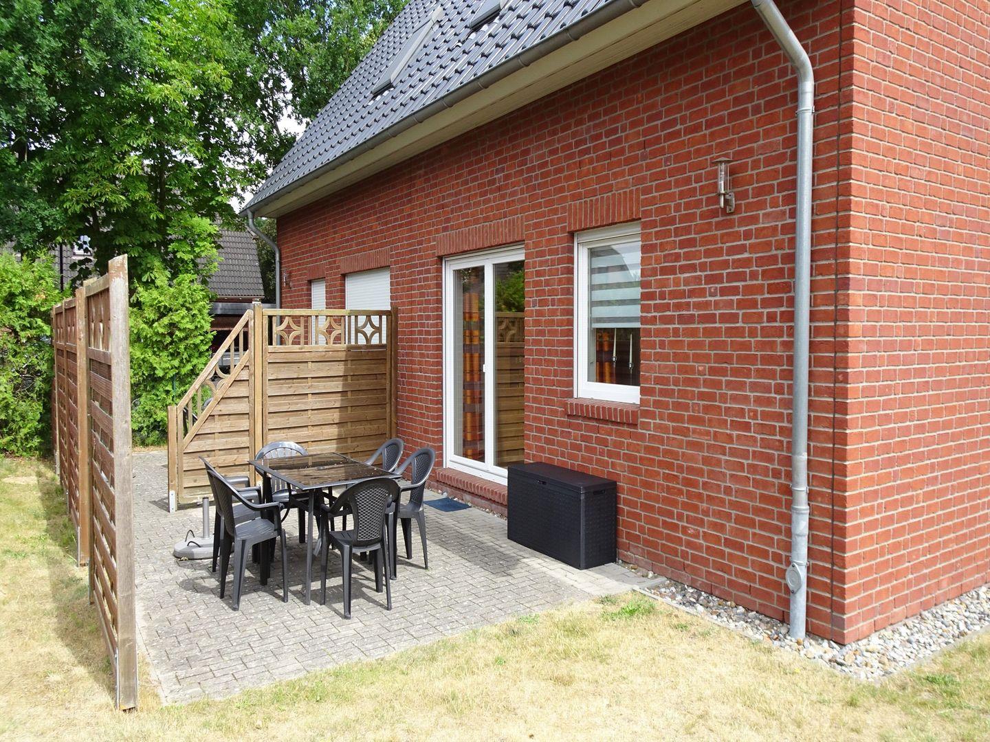 Die Terrasse ist ein weiterer Pluspunkt des Hauses. Sie ist durch einen Sichtschutz abgegrenzt und mit Terrassenmöbeln für bis zu sechs Personen sowie einem Sonnenschirm ausgestattet.