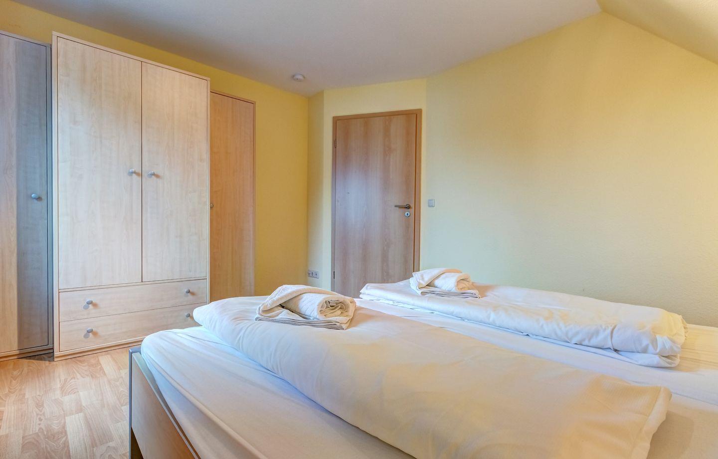 - **Schlafzimmer 1** bietet ein Doppelbett, in dem zusätzlich ein Kinderreisebett Platz findet, sowie einen Kleiderschrank.