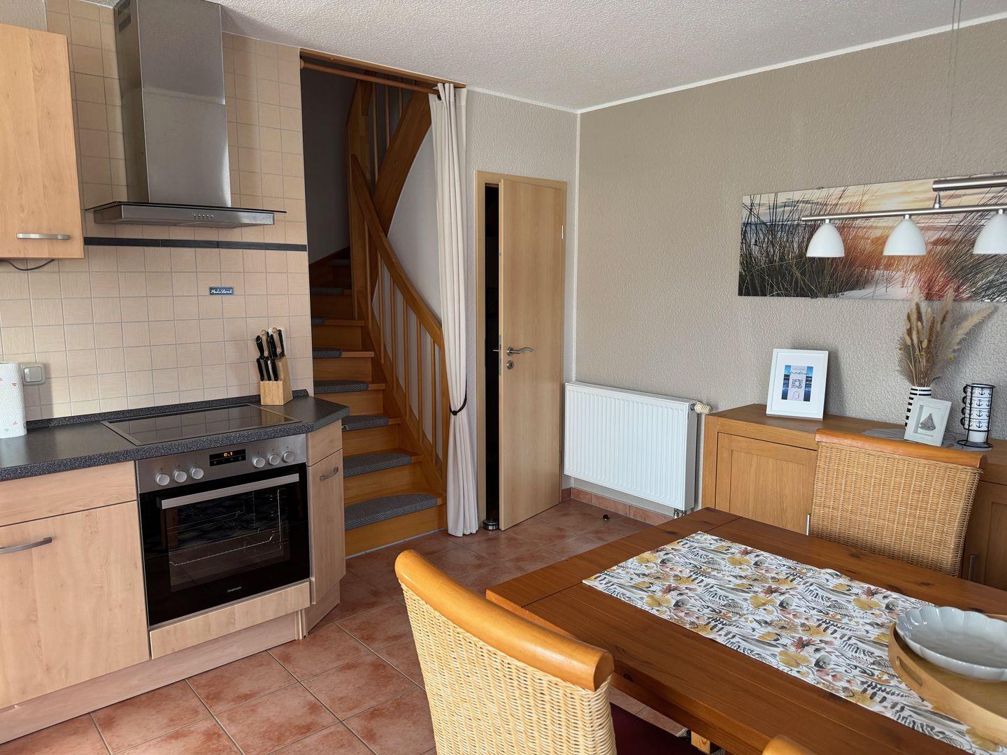 EG: Küche mit Esstisch, Kühlschrank mit Gefrierfach, Cerankochfeld, Kaffeemaschine