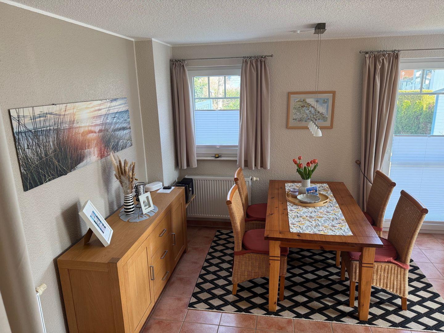 Die geschlossene Küche ist komplett ausgestattet und lässt keine Wünsche offen. Neben einem Herd mit Ceran-Kochfeld und einem Elektro-Backofen erwarten Sie eine Spülmaschine, ein Kühlschrank, eine Kaffeemaschine sowie zahlreiche Küchenutensilien, die das Kochen zum Vergnügen machen. Genießen Sie Ihre selbst zubereiteten Mahlzeiten in dem hellen Essbereich oder auf der überdachten Terrasse, die mit Gartenmöbeln und einem Grill ausgestattet ist – ideal für gesellige Abende im Freien!