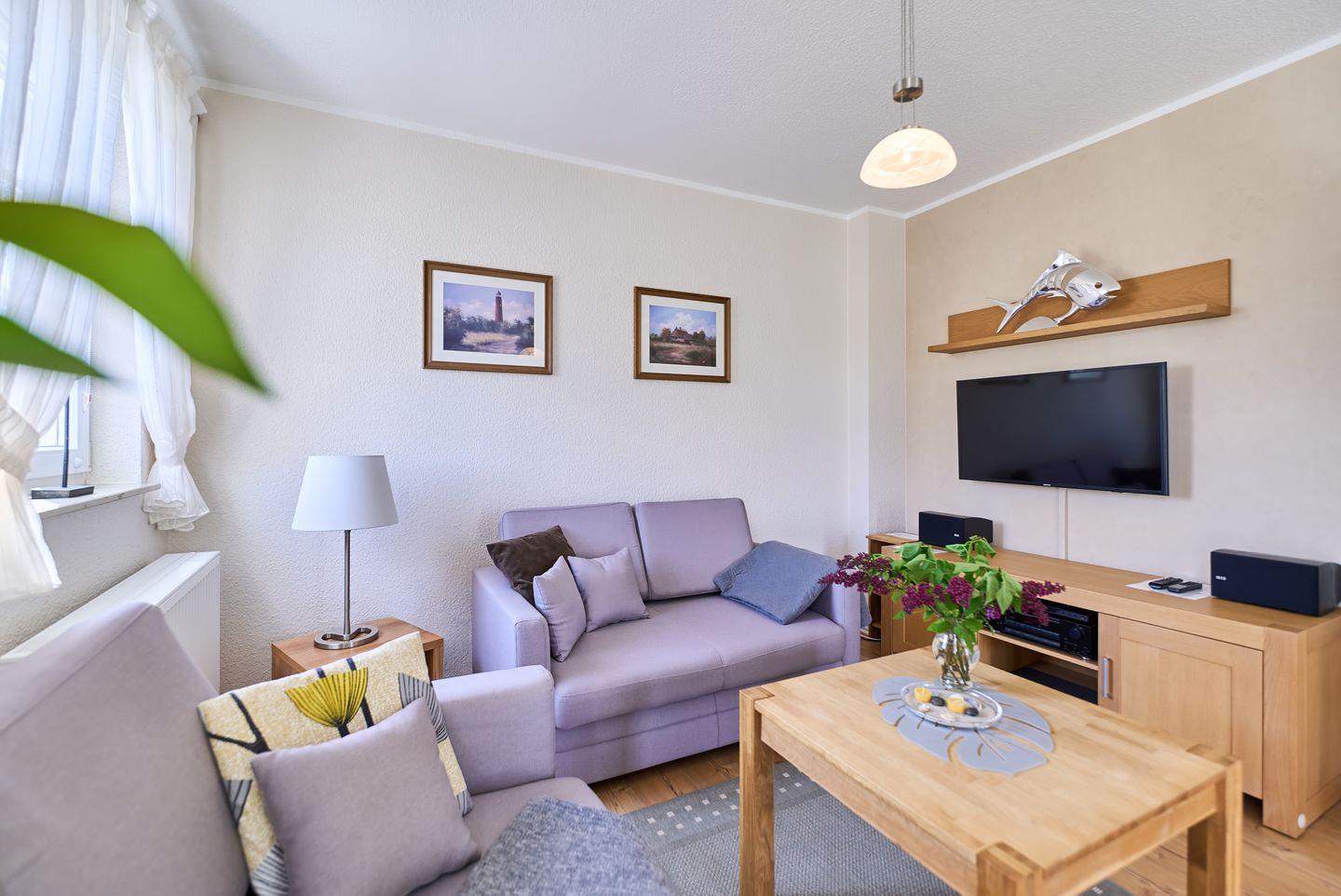 1. OG: Wohnzimmer mit 2 Sofas (zum ausziehen) und Bad mit Dusche/WC
