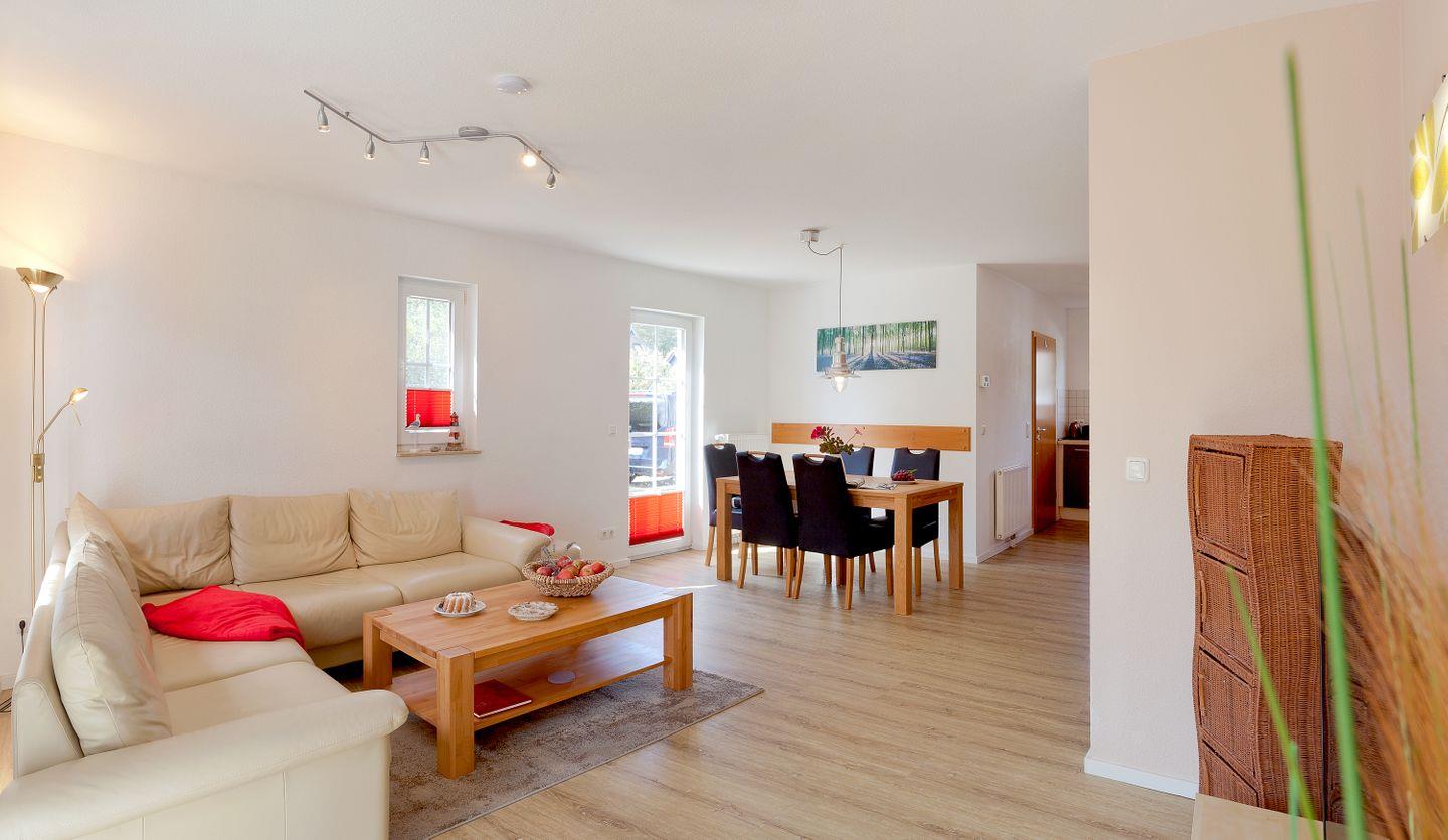 Die großen Fenster und die angenehme Fußbodenheizung schaffen eine einladende Atmosphäre und sorgen dafür, dass Sie sich sofort wie zu Hause fühlen. Durch die Markise und den Sonnenschirm auf der Terrasse können Sie die sonnigen Tage in vollen Zügen genießen. Hier ist der ideale Ort, um mit einem guten Buch oder bei einer Tasse Kaffee zu entspannen. Der abgeschlossene Gartenbereich mit Strandkorb ( April bis Oktober) bietet zudem viel Platz für Kinder zum Spielen und Toben.